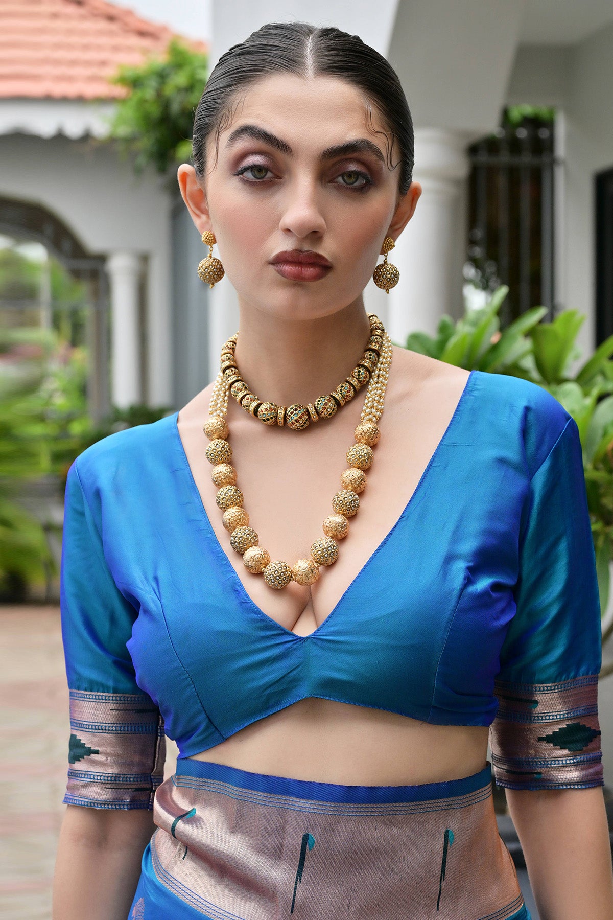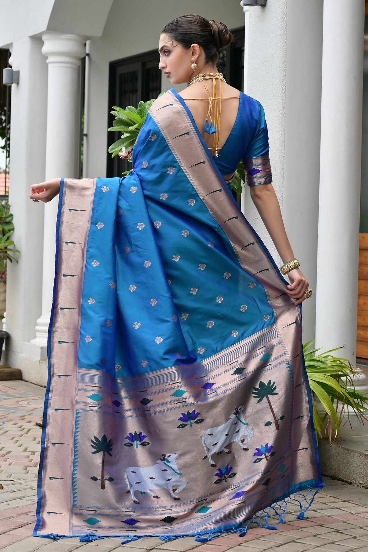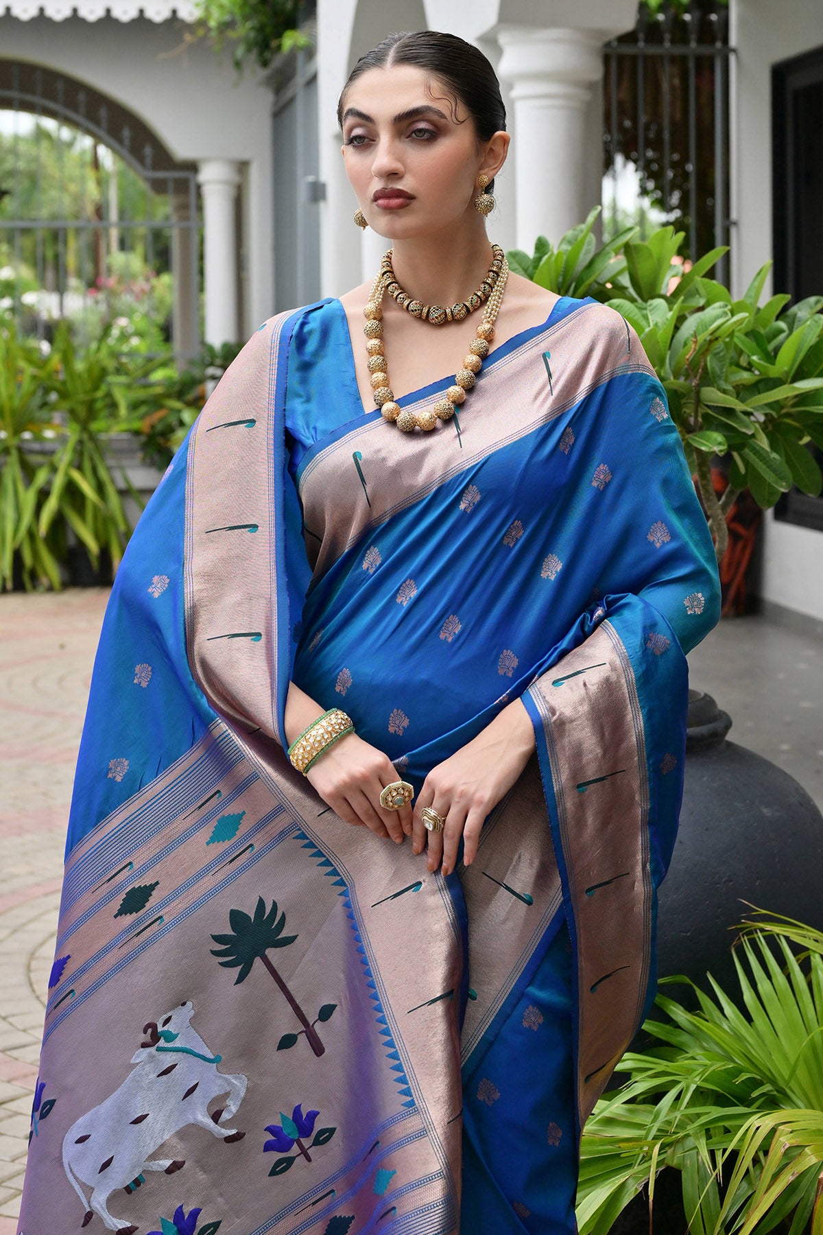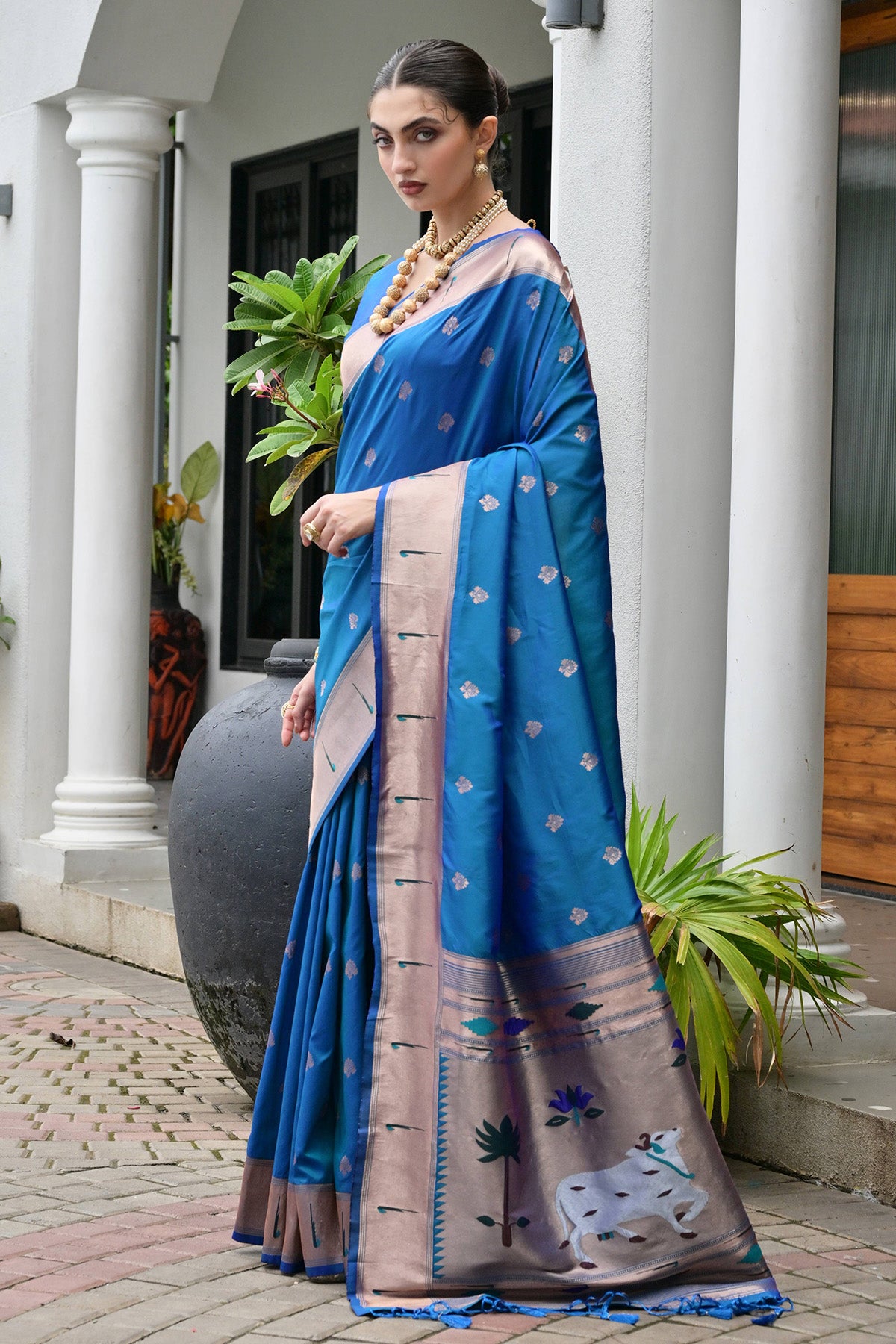 Rama meenakari weaves pichwai pallu with pure zari woven munia border paithani silk saree with unstitched blouse piece