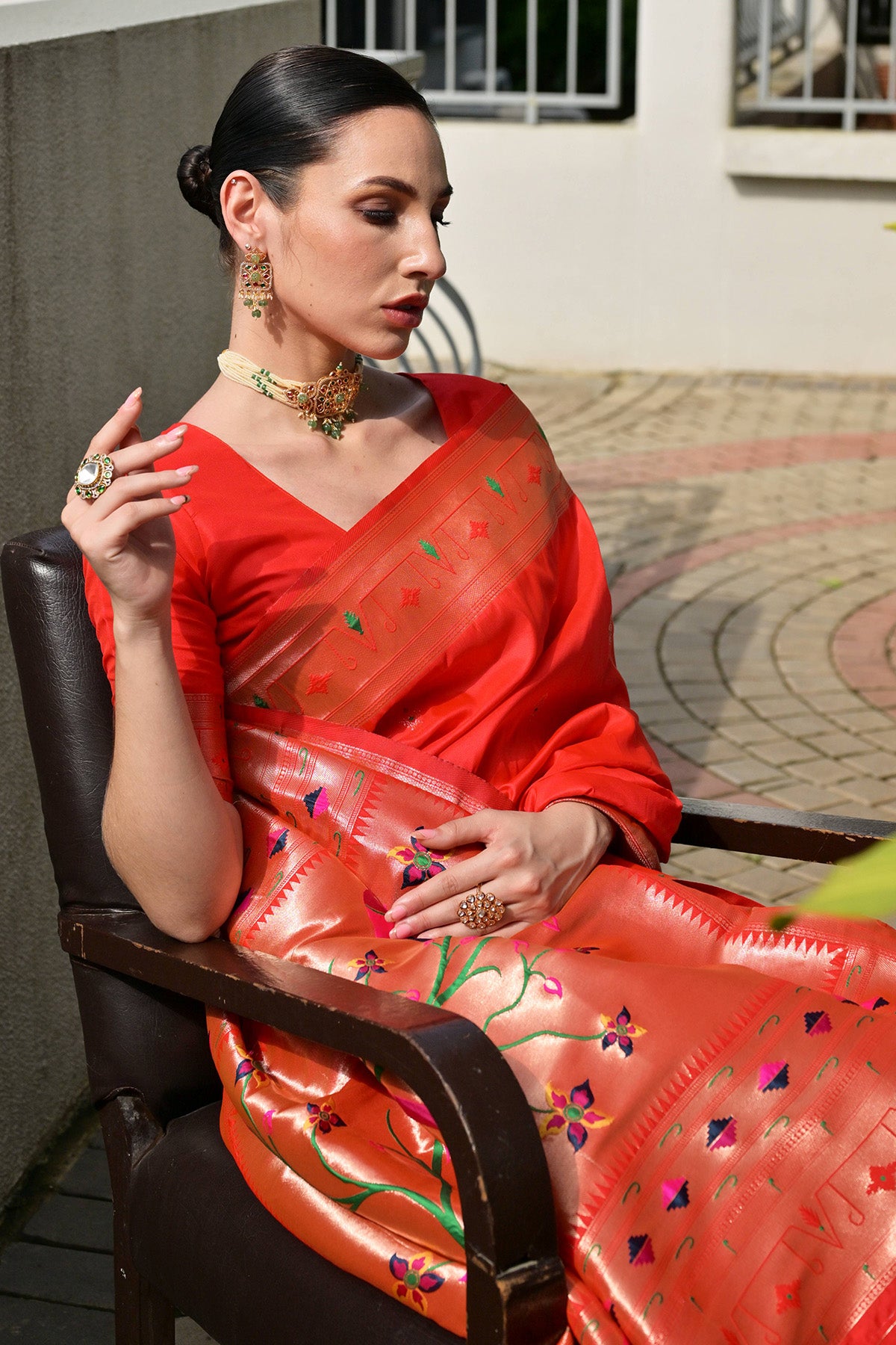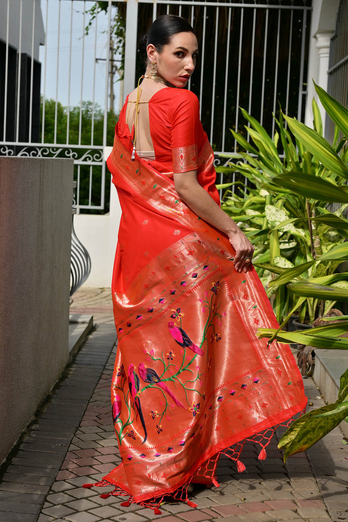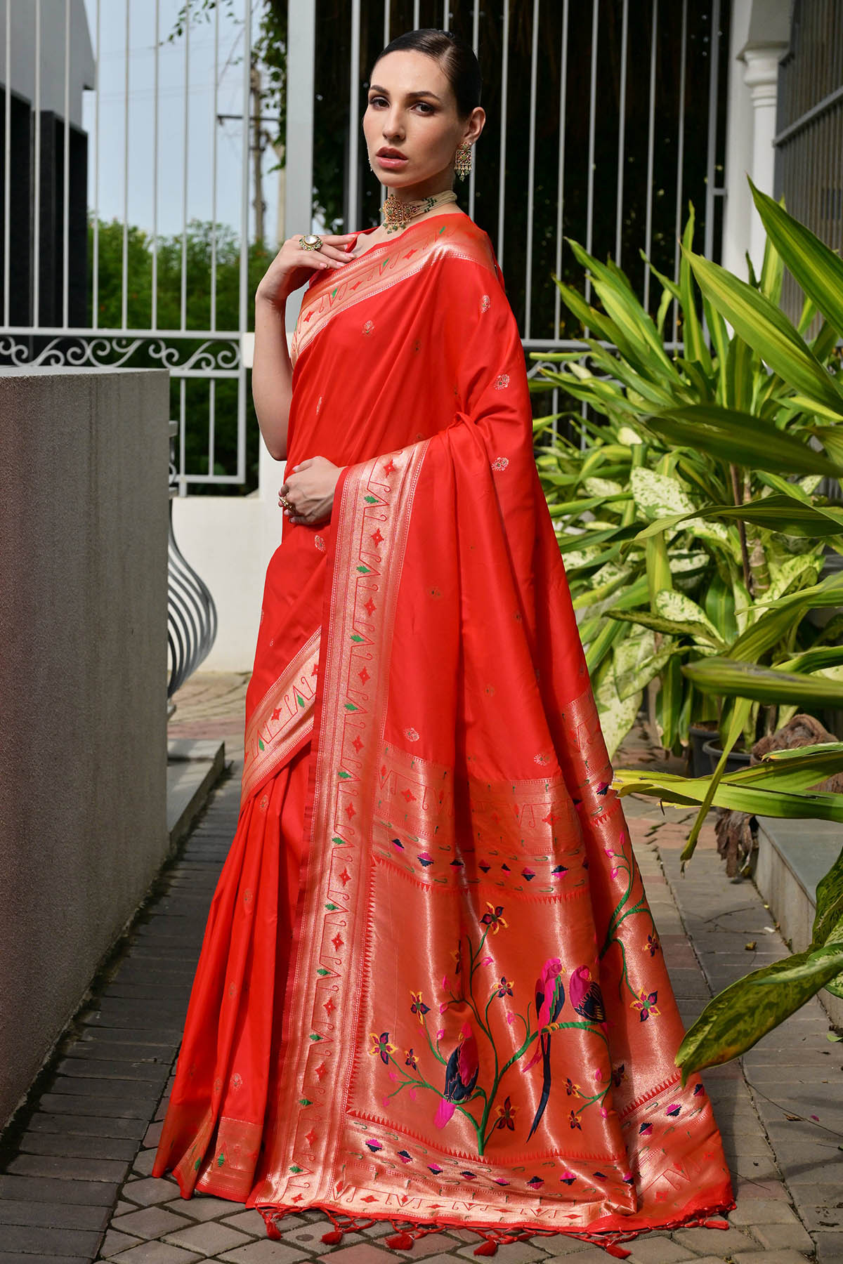 Red meenakari weaves paithani pallu with pure zari woven border paithani silk saree with unstitched blouse piece