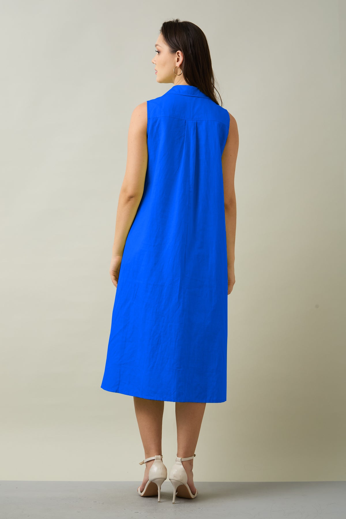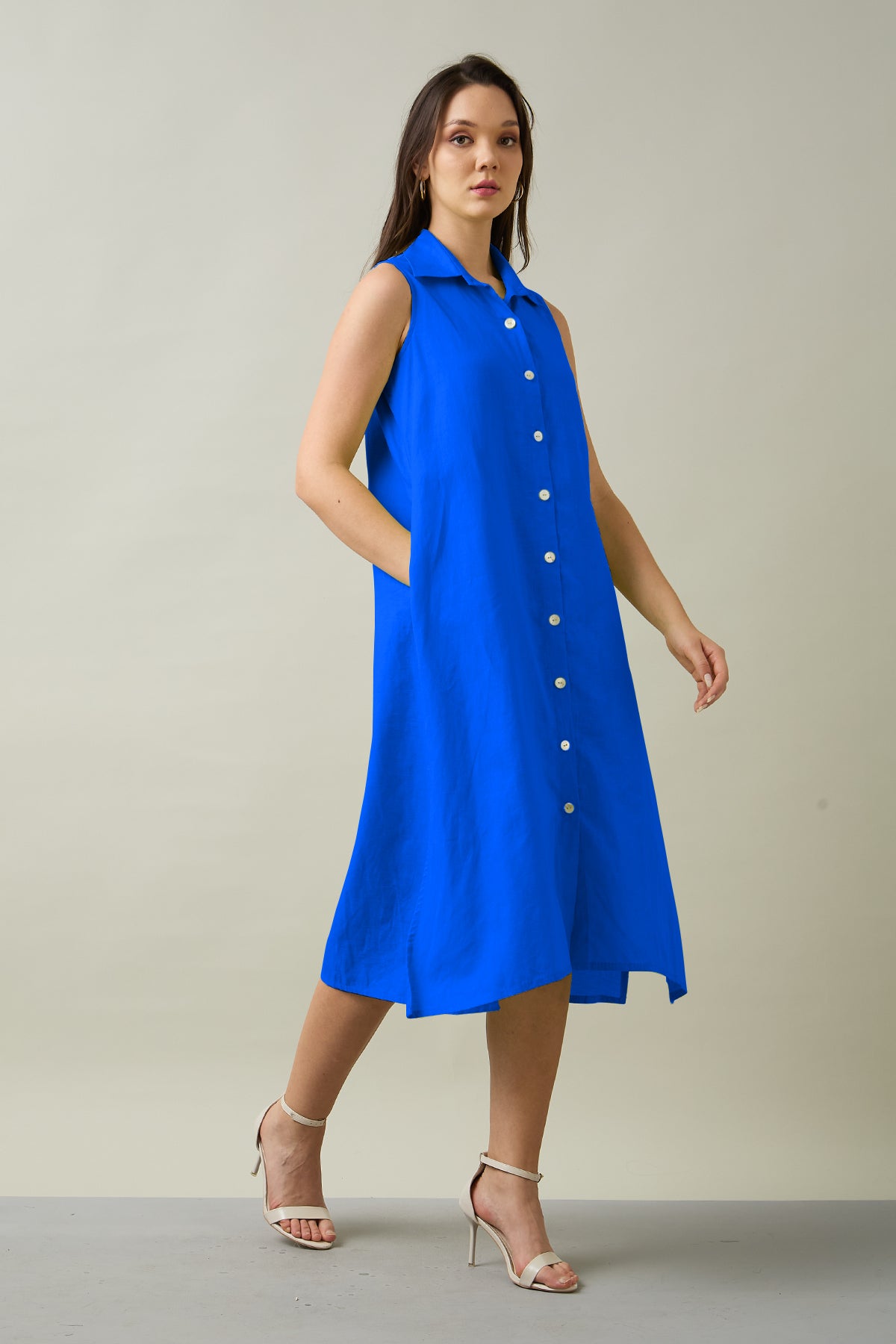 Royal Blue cotton linen sleeveless shirt dress with collar, buttons, side slit, box pleat at back and side pockets. The length of the dress is 44 inches