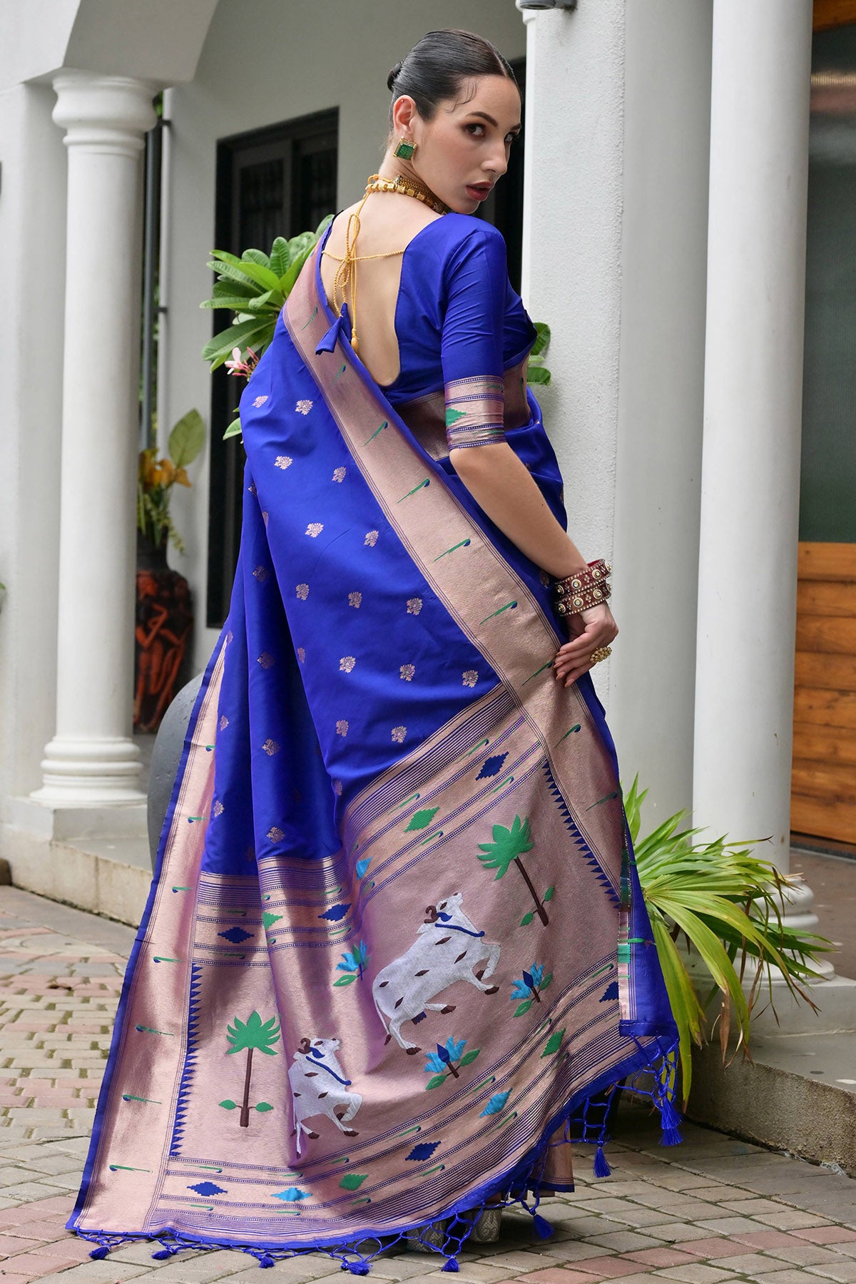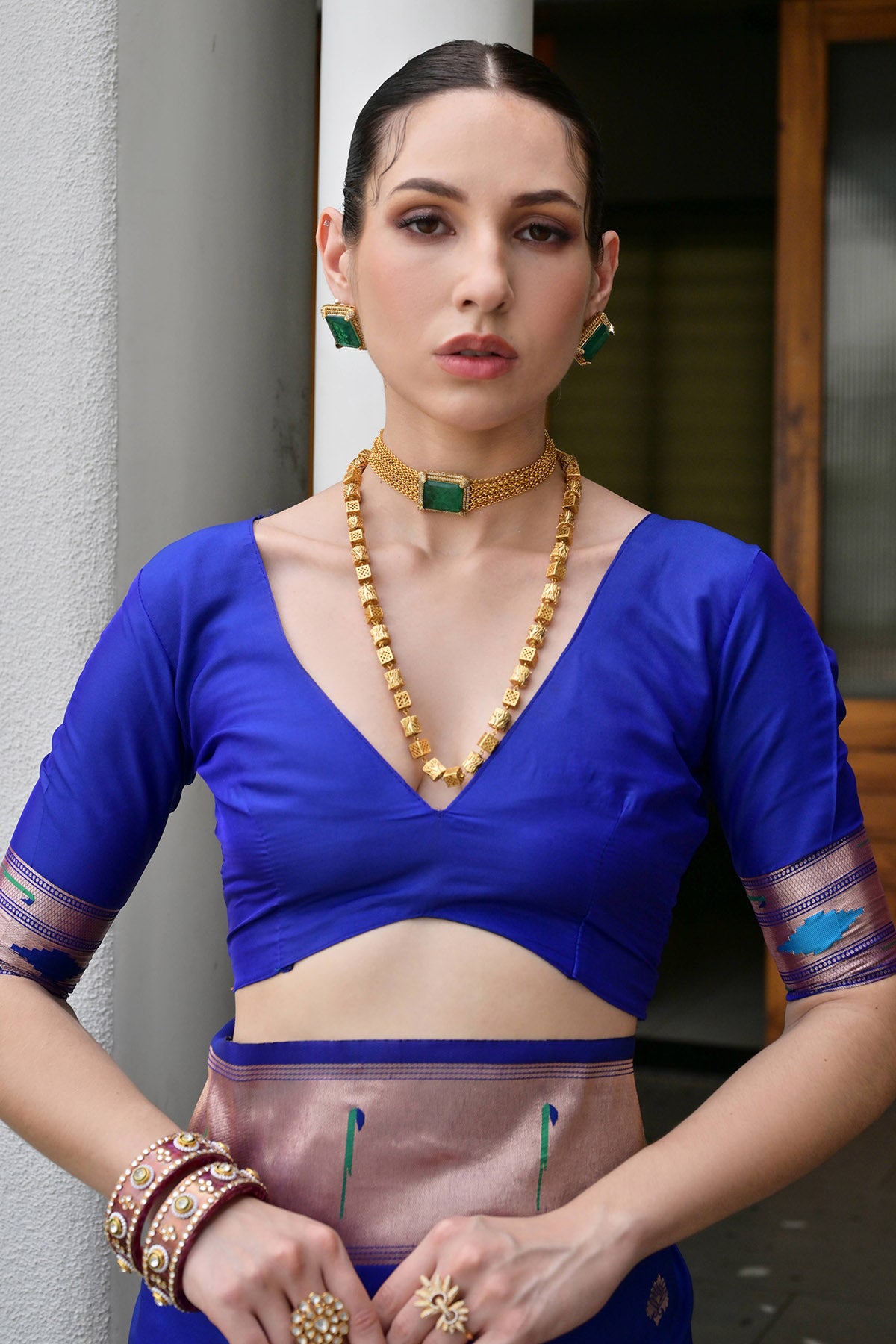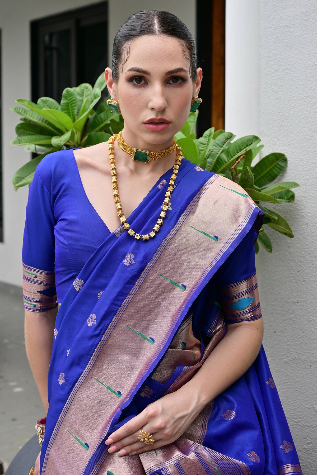 Royal meenakari weaves pichwai pallu with pure zari woven munia border paithani silk saree with unstitched blouse piece
