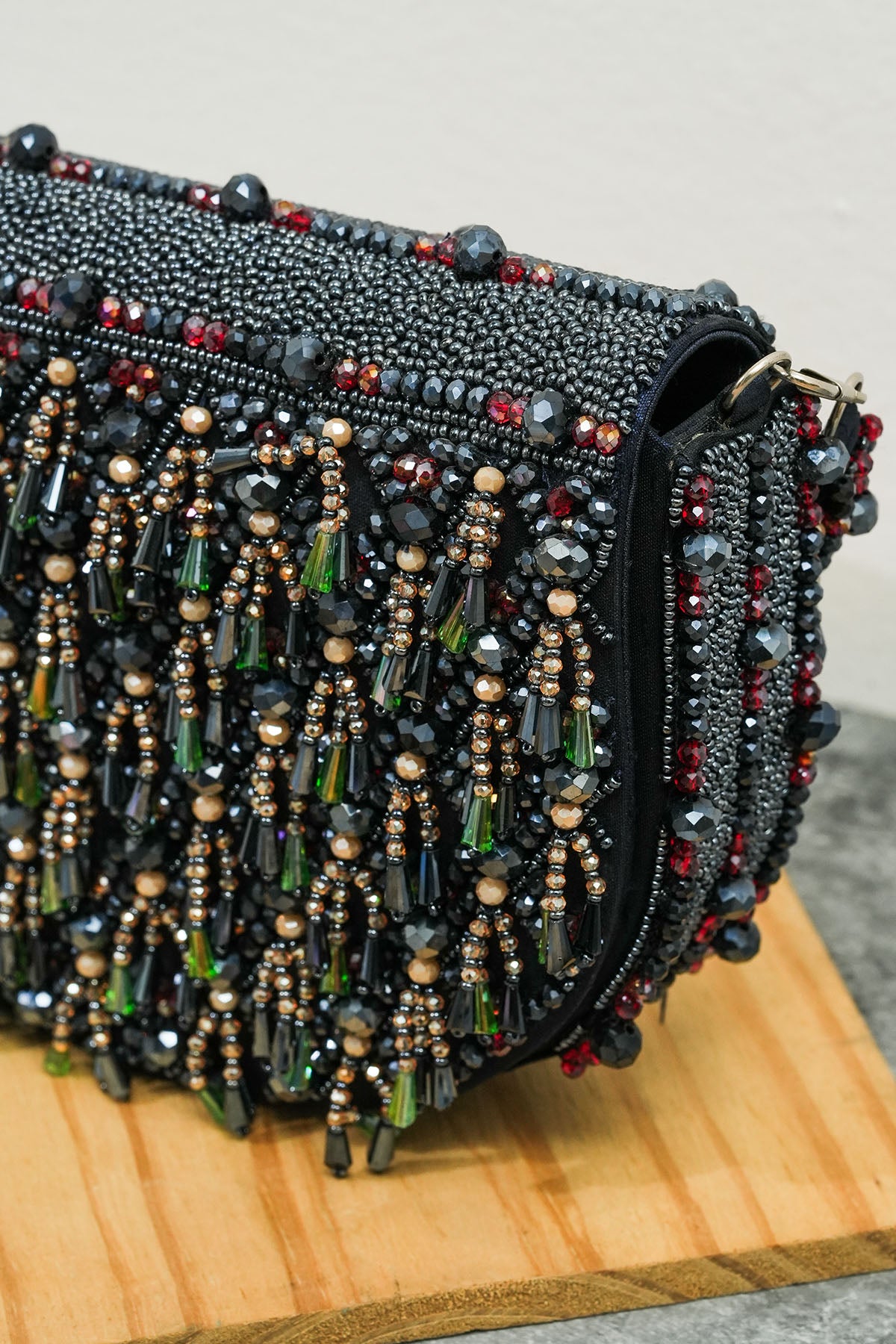 Dark blue raw silk hand crafted clutch with semi circle and pearl work. The dimension is 20x15x4 cm. The weight of clutch is 500 grams