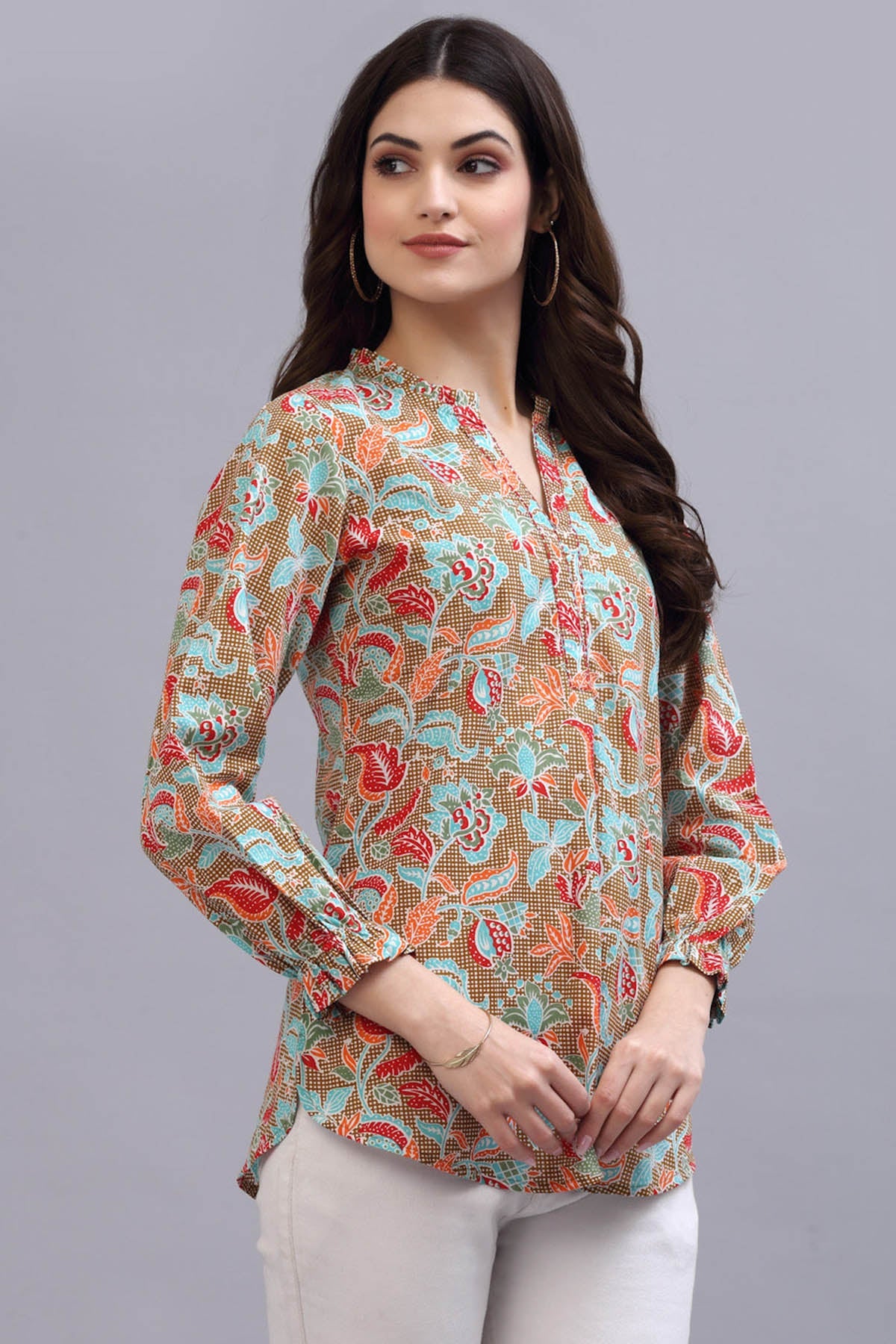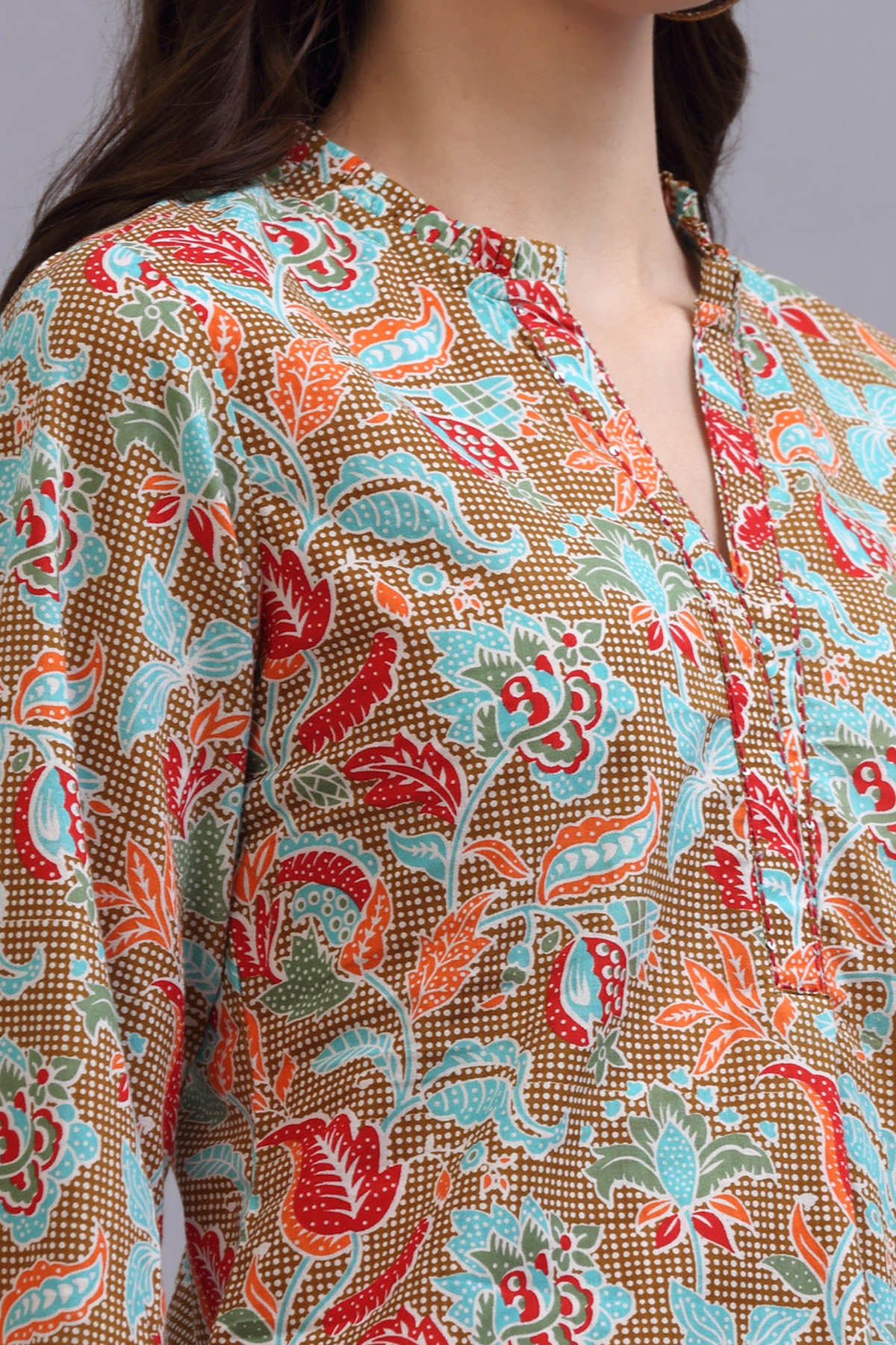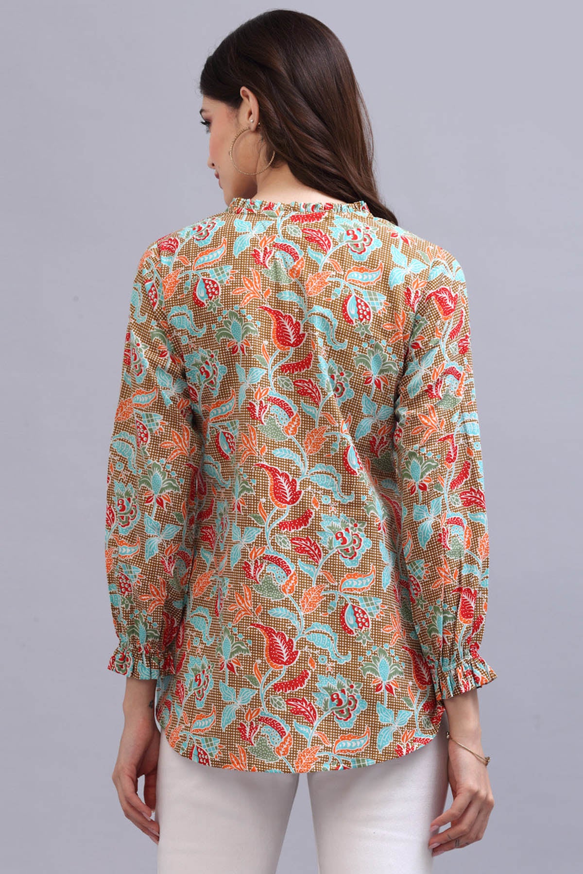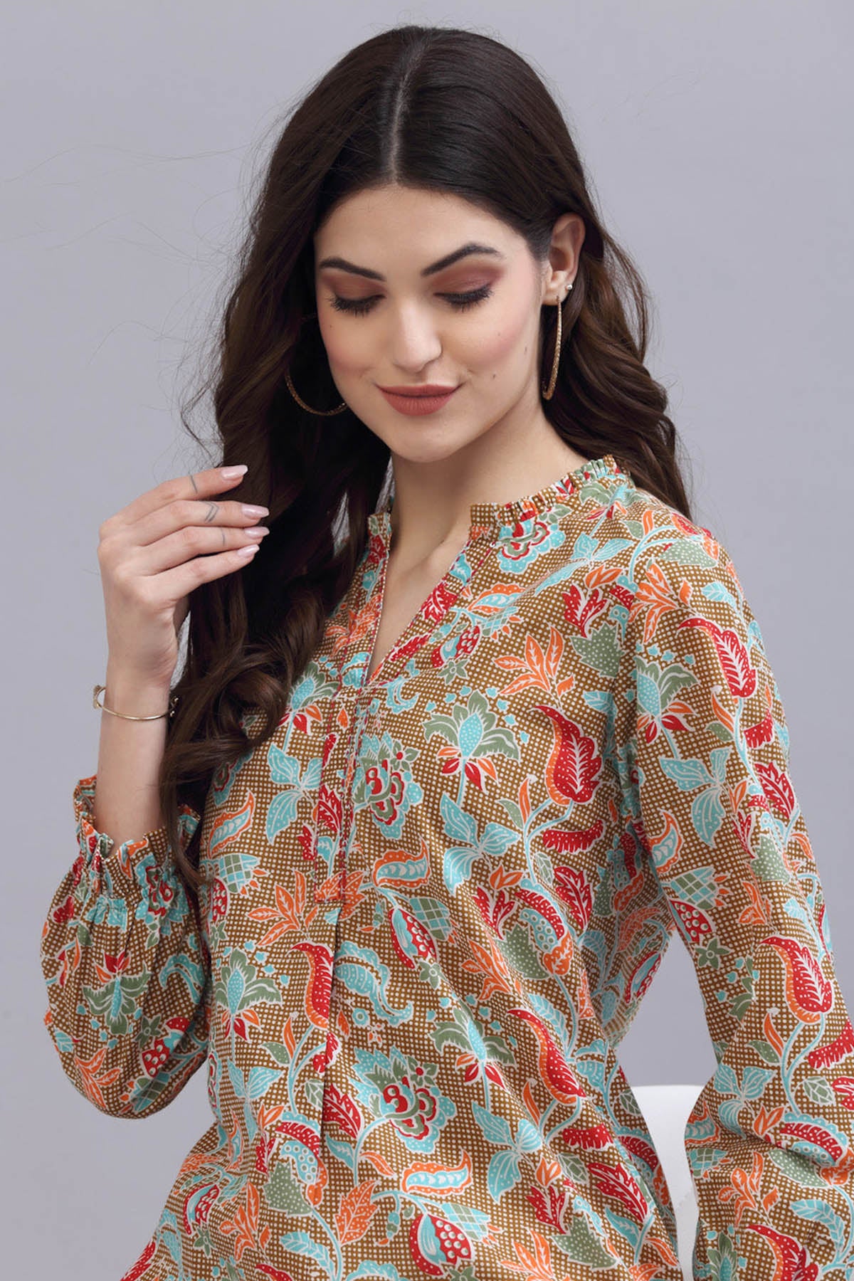 Khaki pure cotton floral printed top with V neck and ruffle detail work on long sleeves