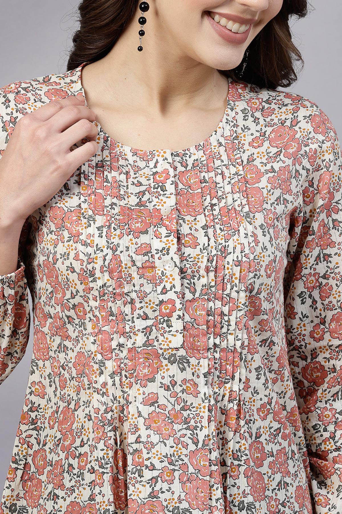 Peach ditsy printed top with pintuck details, button closure and round neck