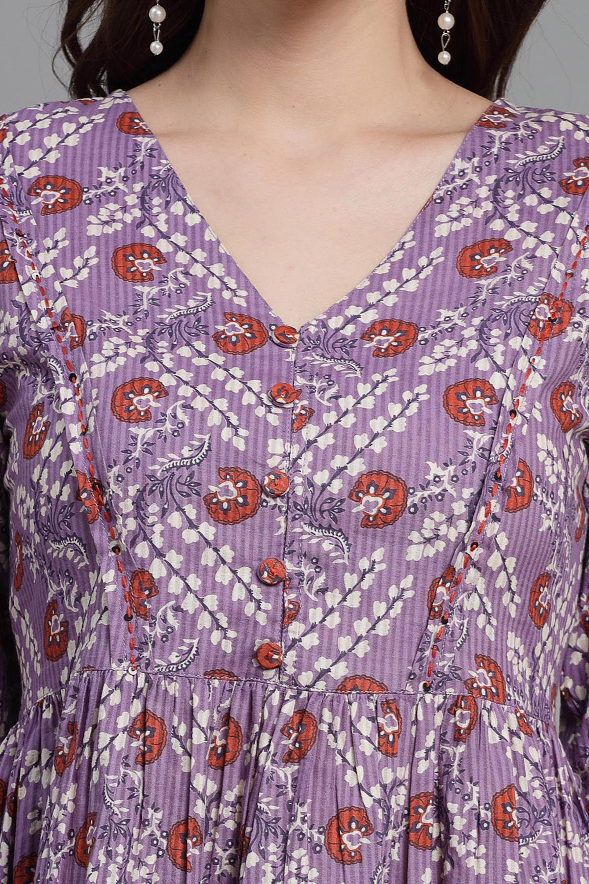 Soft purple pure cotton floral printed top with gathered waist, V neck, 3/4th sleeves and katha detailed work