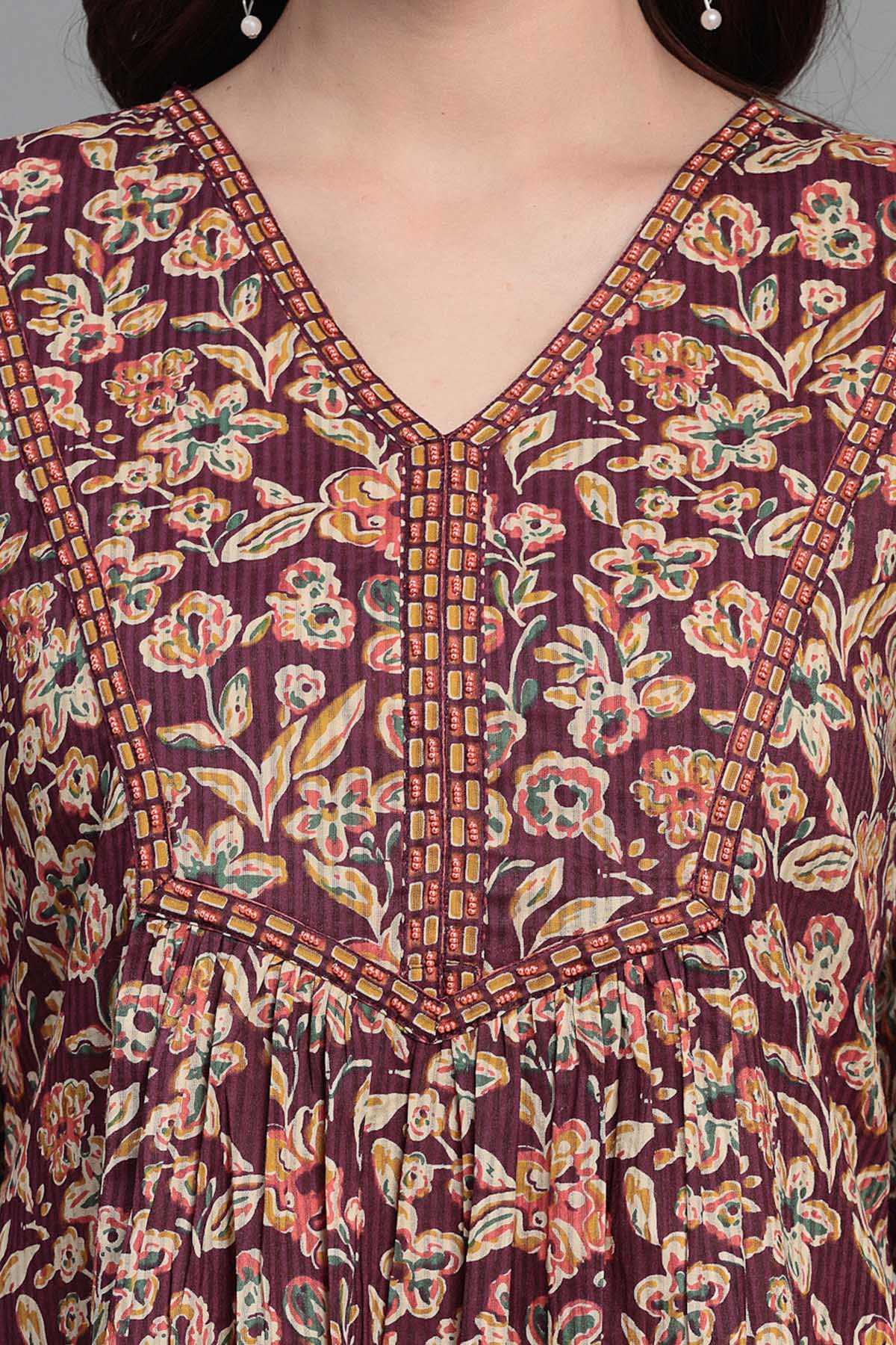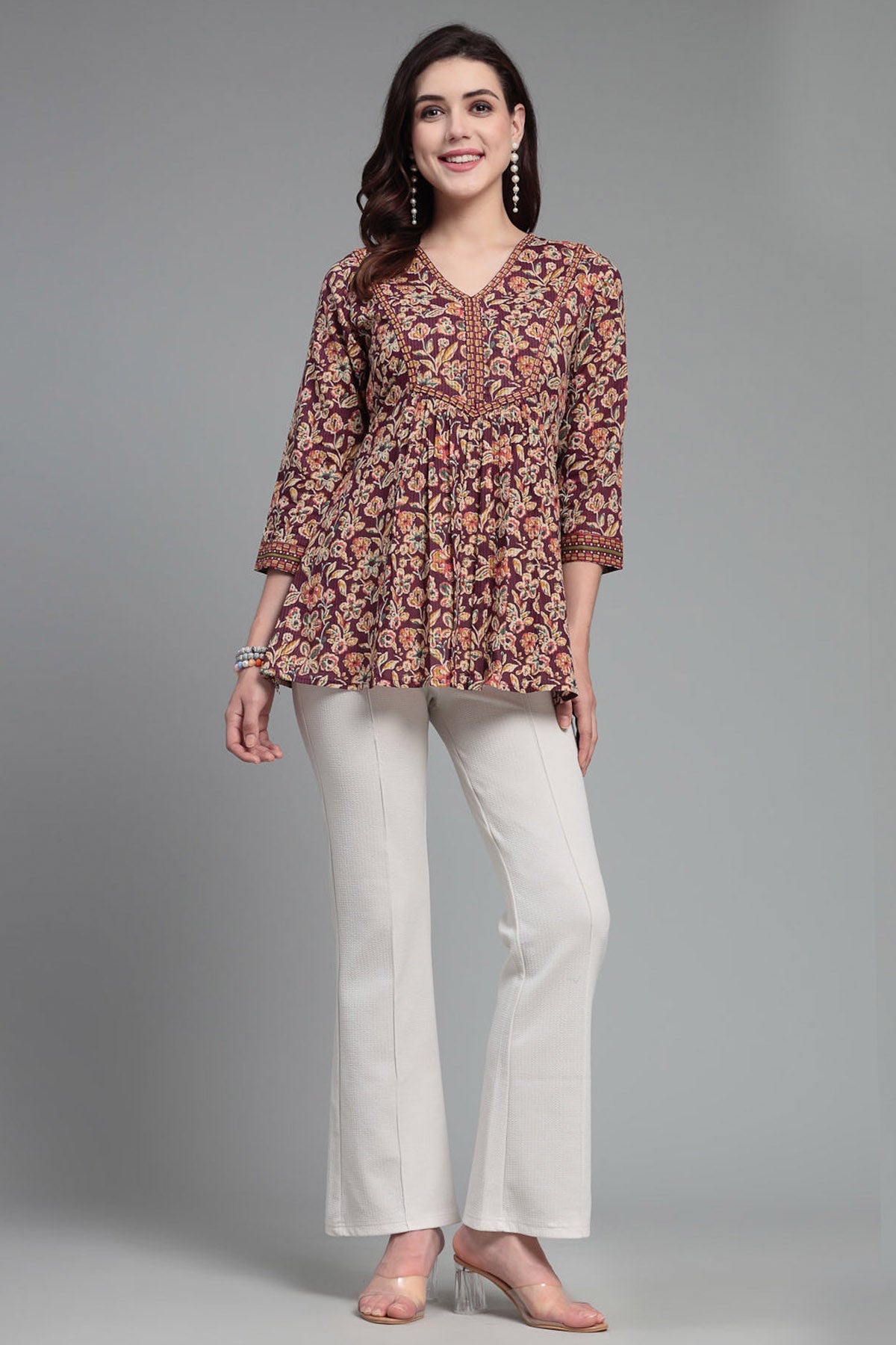 Wine pure cotton floral printed top with 3/4th sleeves, V neck and adda detail work