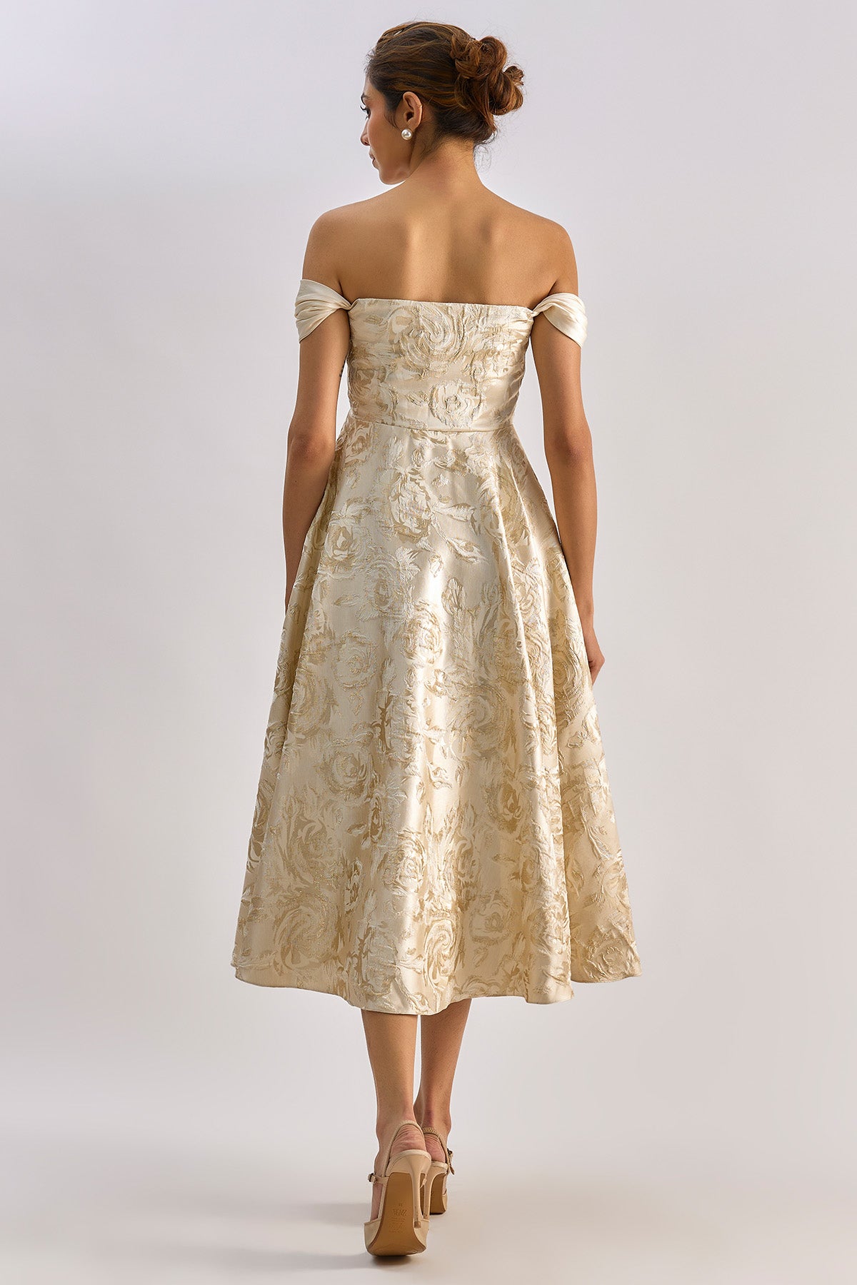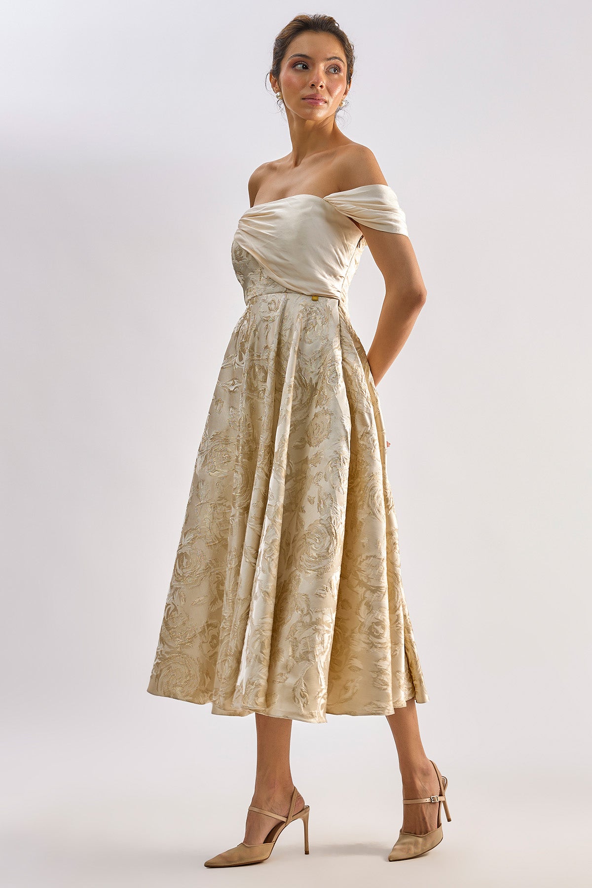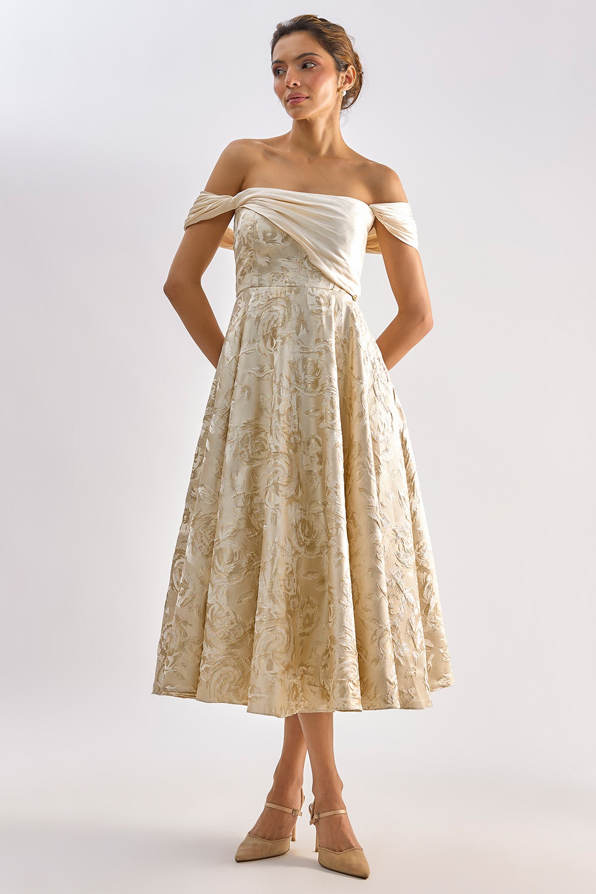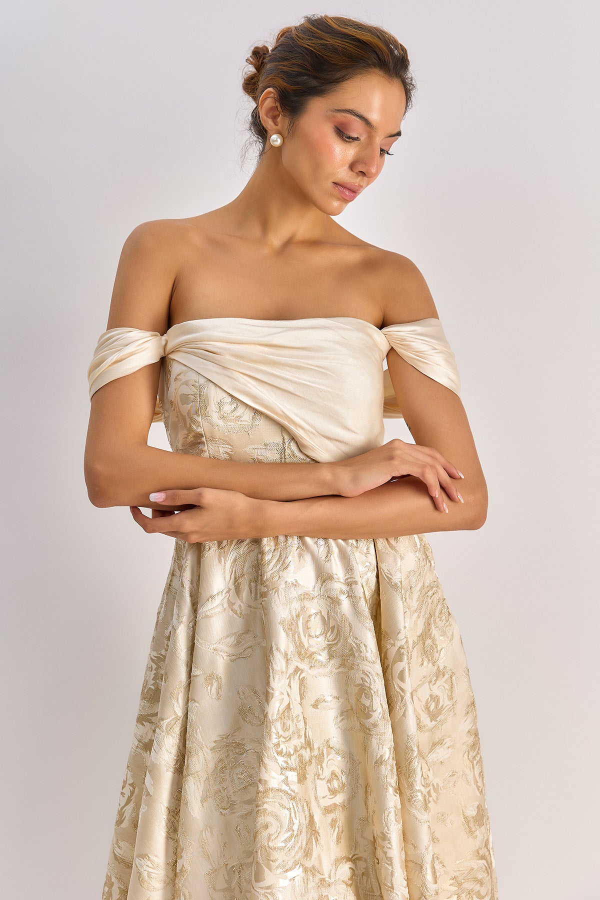 Beige jacquard off shoulder midi dress with floral textured and flared cut. This dress has shanton lining