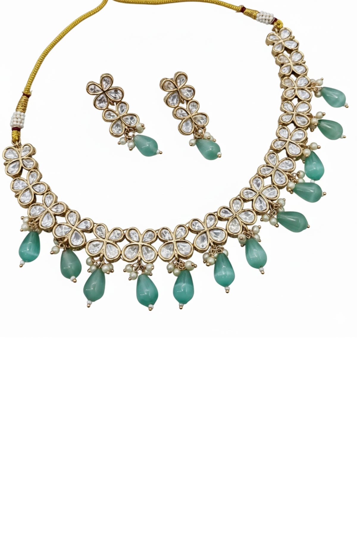 Emerald rose water bloom kundan jewellery set with gold plated and beads earring and beaded kundan necklace