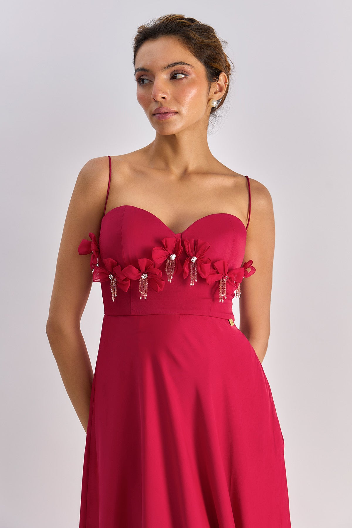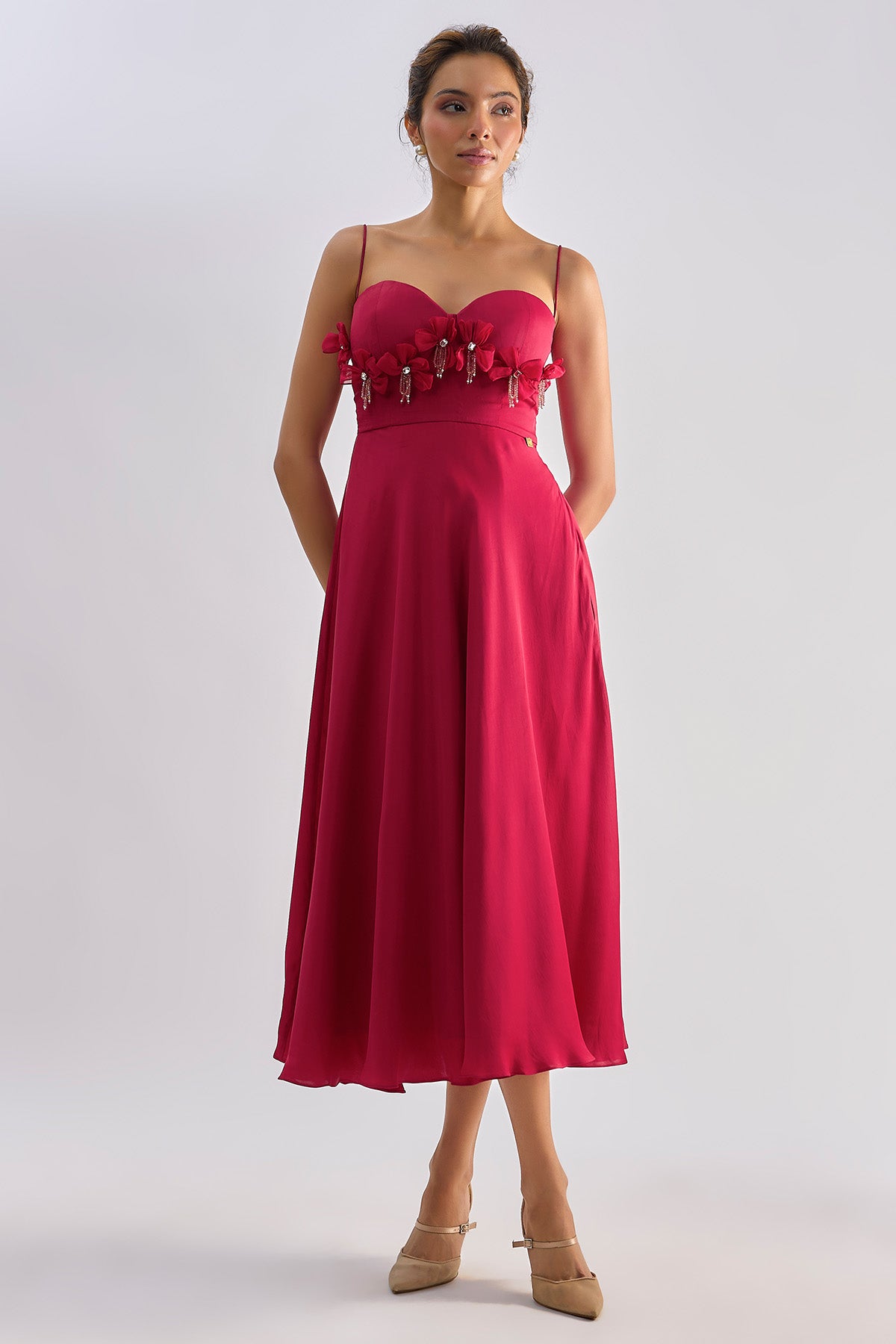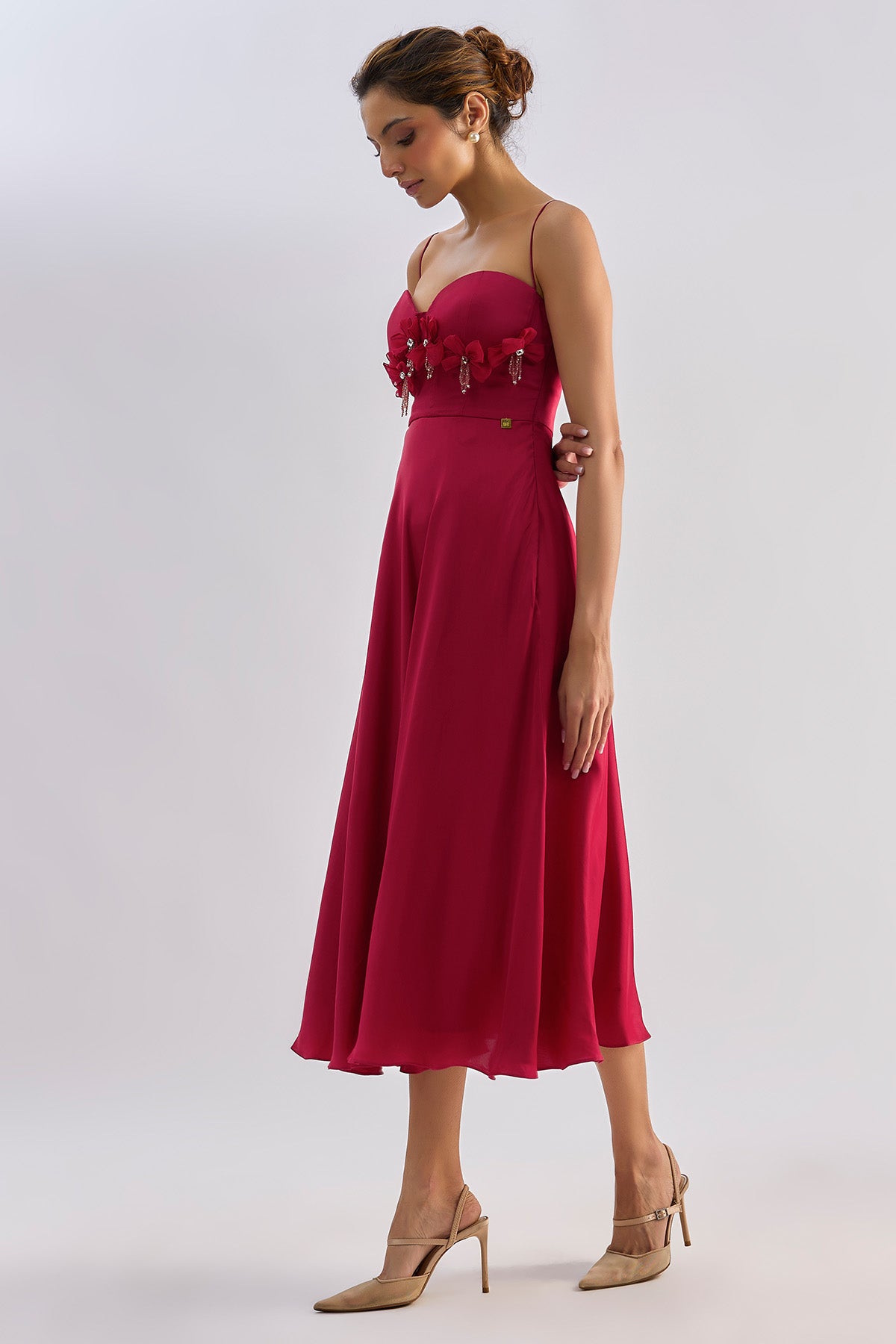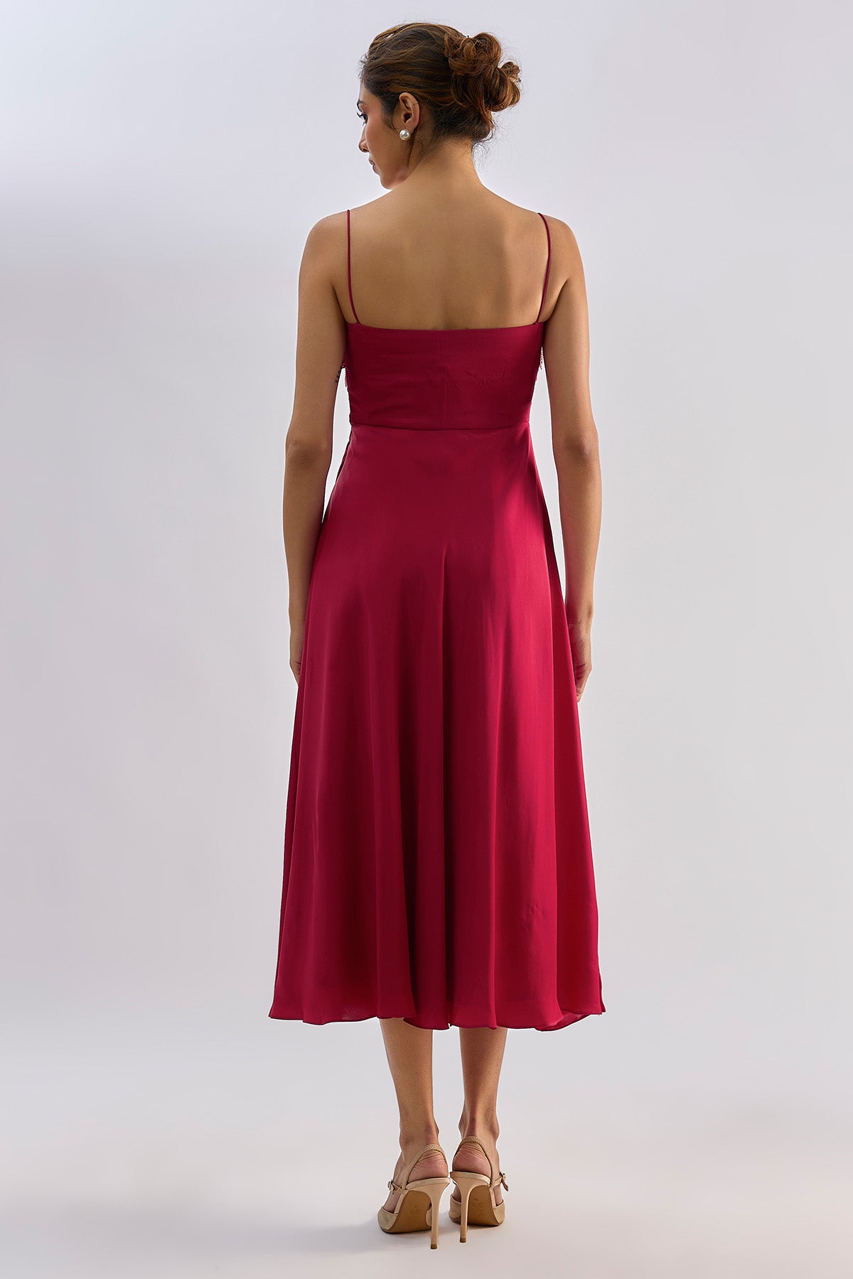 Crimson red dull satin flared midi dress with embellished swarvoski embroidery and intricate bow detailing. This dress has shantoon lining
