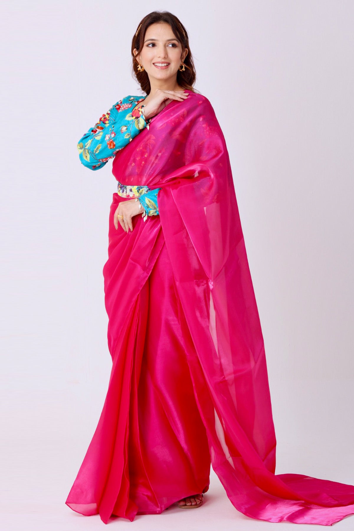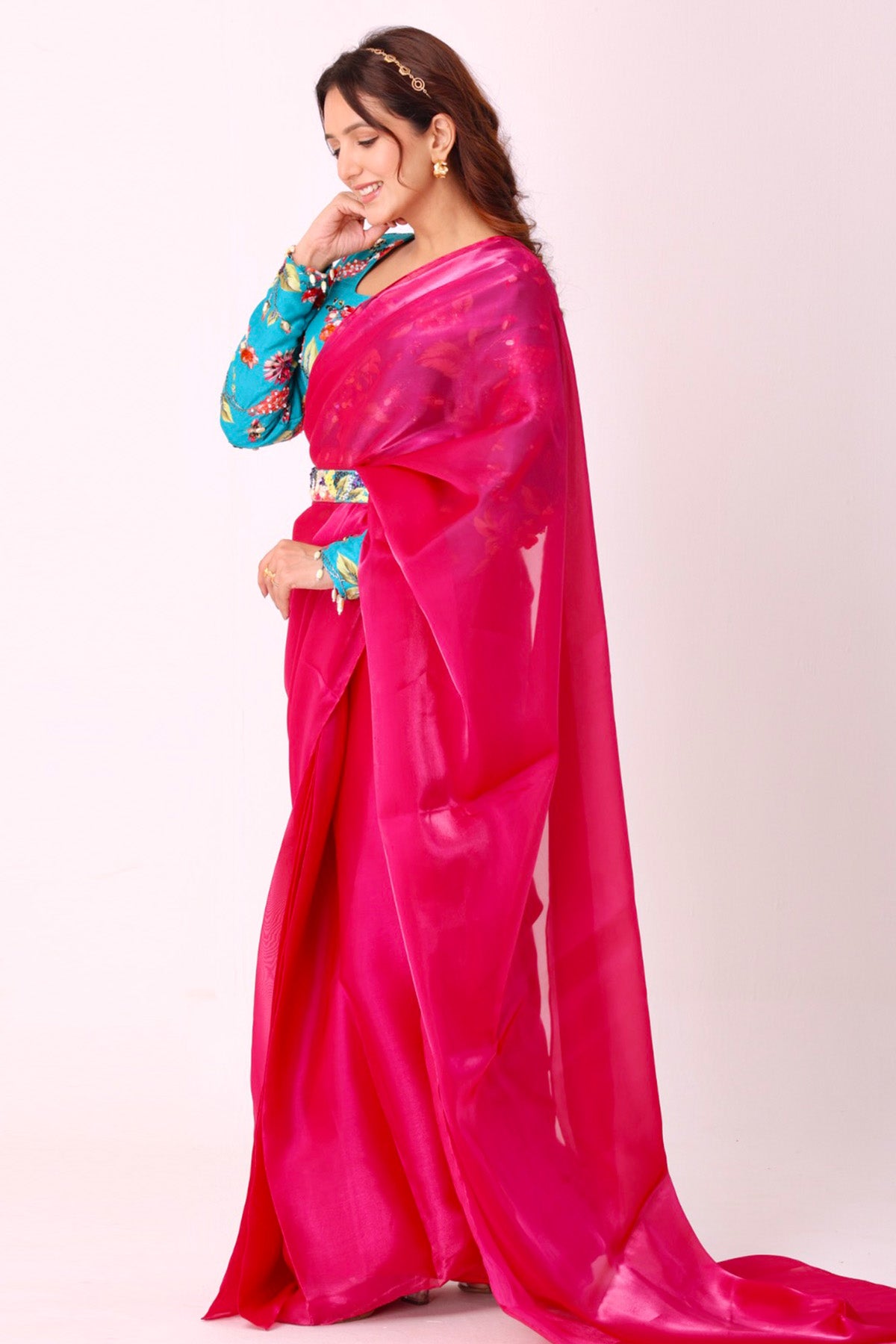 Blue fuchsia silk and organza saree set featuring hand embroidery saree with floral full sleeves blouse, square neck, cutdana, katori, pearl and sequins work paired with belt