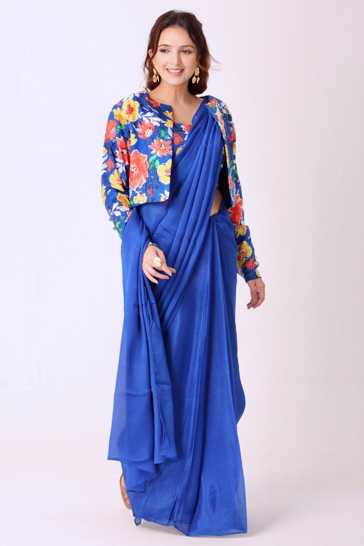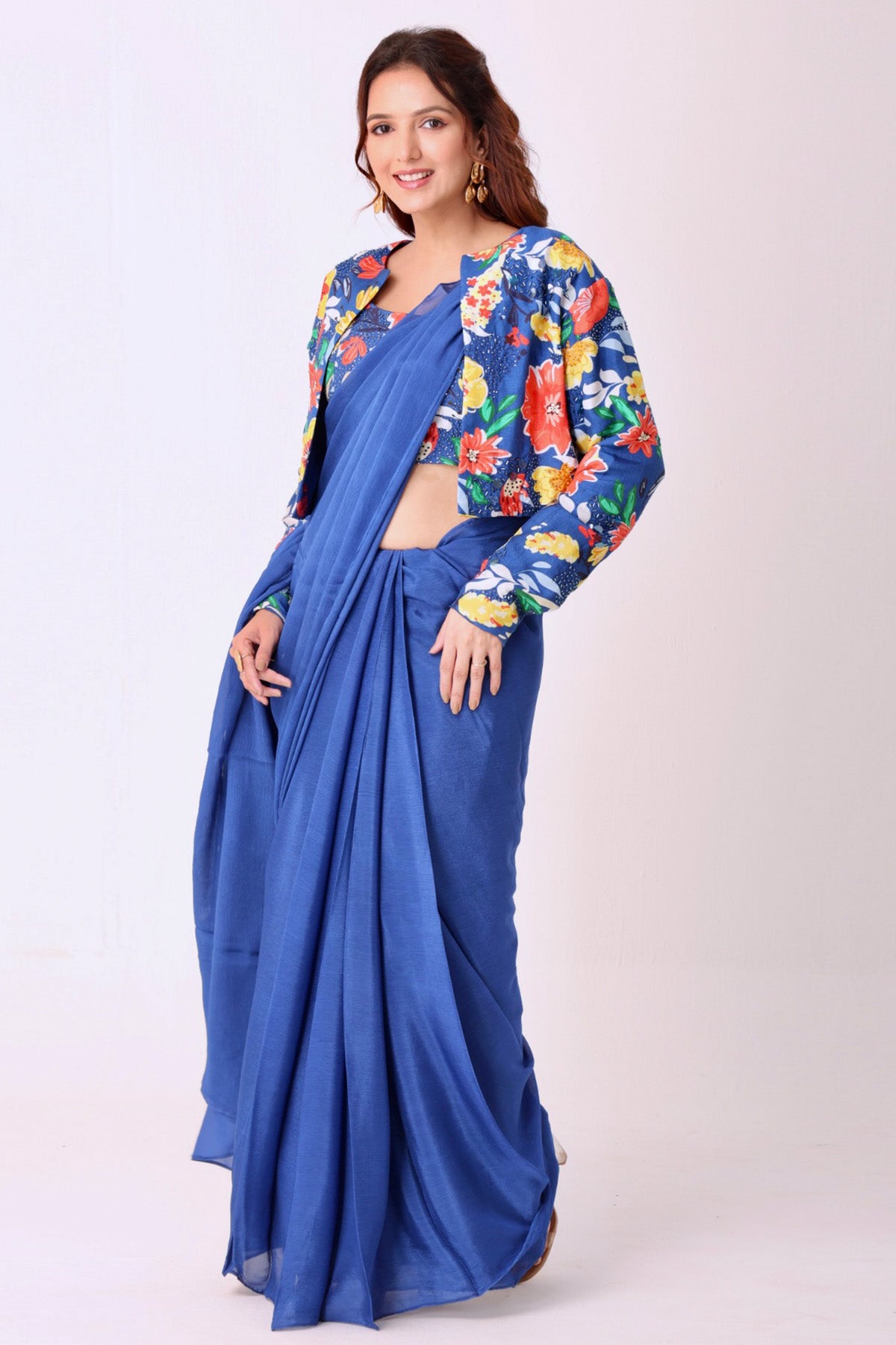 Blue silk and chinnon saree set featuring hand embroidery saree with blouse, U neck, cutdana, sequins, thread and beads work paired with full sleeves jacket