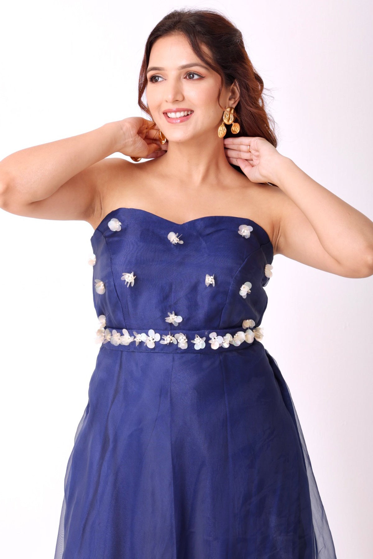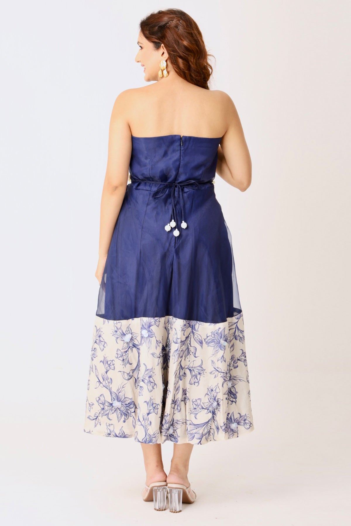 Ivory navy blue silk and organza midi dress featuring floral hand embroidery dress with off shoulder, sweetheart neck, cutdana, sequins and pearl work paired with belt