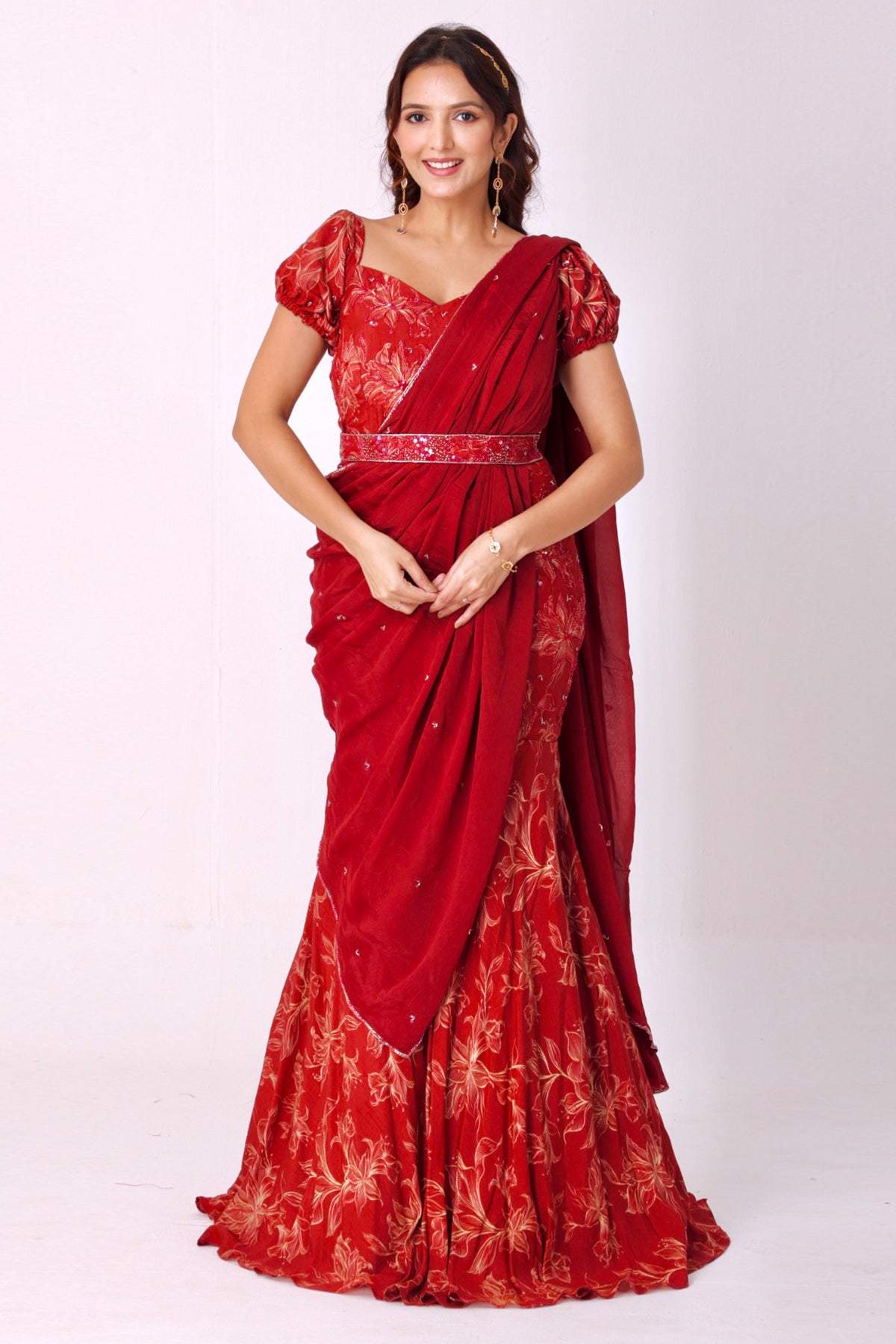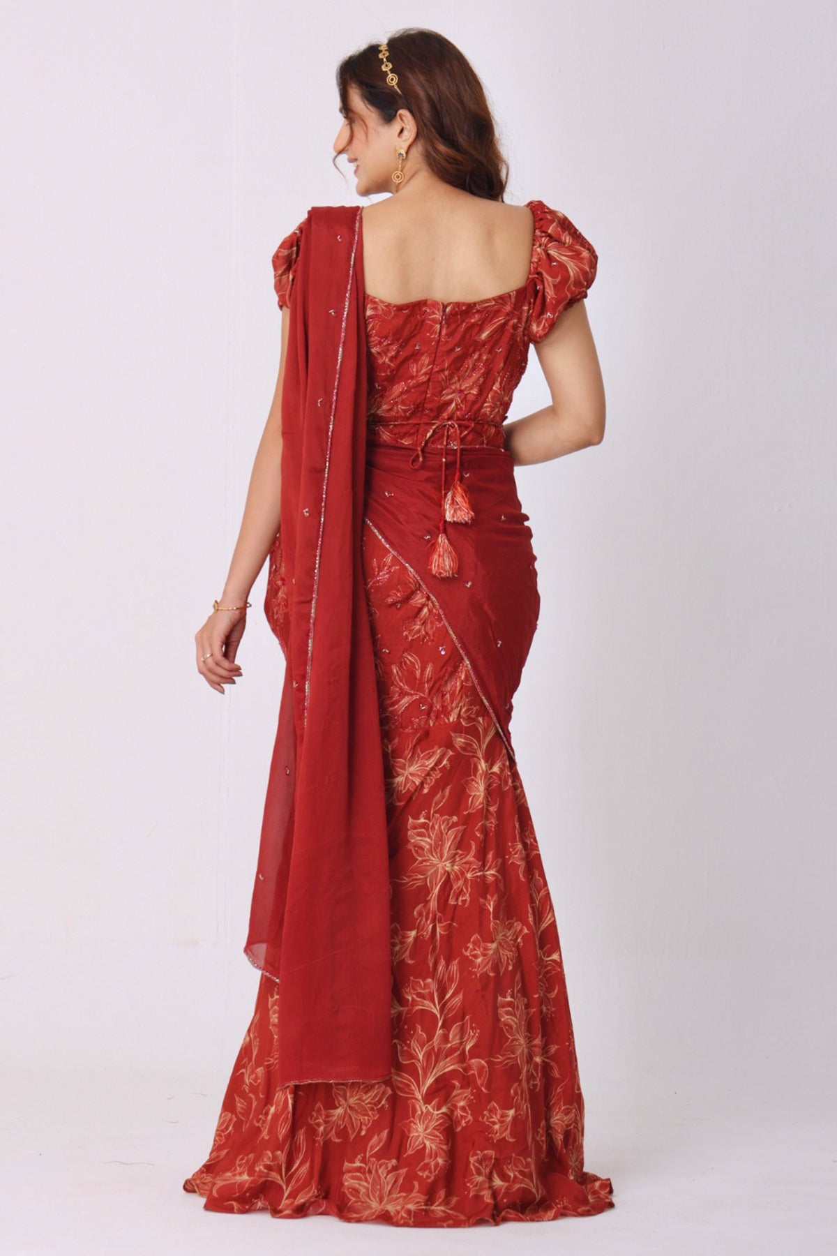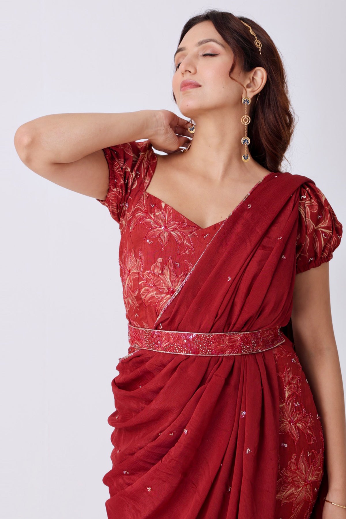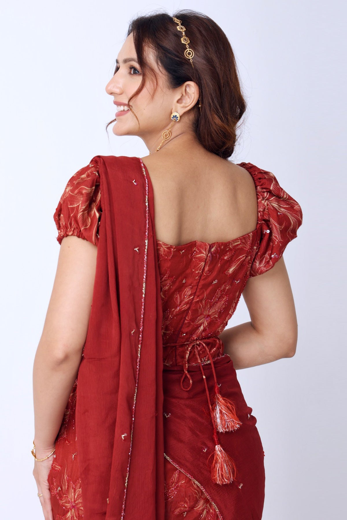 Maroon silk and chinnon saree set featuring floral embroidery fish cut saree with puff sleeves, sweetheart neck, cutdana, thread and sequins work paired with belt
