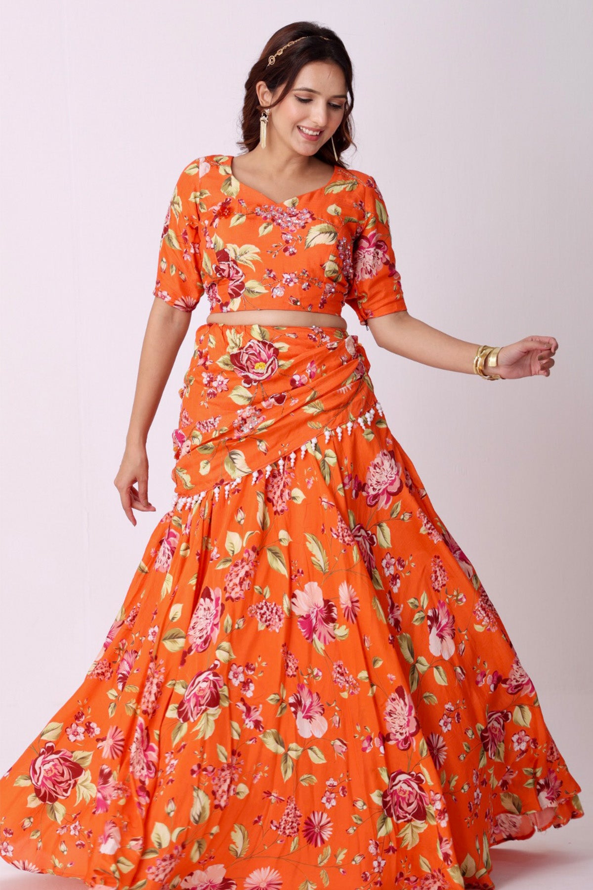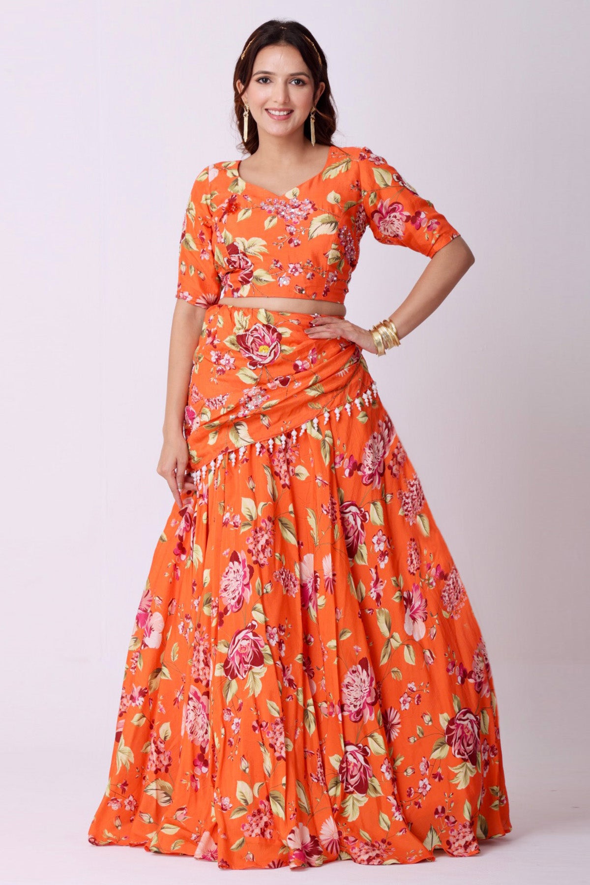 Orange silk floral printed Lehenga set featuring hand embroidery lehenga with choli, cutdana, katori, pearl, kasab and cut sequins work