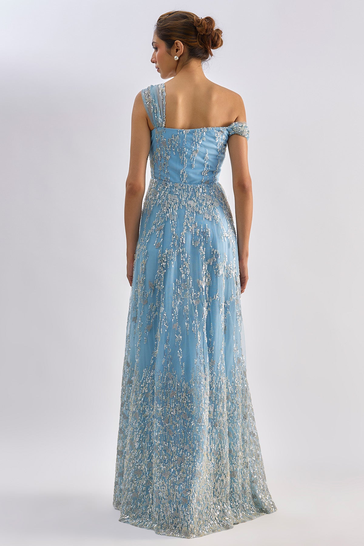 Buy Sea Blue Bead One Shoulder Gown for women by Emblaze online available at scrollnshops