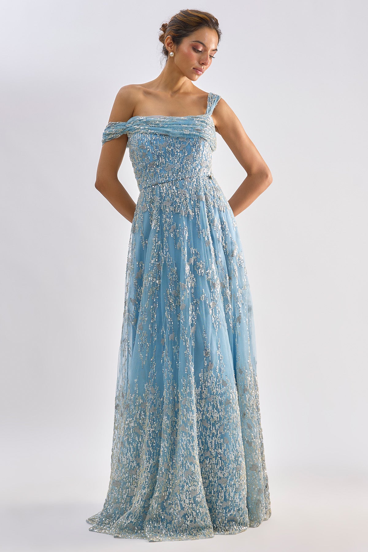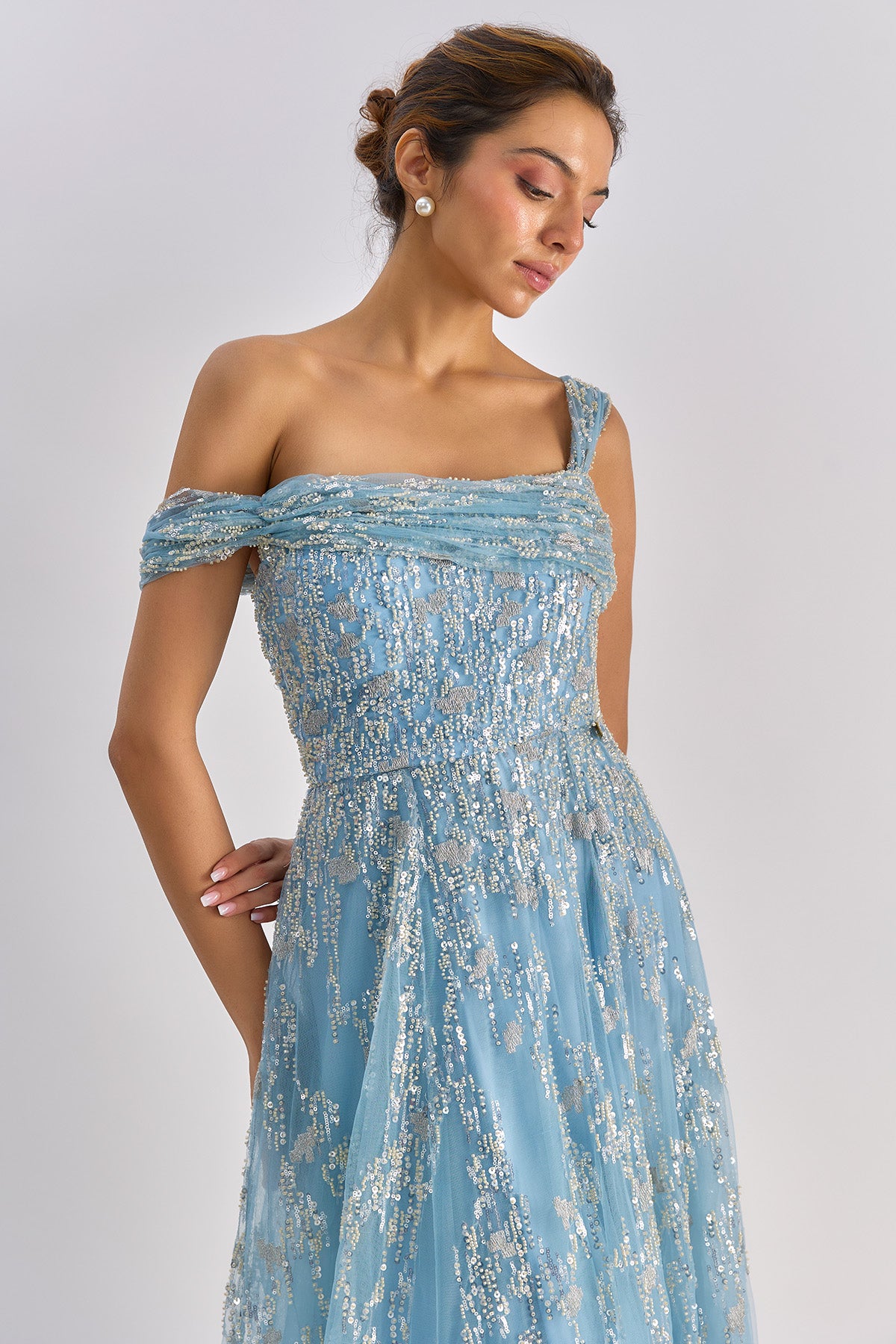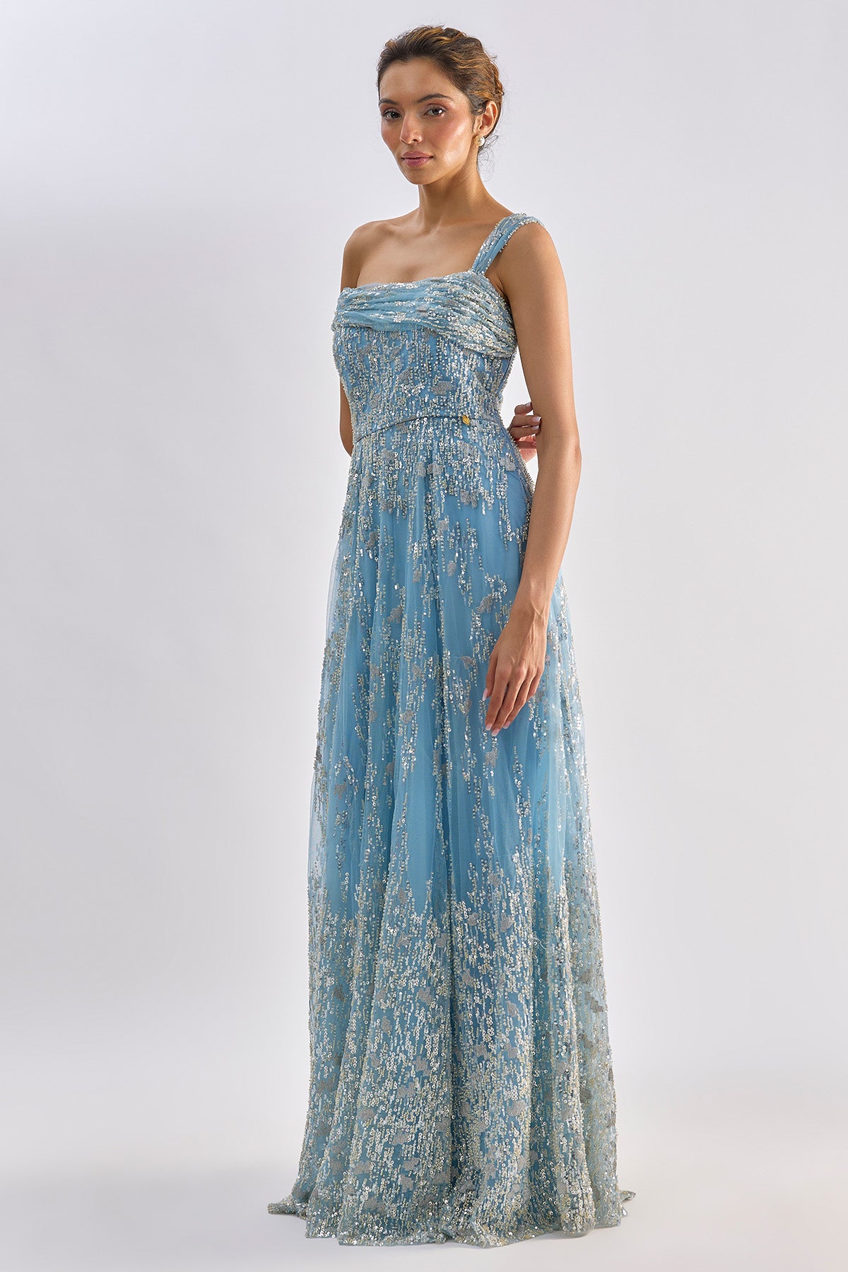 Sea blue tulle draped gown with one shoulder and embellished sequins work. This gown has shantoon lining
