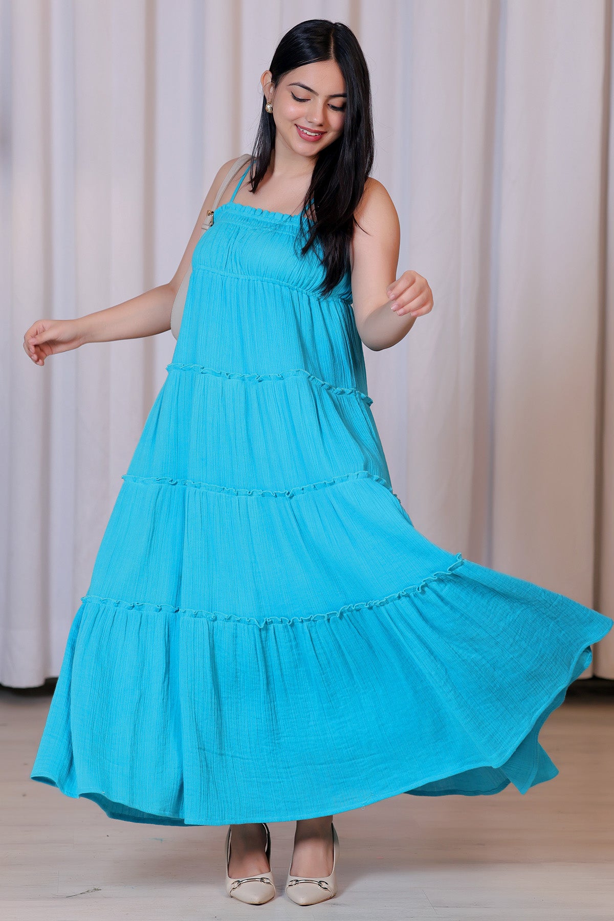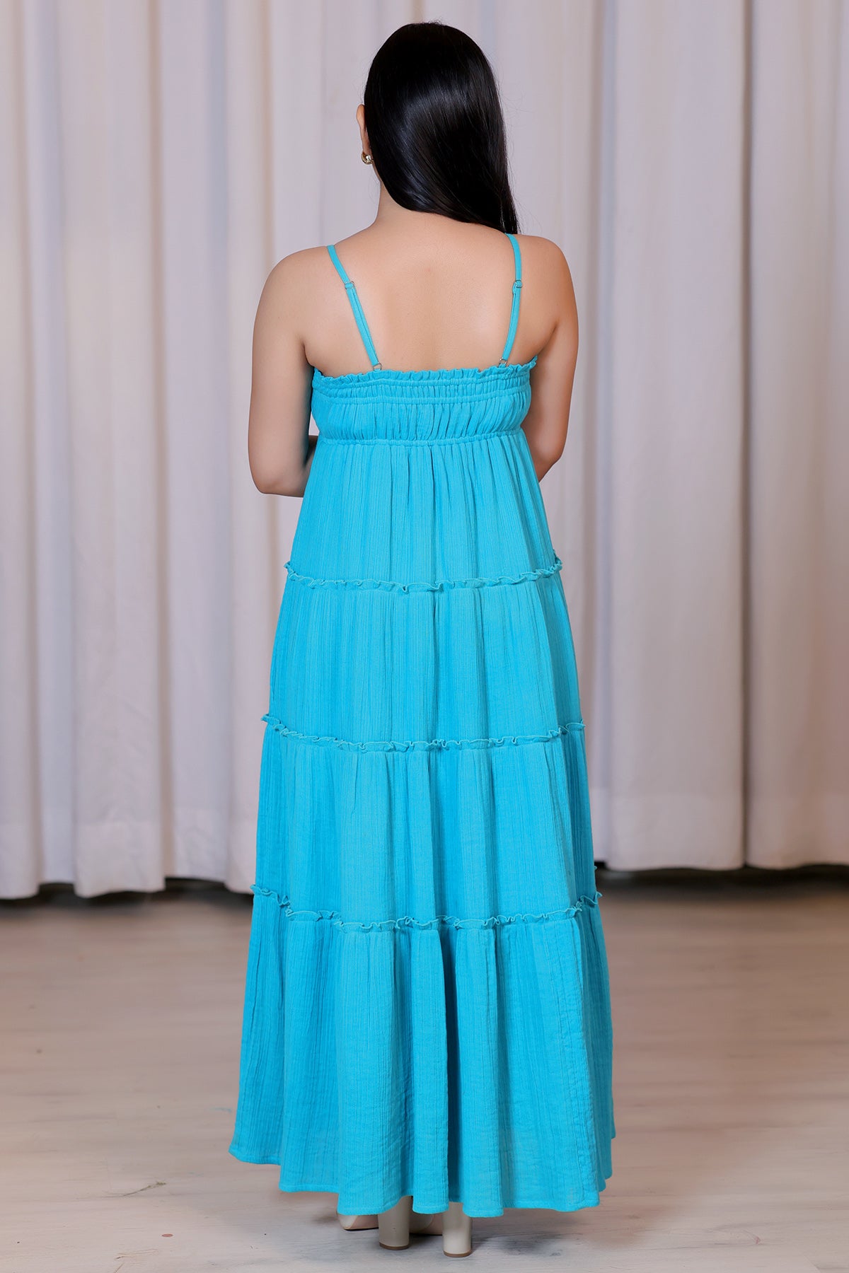 Teal blue double gauze solid maxi dress with square neck, shoulder straps and tier with overlock edge finish