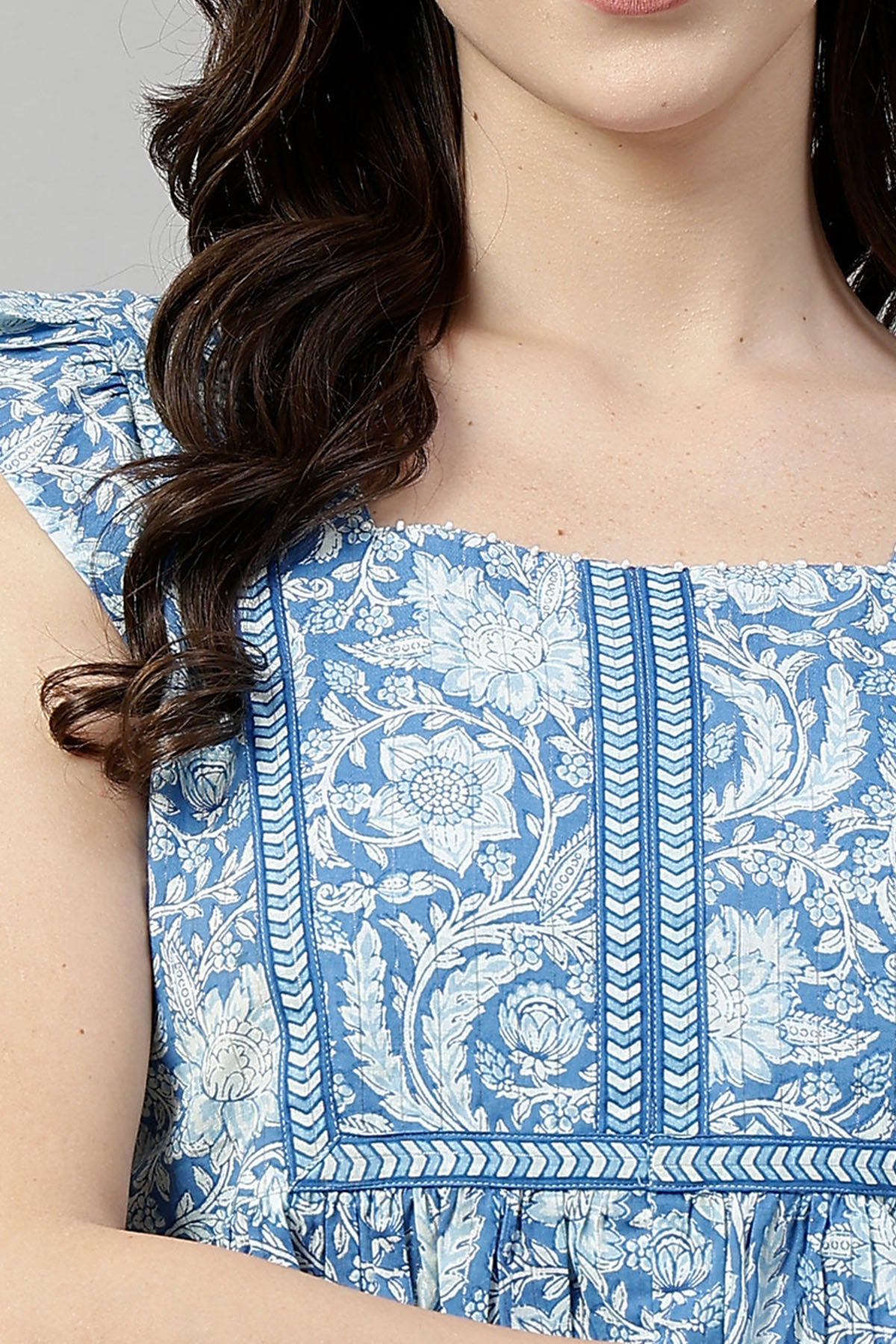 Blue 100% pure cotton printed top with flutter sleeves and square neck with no lining