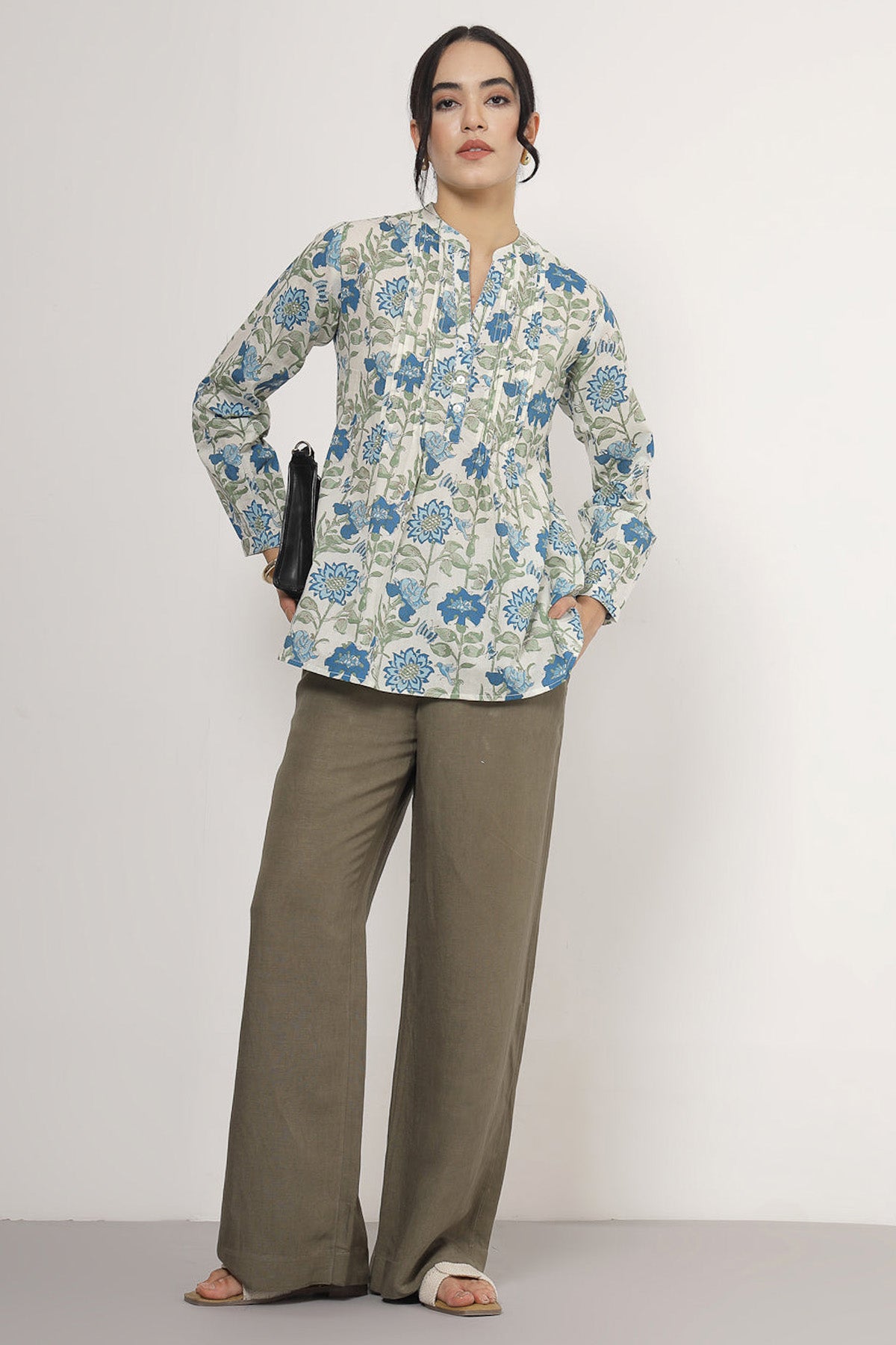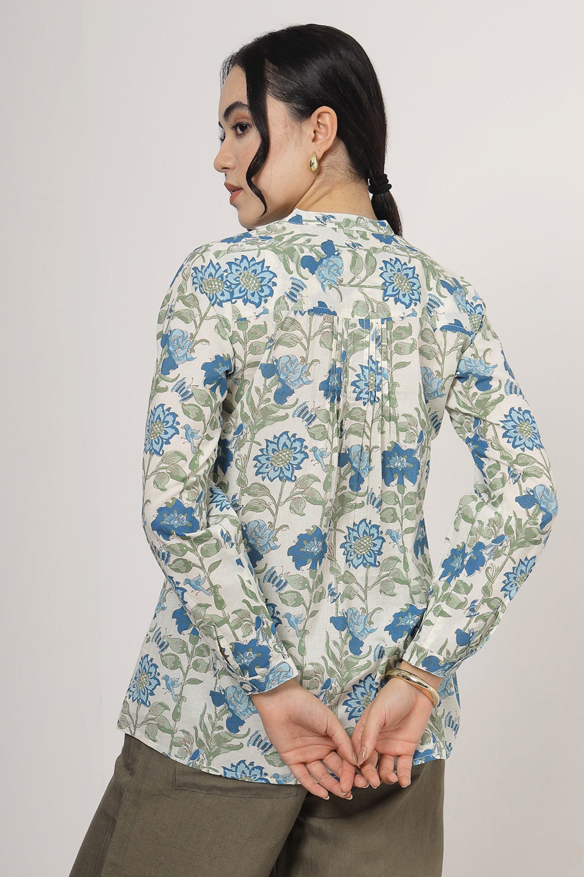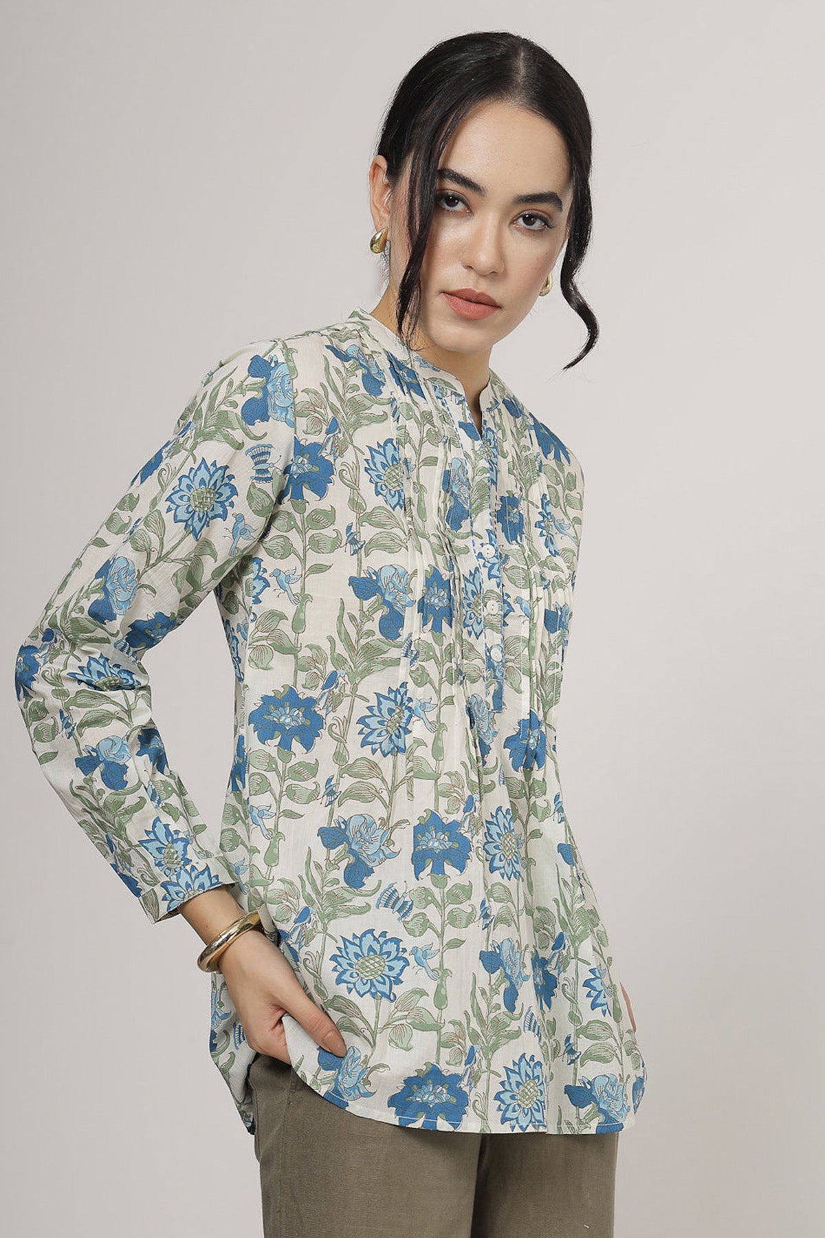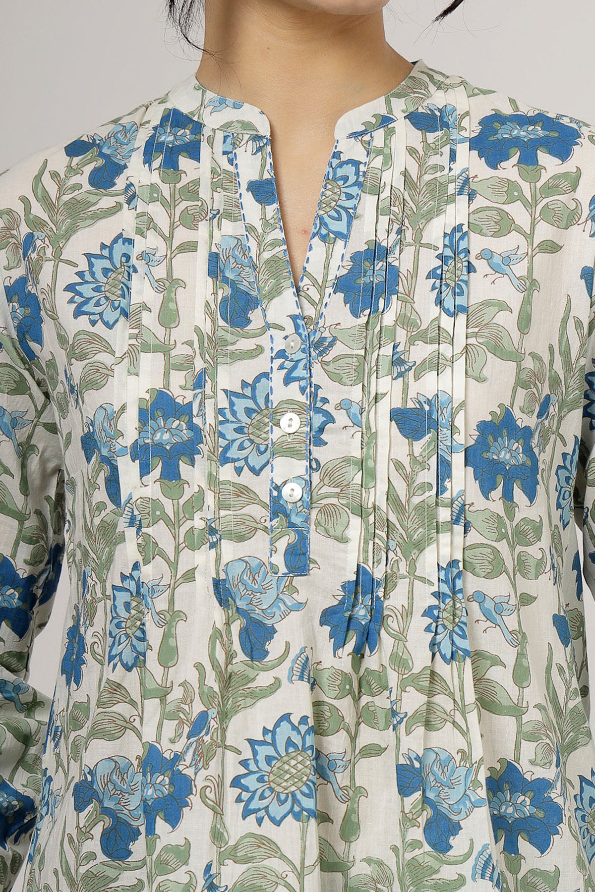 Blue 100% pure cotton floral printed top with mandarin collar, buttons, katha detailed work and cuff sleeves