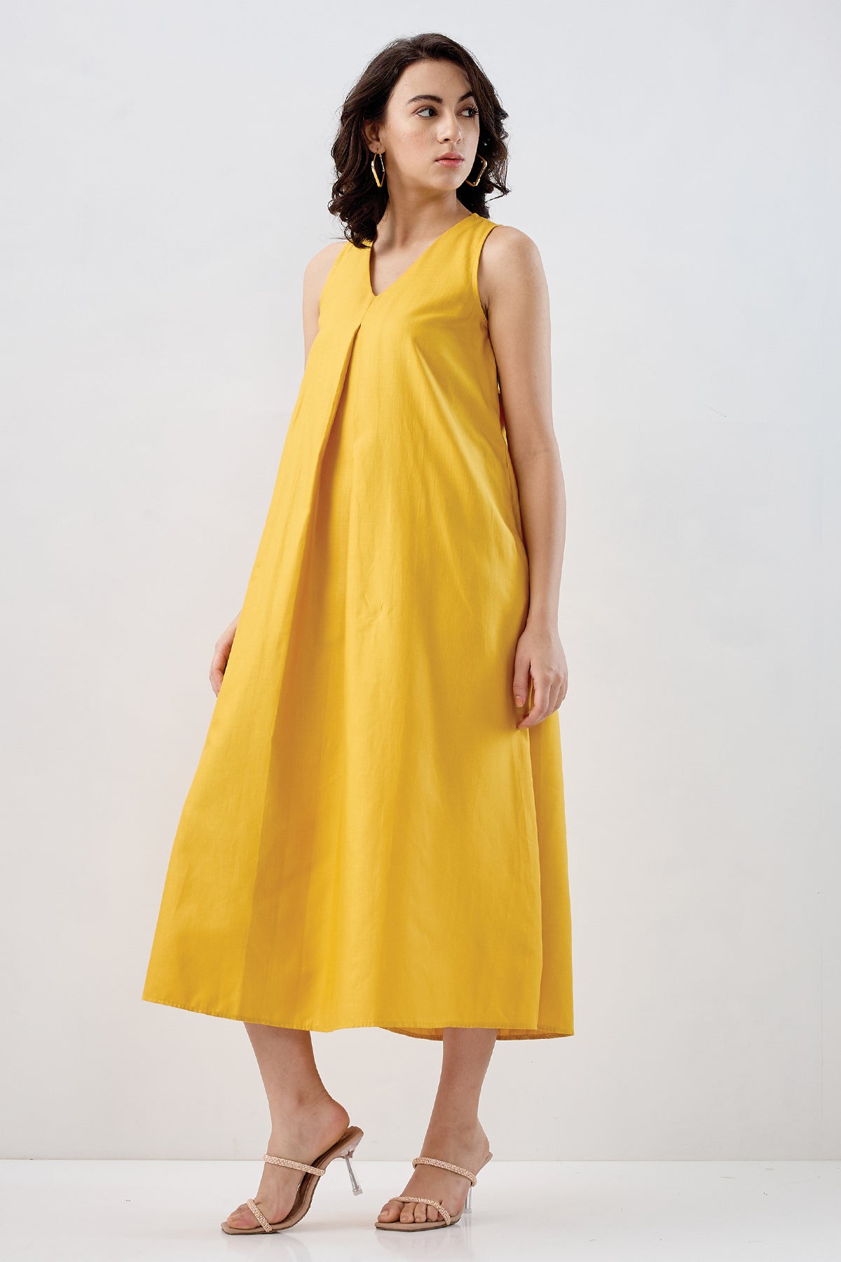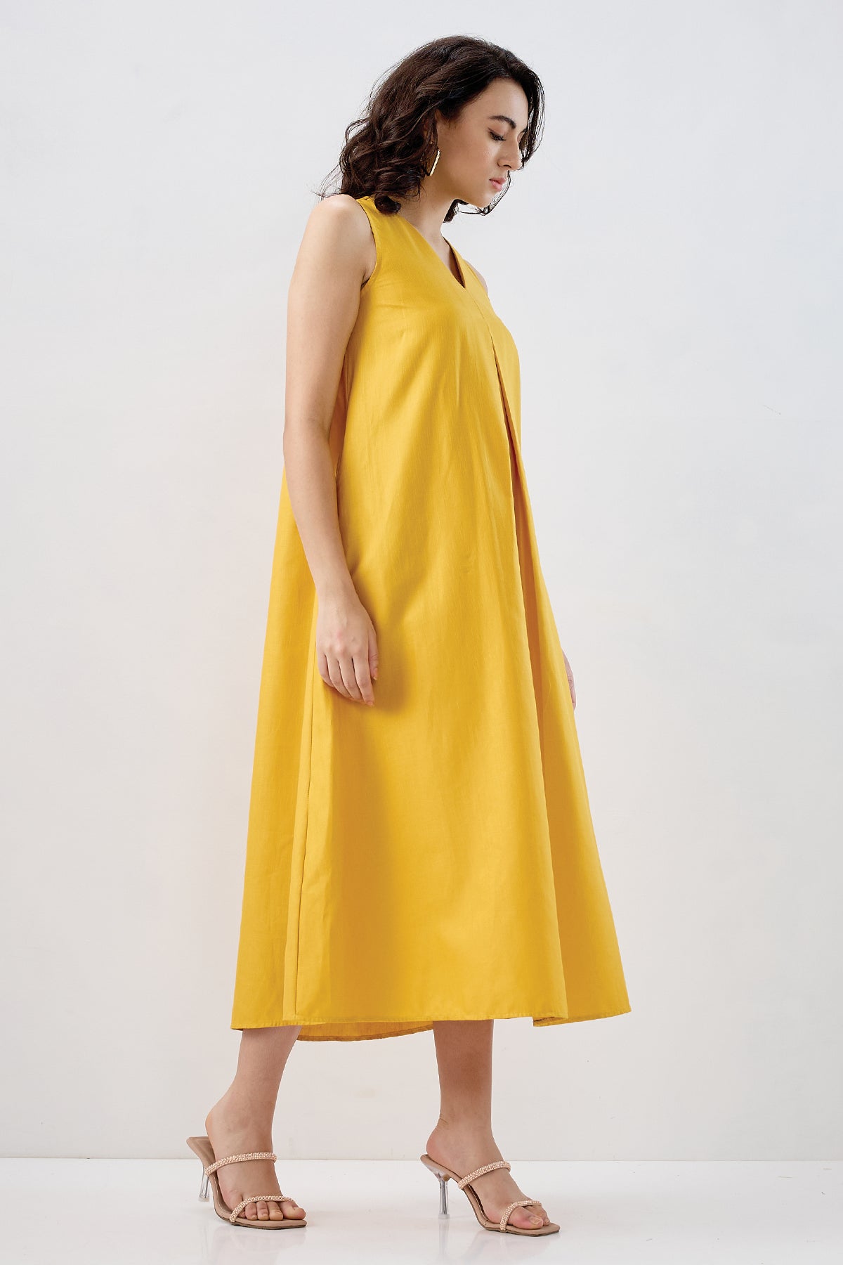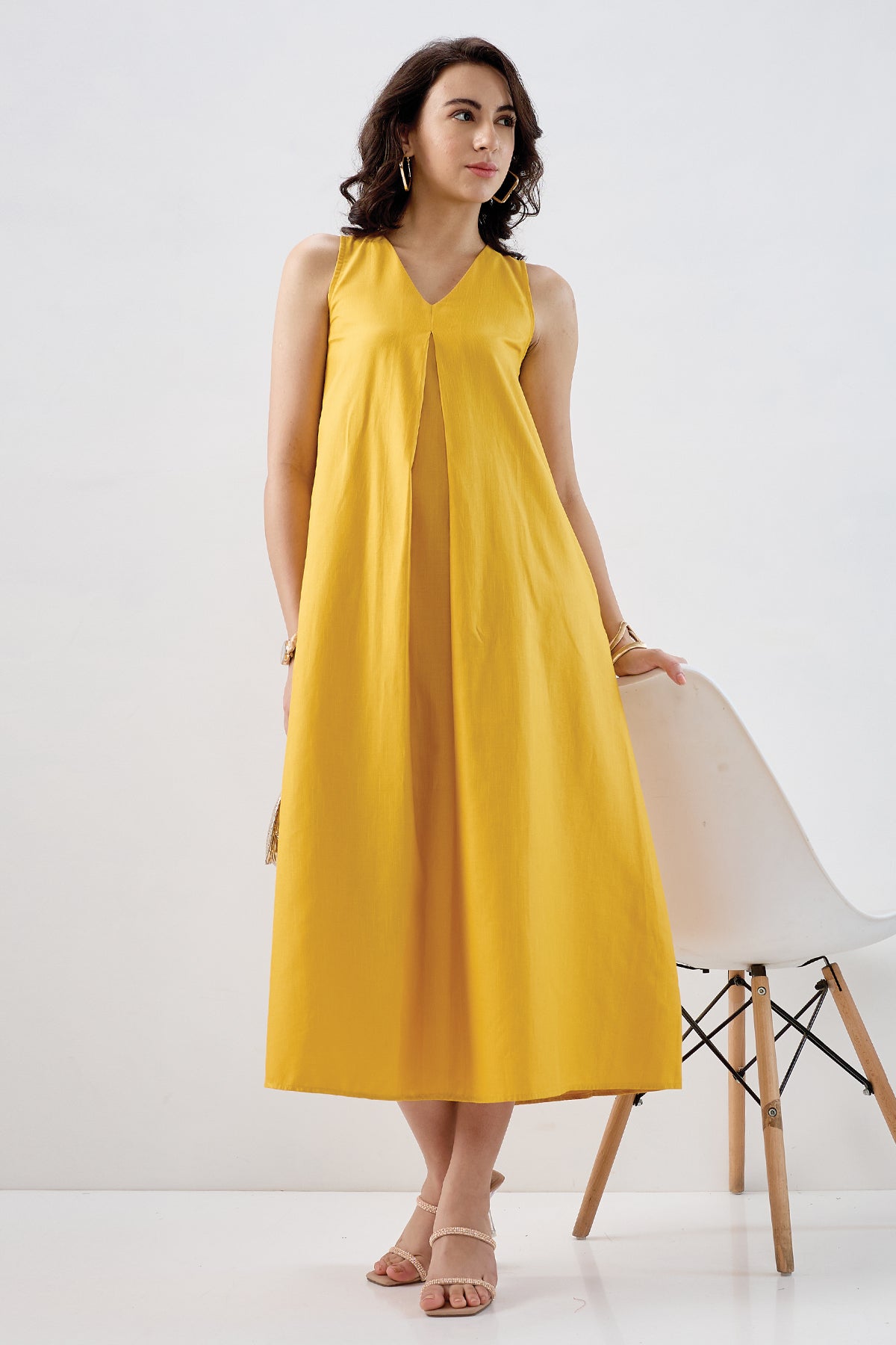 Mustard 100% cotton midi dress with box pleat at front, side pockets, v-neck and sleeveless. The length of the dress is 48 inches