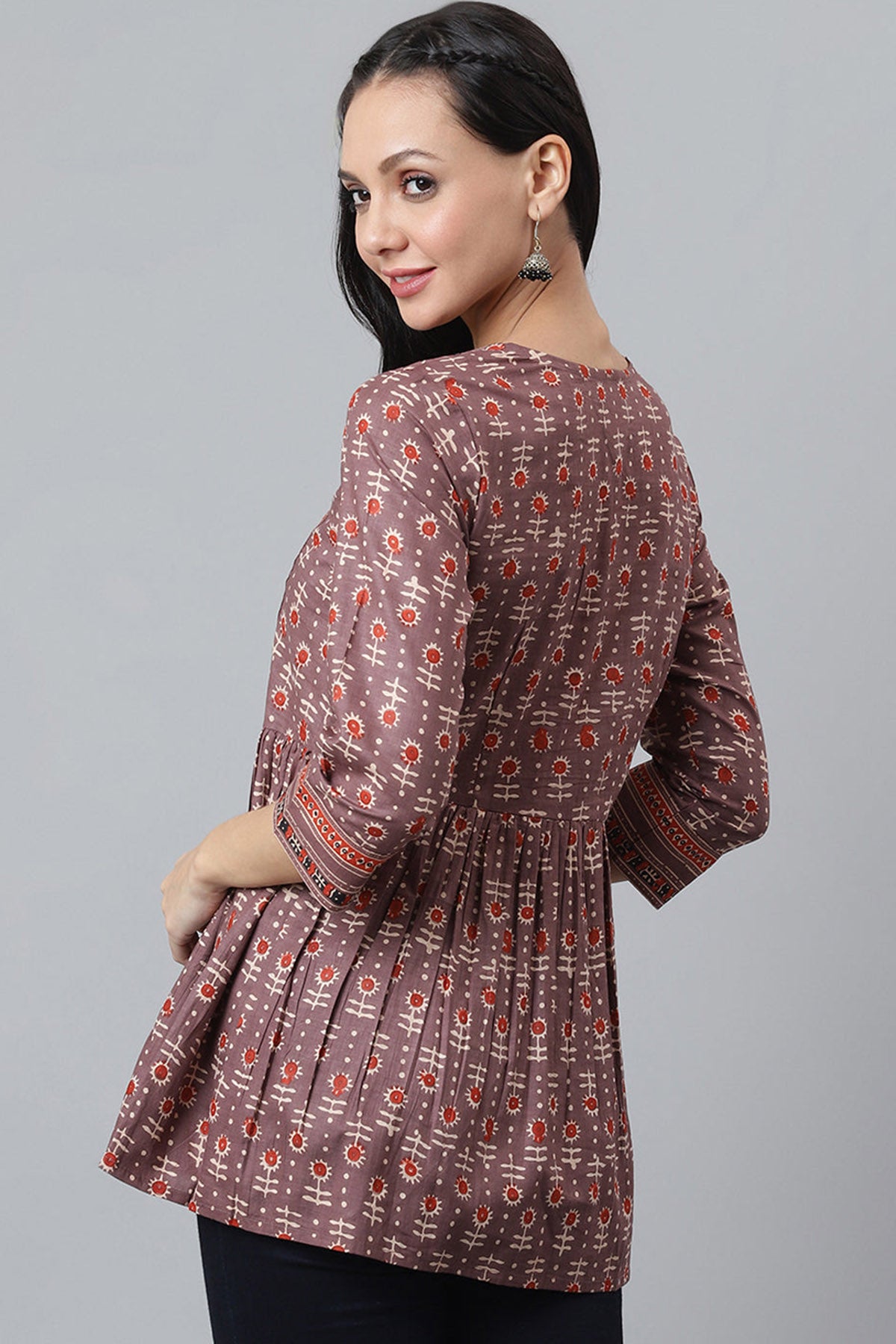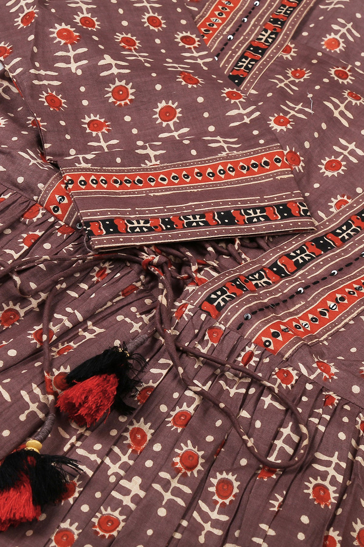 Rust 100% pure cotton printed top with 3/4th sleeves, gathered front, tie up tasselled dori and katha embroidery work with no lining