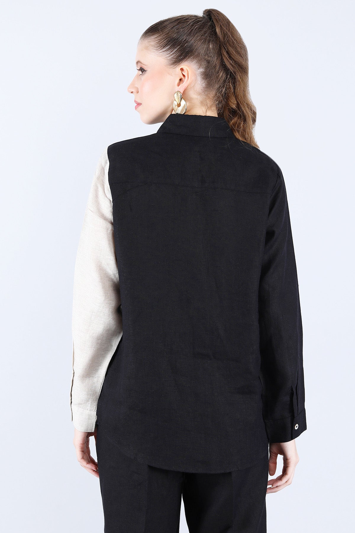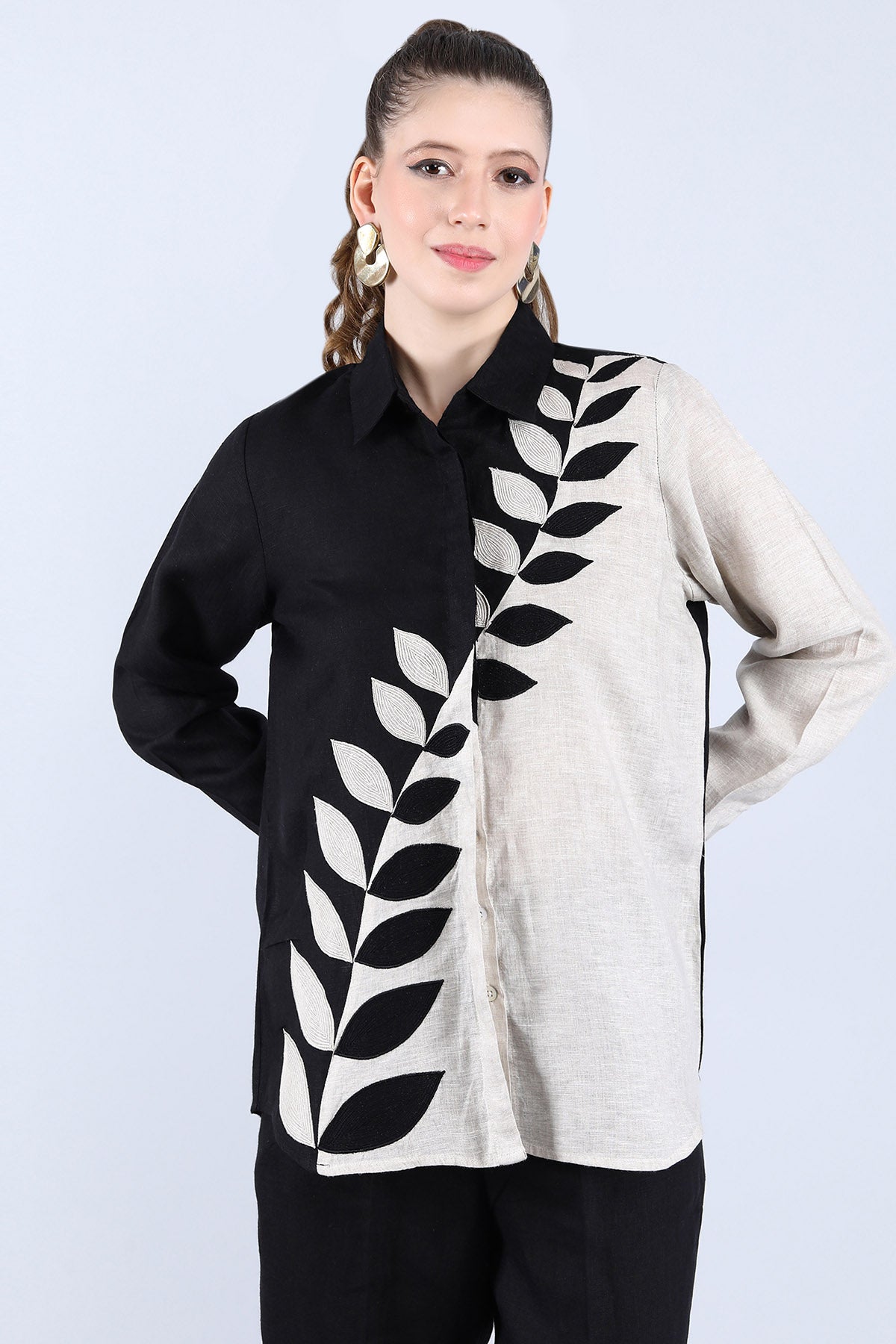 Beige and black 100% pure linen co-ord set with diagonal leaf embroidered shirt featuring buttons, collar, full sleeves paired with matching pants