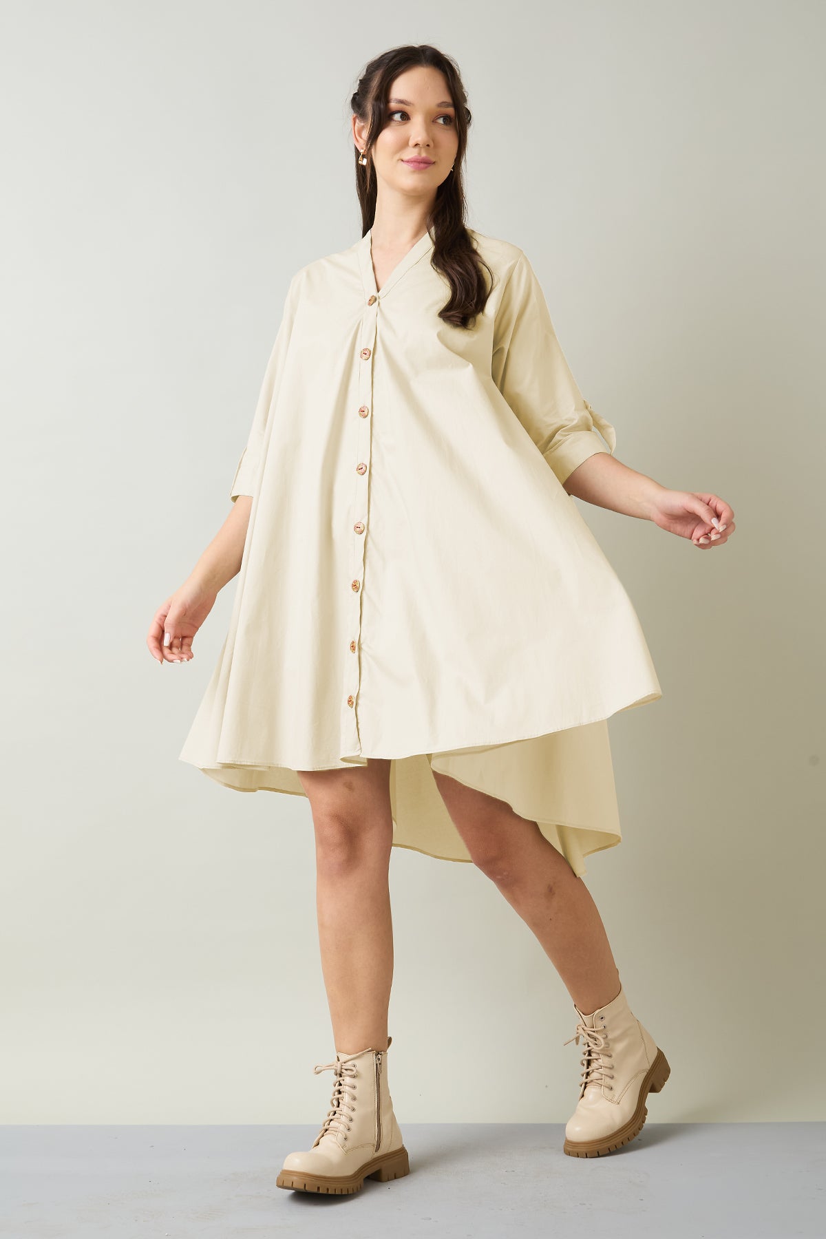 Beige 100% cotton (poplin) relaxed fit oversized dress with high low hem, wooden buttons and v-neck. The front length is 33 inches and back length is 40 inches