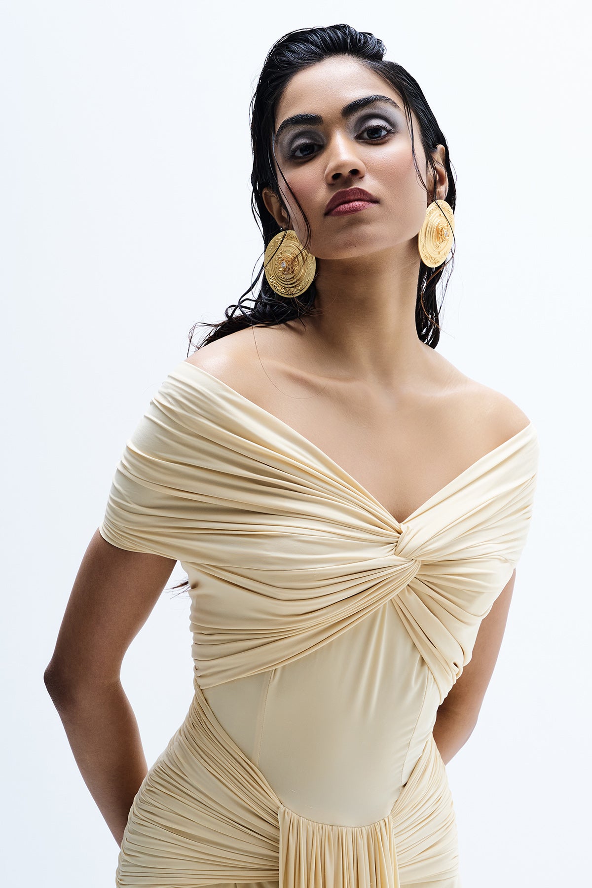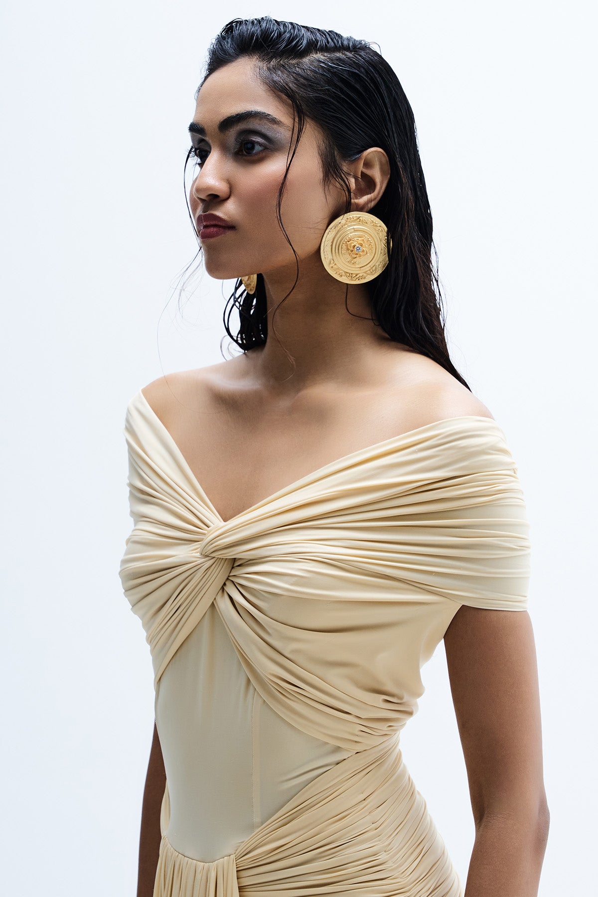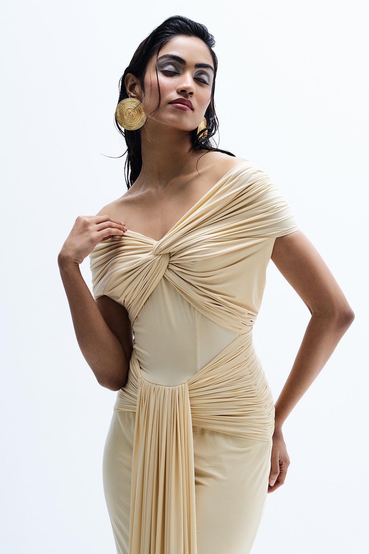 Beige lycra maxi dress with front gathered and off shoulder