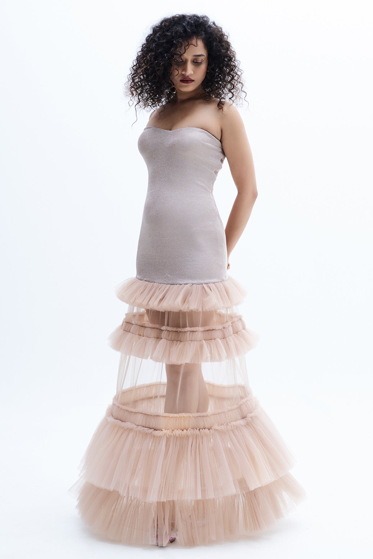 GKDedit Beige Soft Net Shimmer Dress