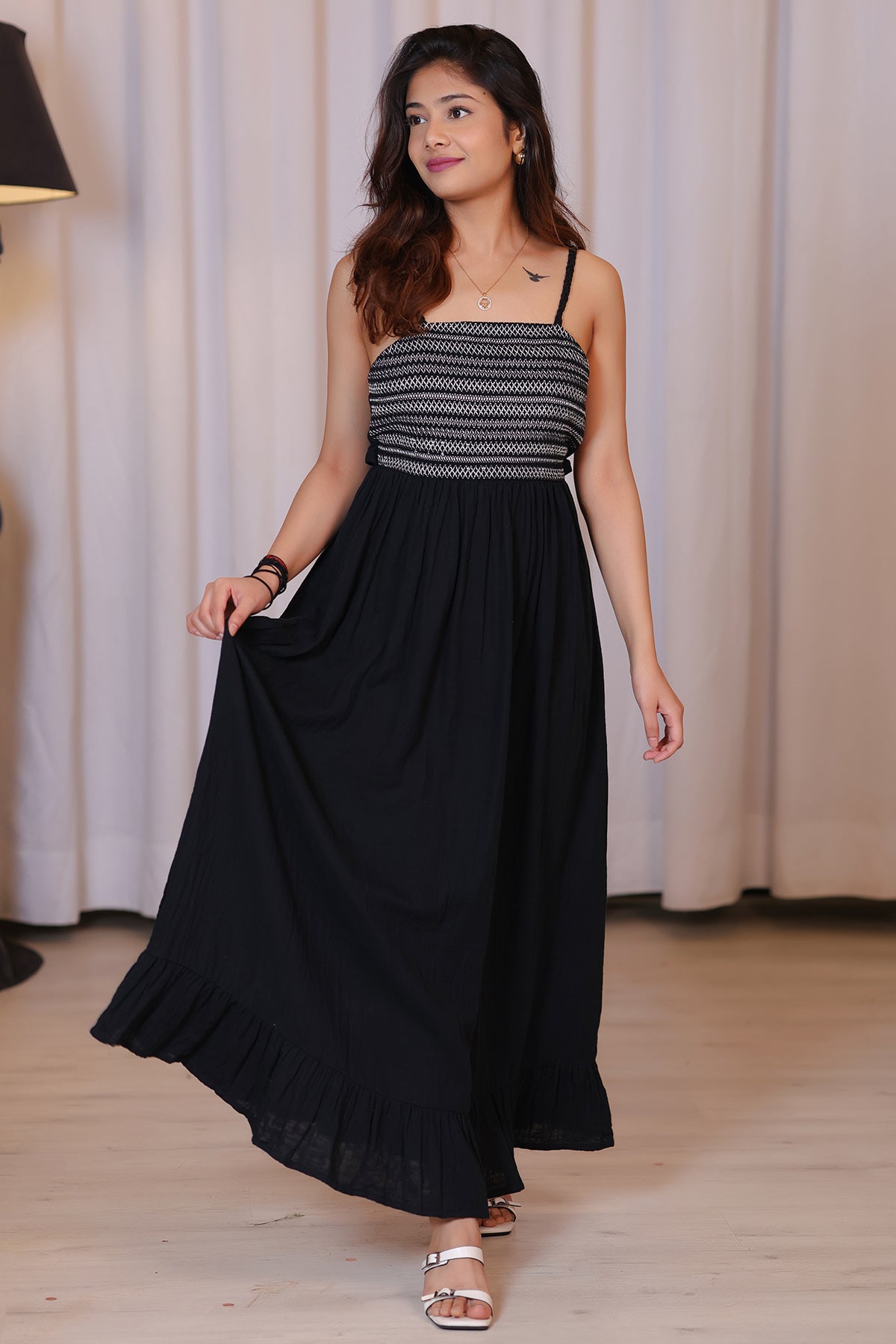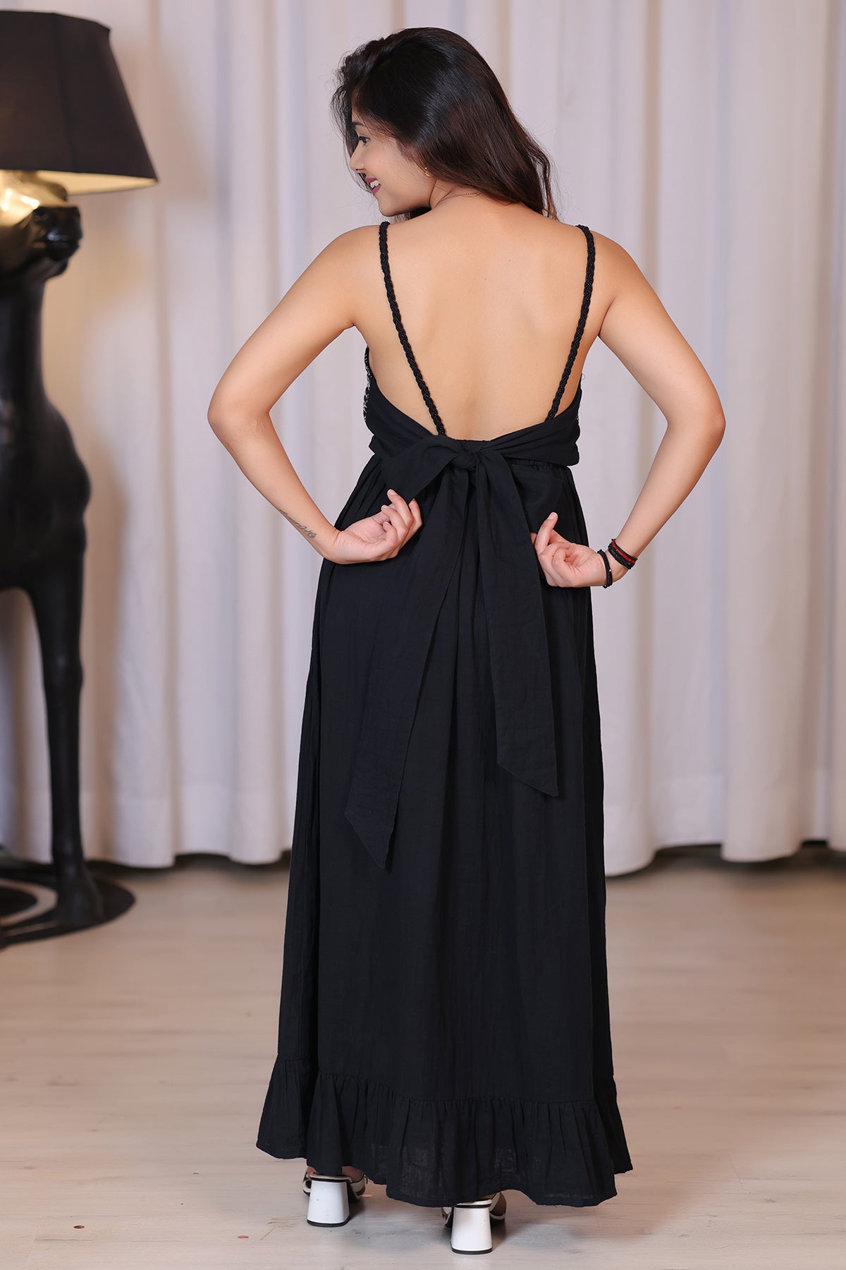 Black double glauze embellished maxi dress with square neck, beads braided shoulder strap and ankle length with flared hem