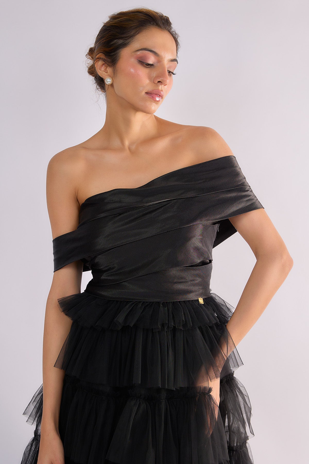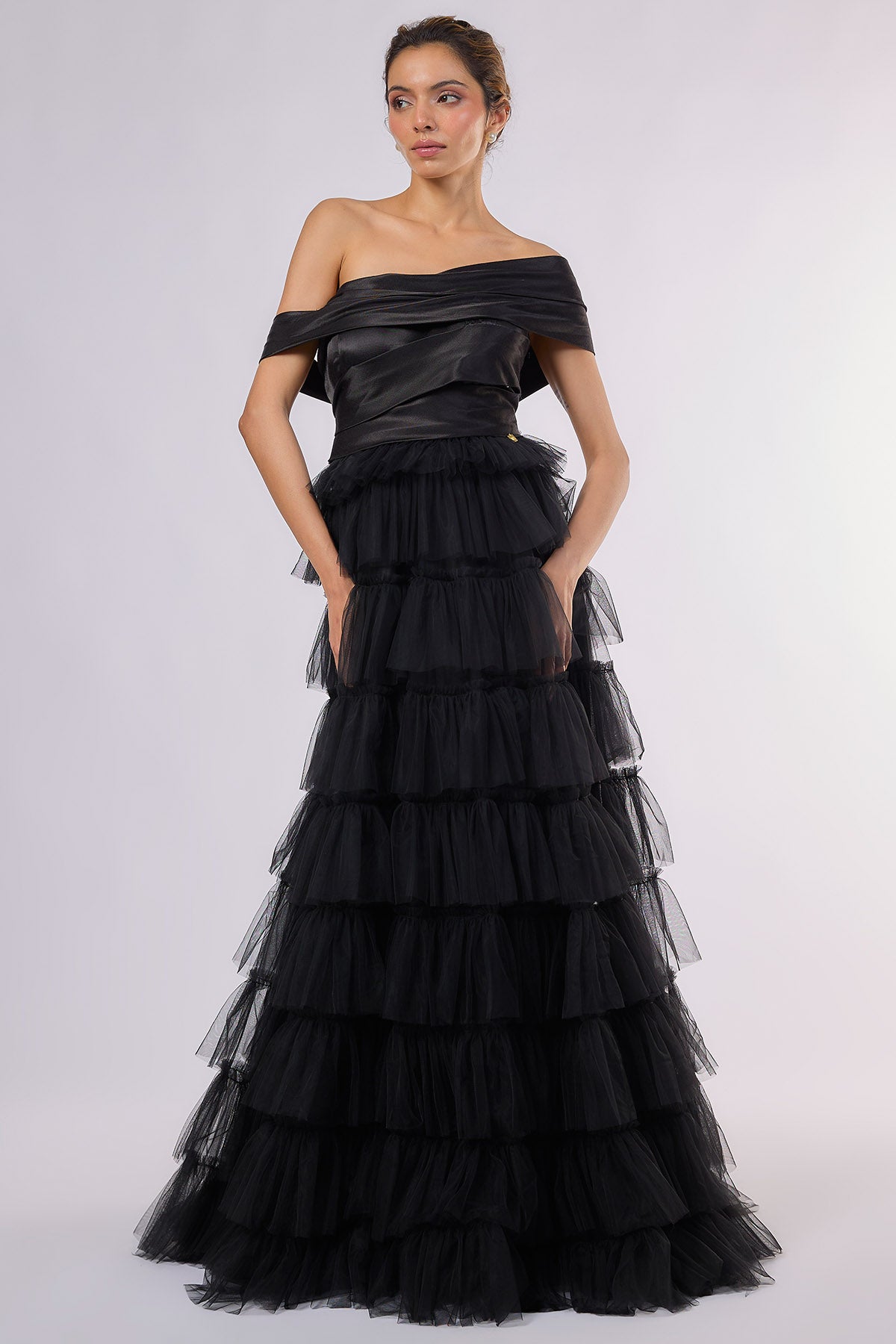 Black mashroo and tulle layered gown with ruffles and off shoulder. This gown has shantoon lining