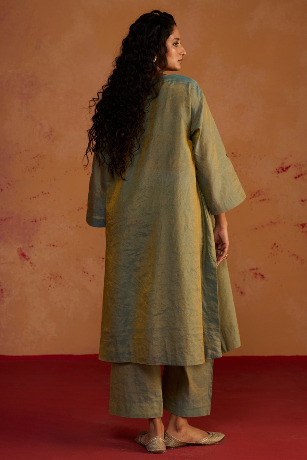 Blue & green banarasi tissue kurta set featuring handwoven kurta and 3/4 sleeves paired with pants and organza zardosi embroidery dupatta