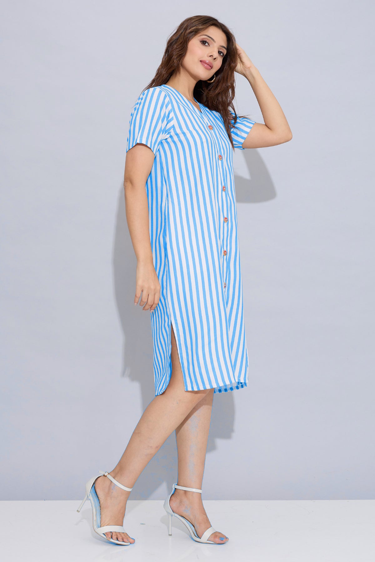 Blue cotton button down dress with stripe pattern, wooden buttons, half sleeves, pockets and v-neck. The length of the dress is 39 inches