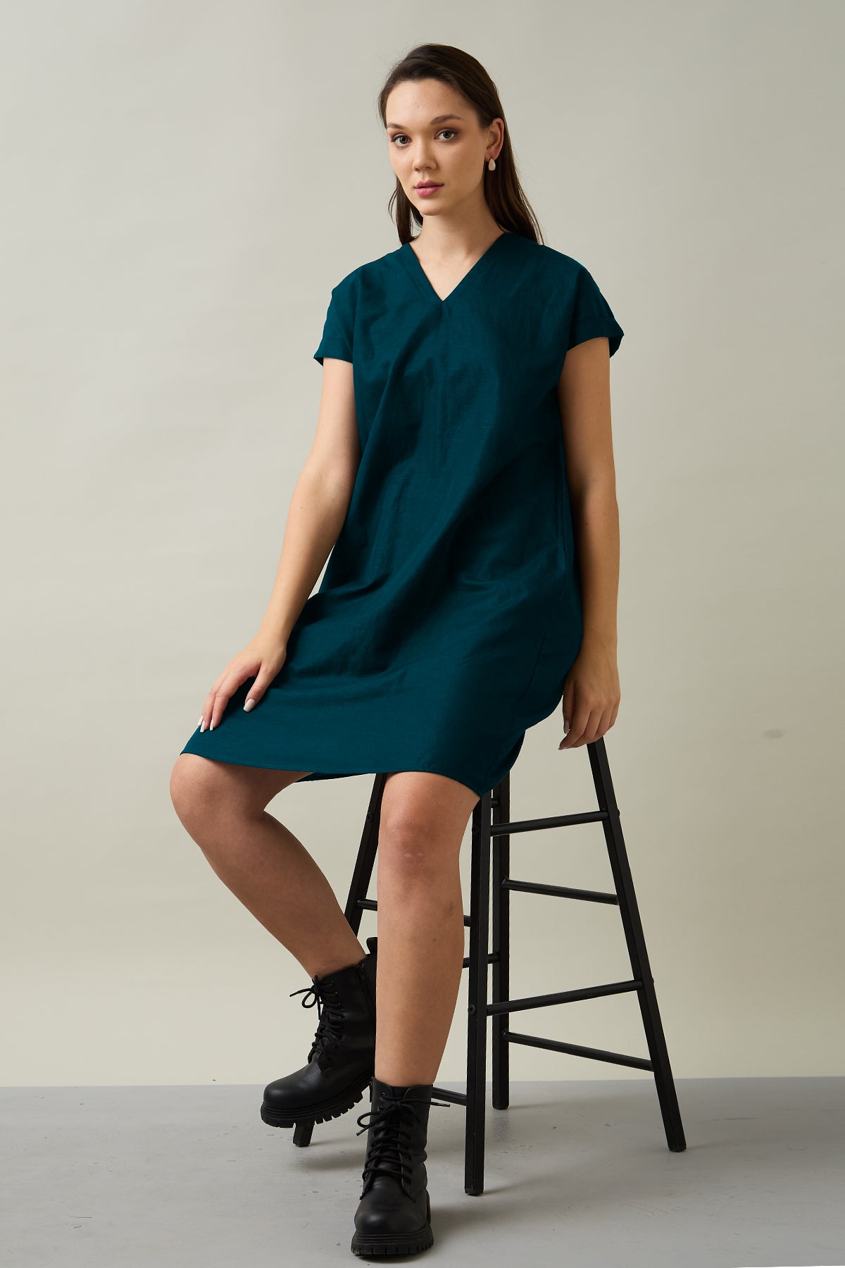 Teal blue cotton linen straight mini dress with v-neck and folded half sleeves. The length of the dress is 38 inches