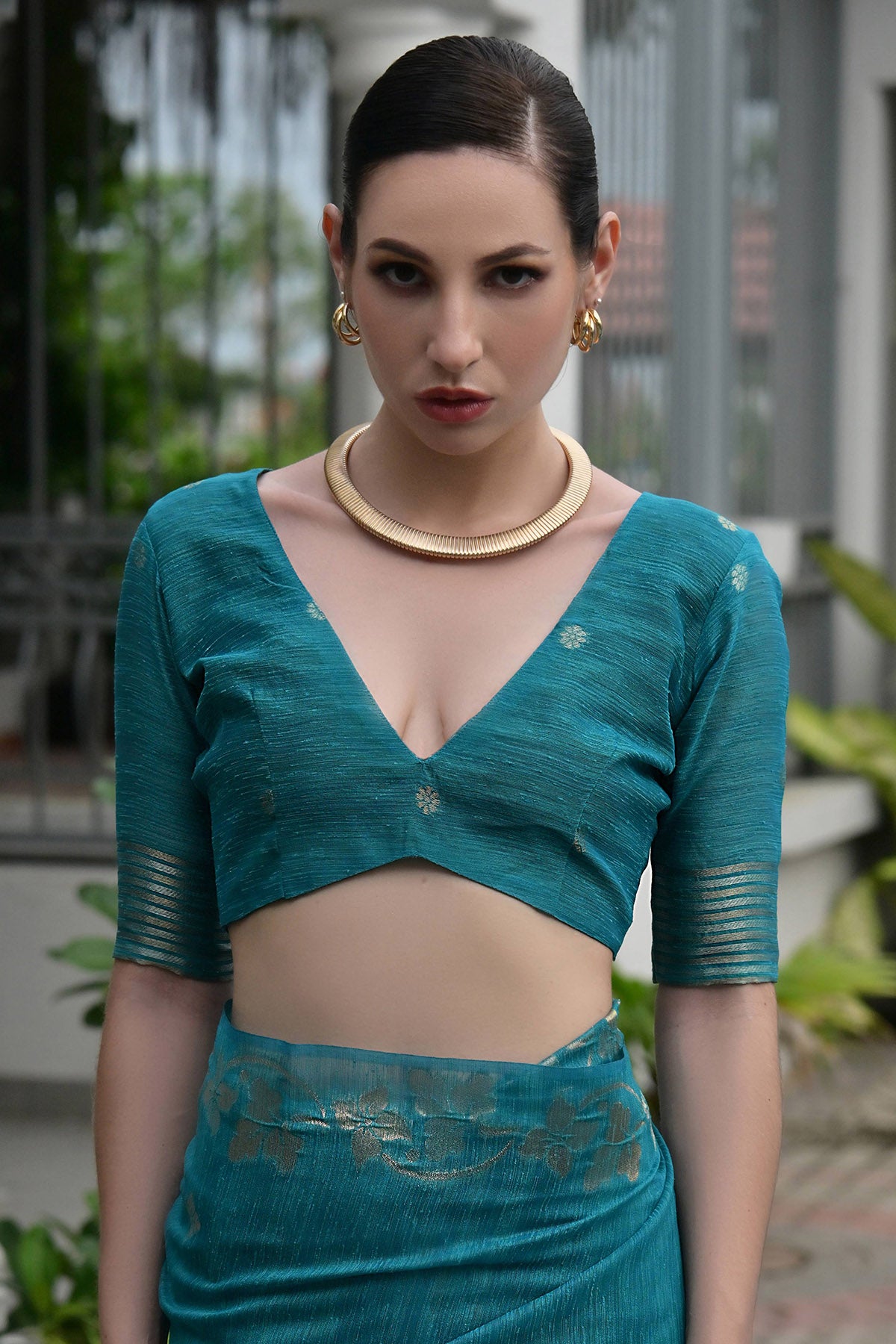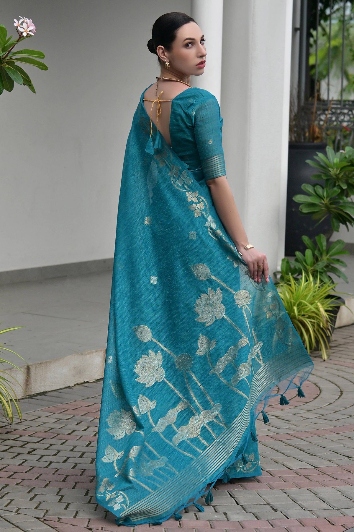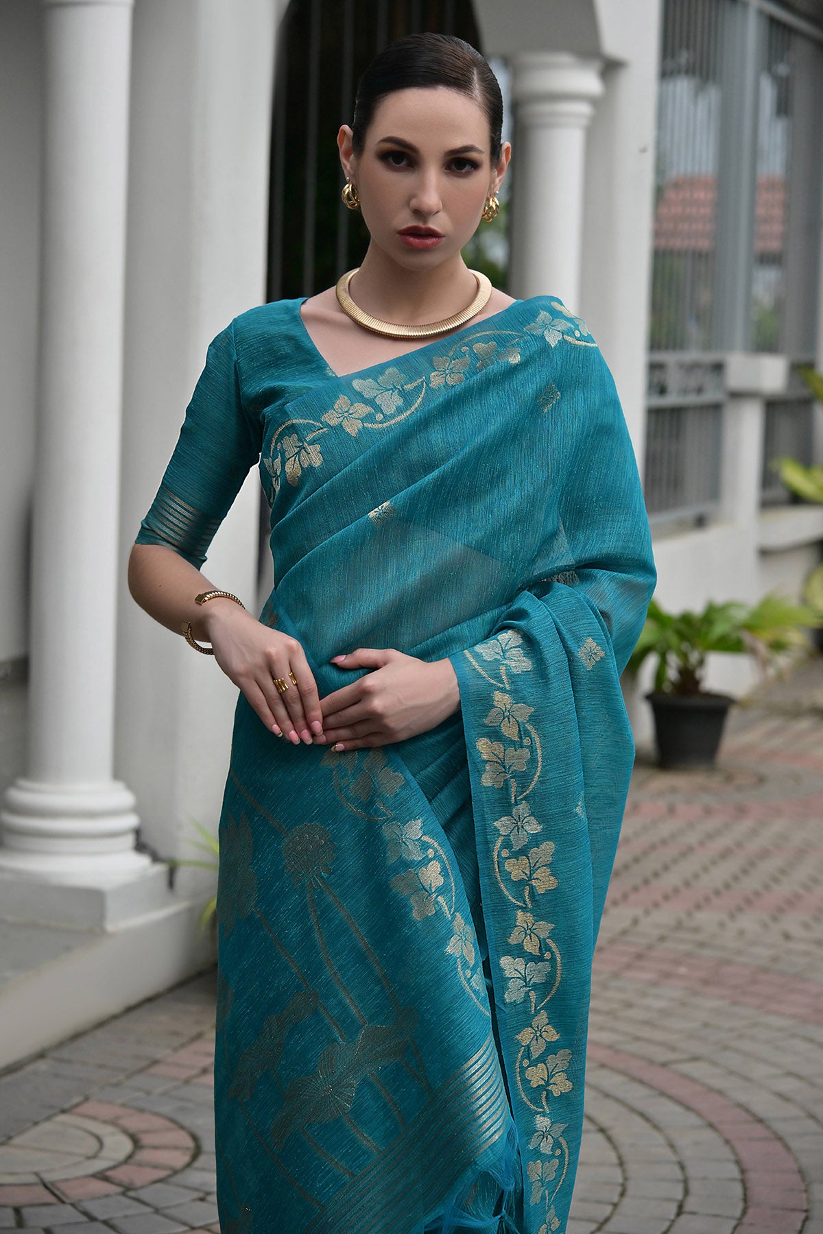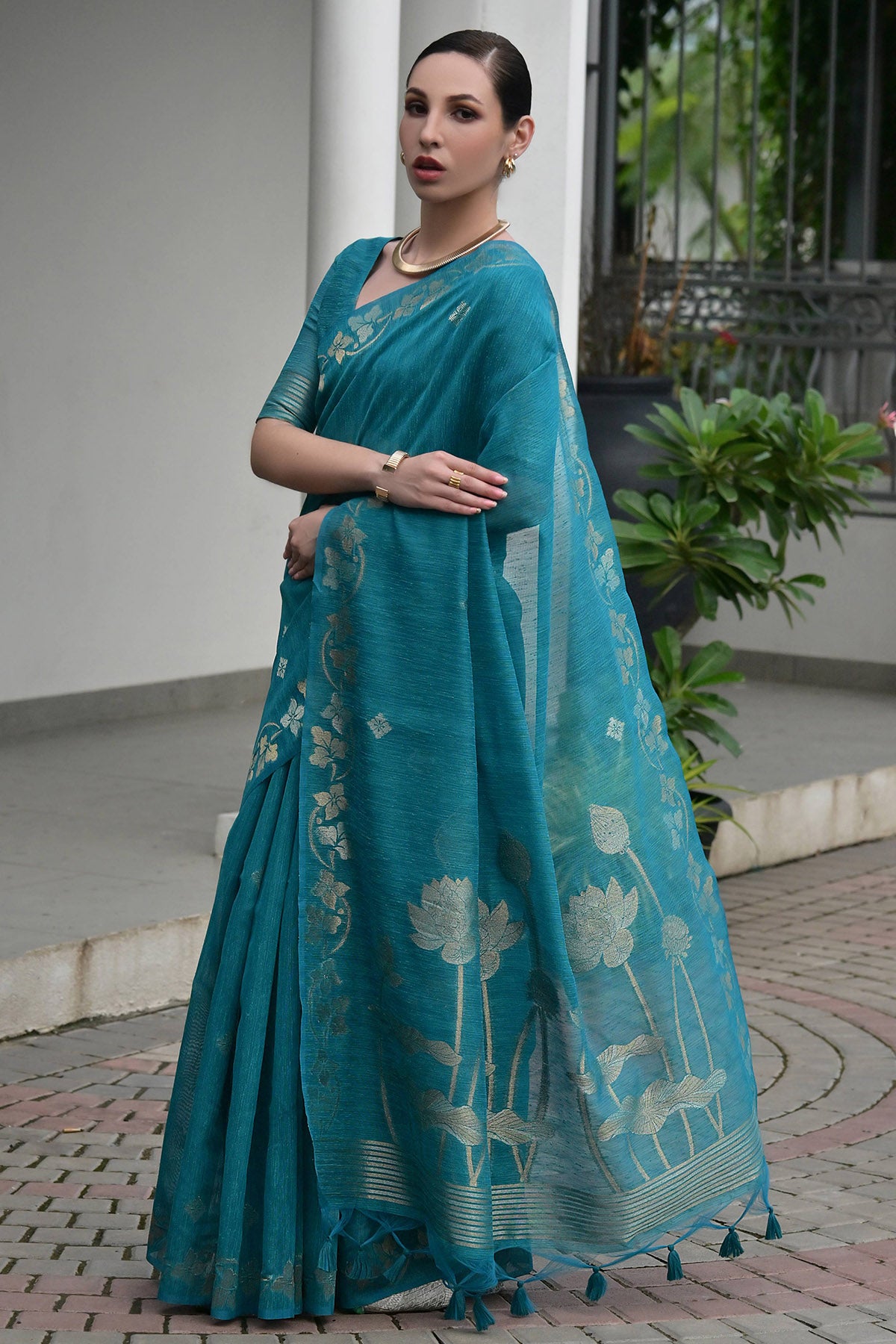 Buy Firozi Linen Silk Woven Saree for women by Lili Lala Designer online available at scrollnshops