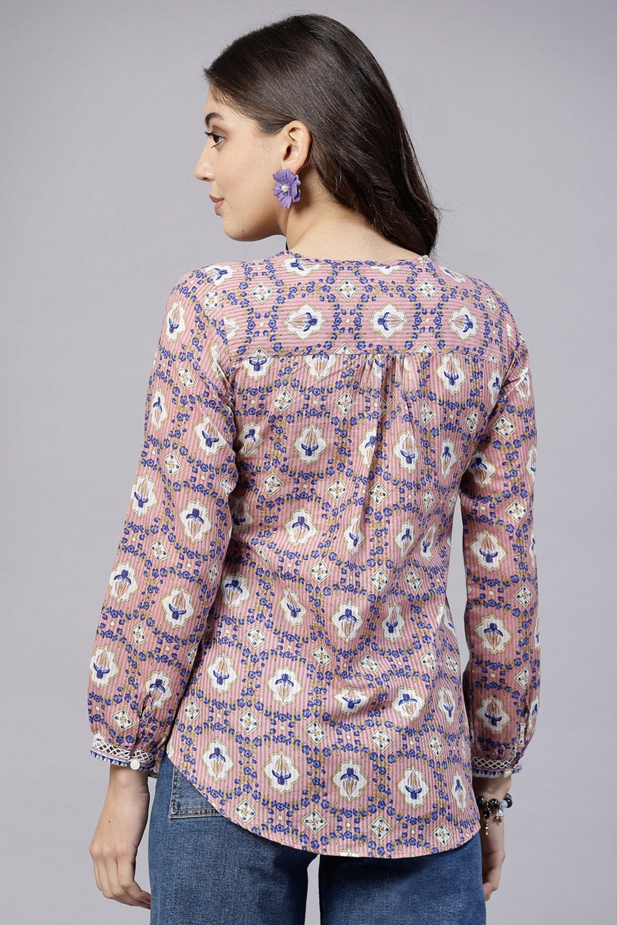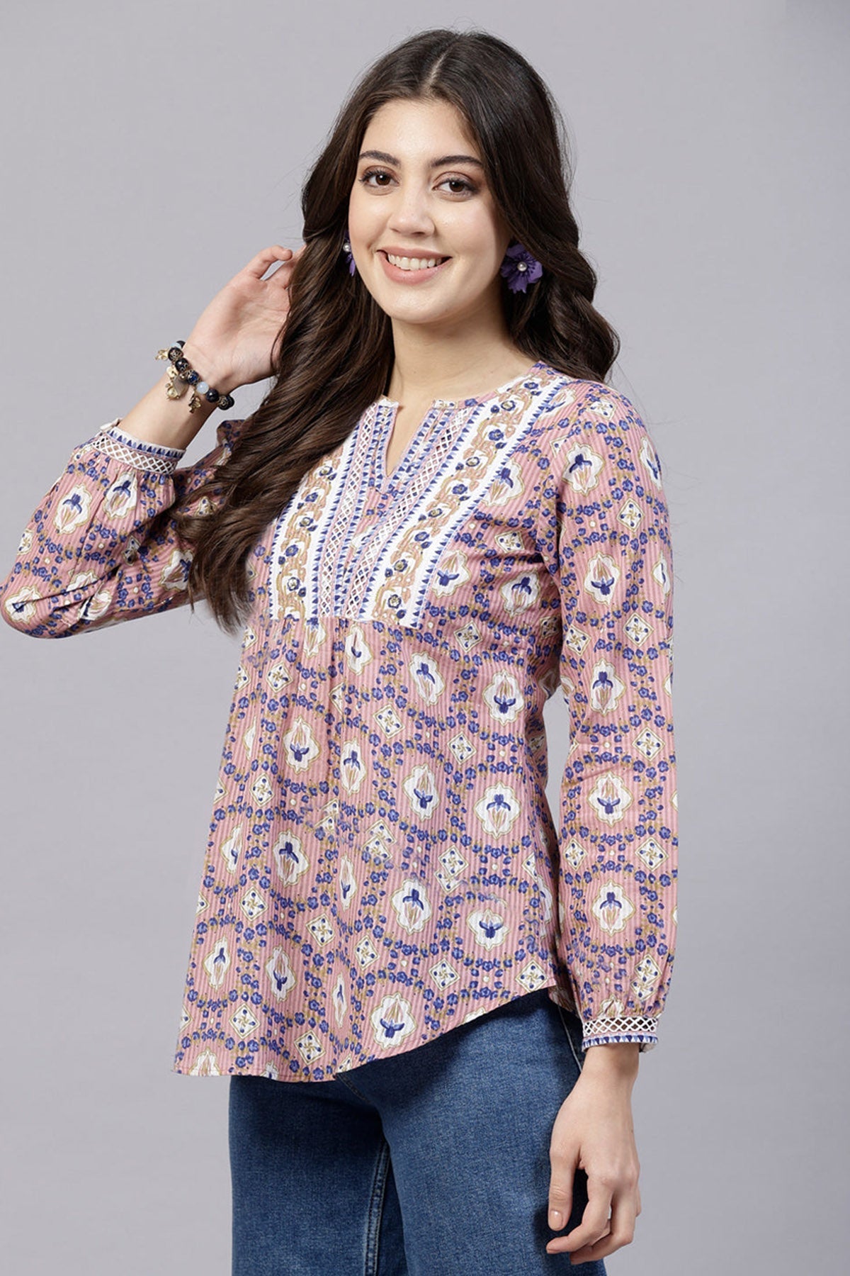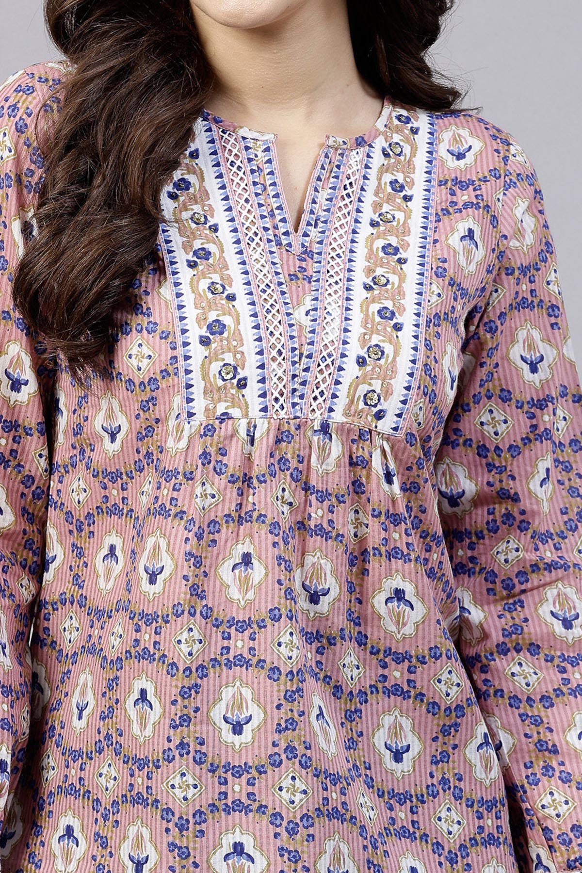 Fondant pink pure cotton floral printed top with lace inserts and embellished yoke