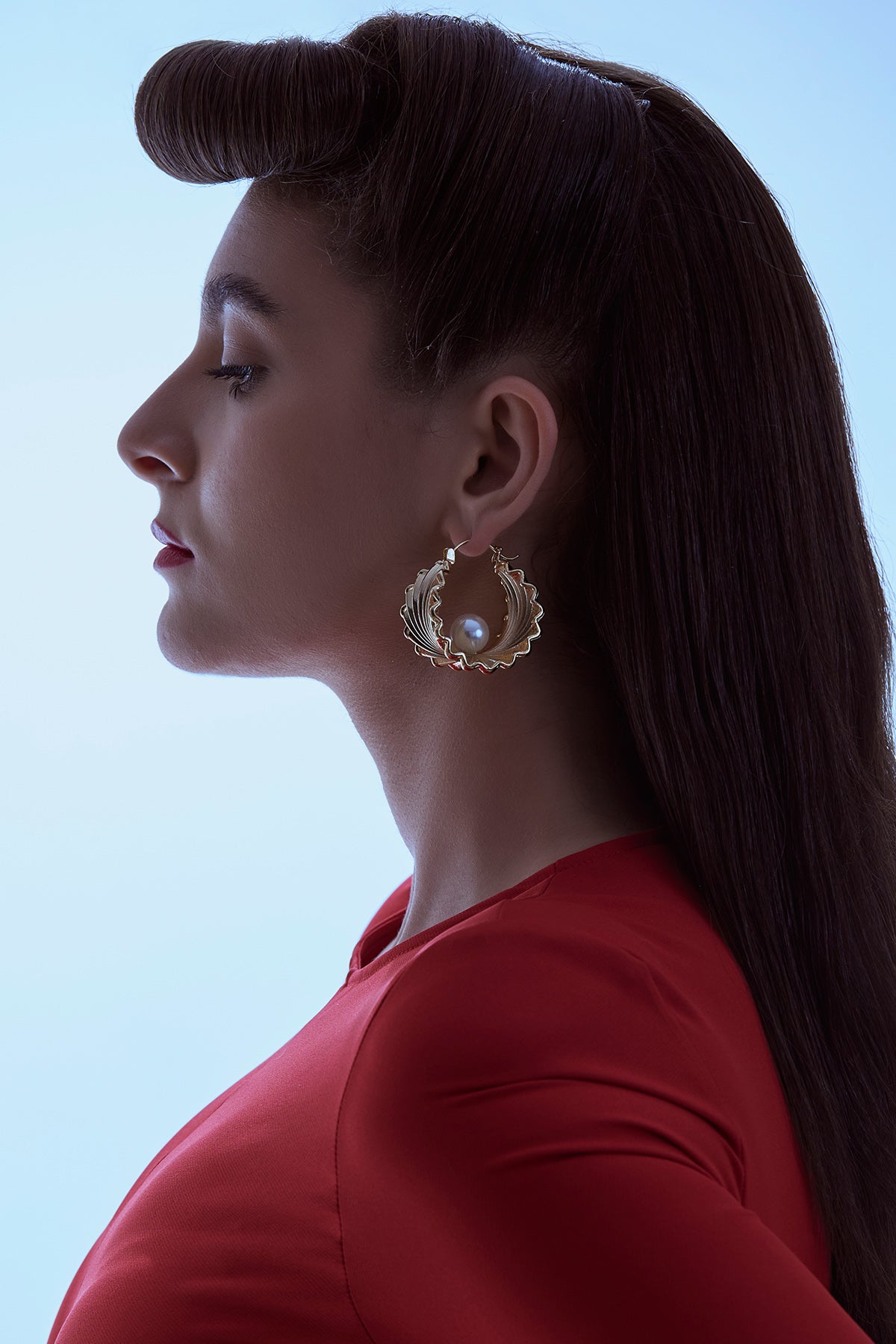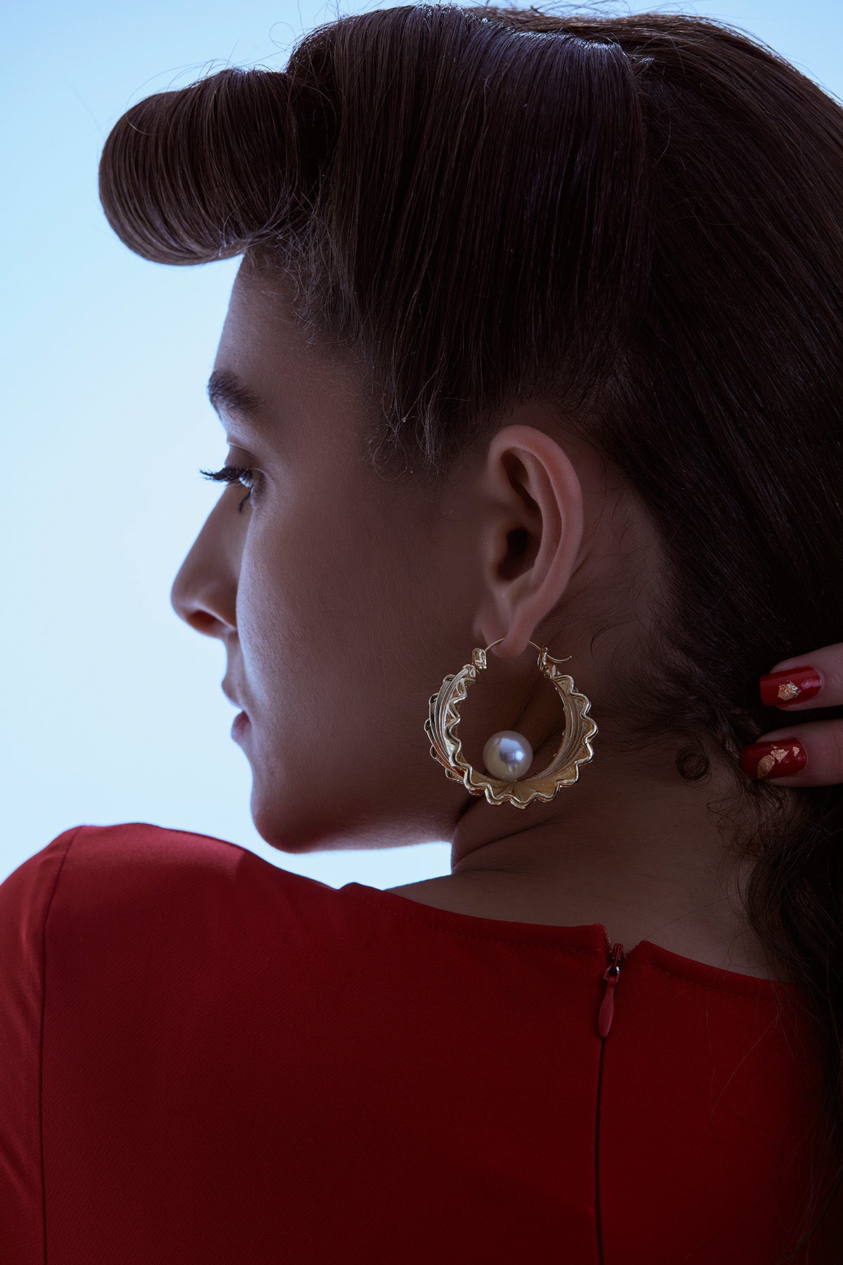 Golden brass hoop earrings with single pearl style. The dimension is 3H, 5L, 3W