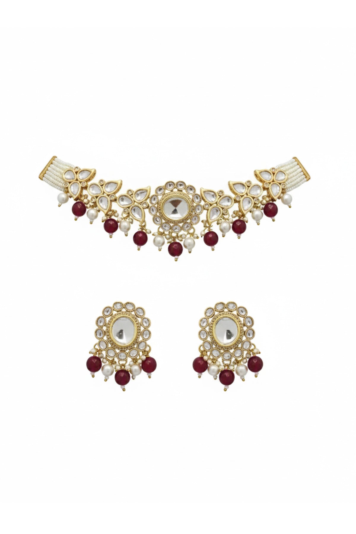 Gold plated regal ruby jewellery set with kundan pearl and beads earring and beaded kundan necklace
