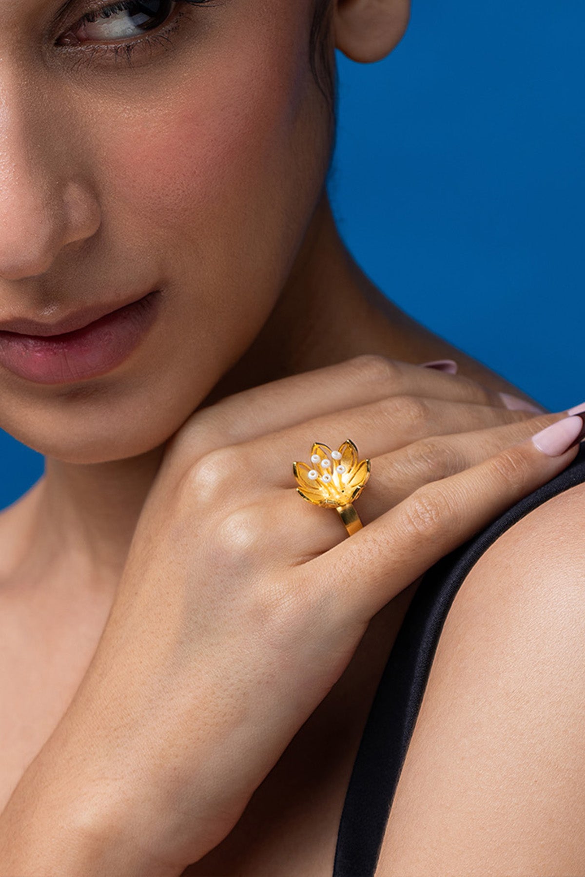 Buy Golden Brass Pearl Flower Ring for women by Ethnic Andaz online available at scrollnshops