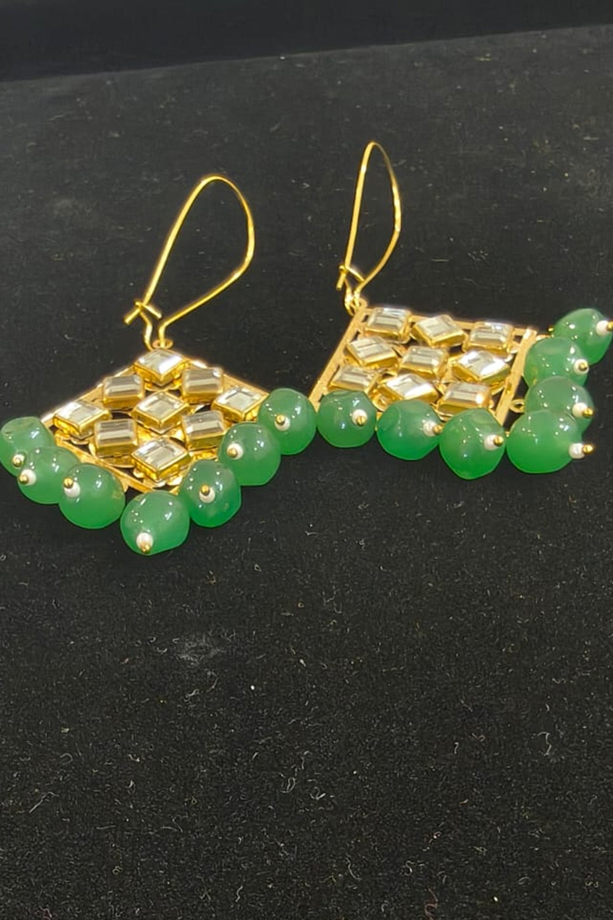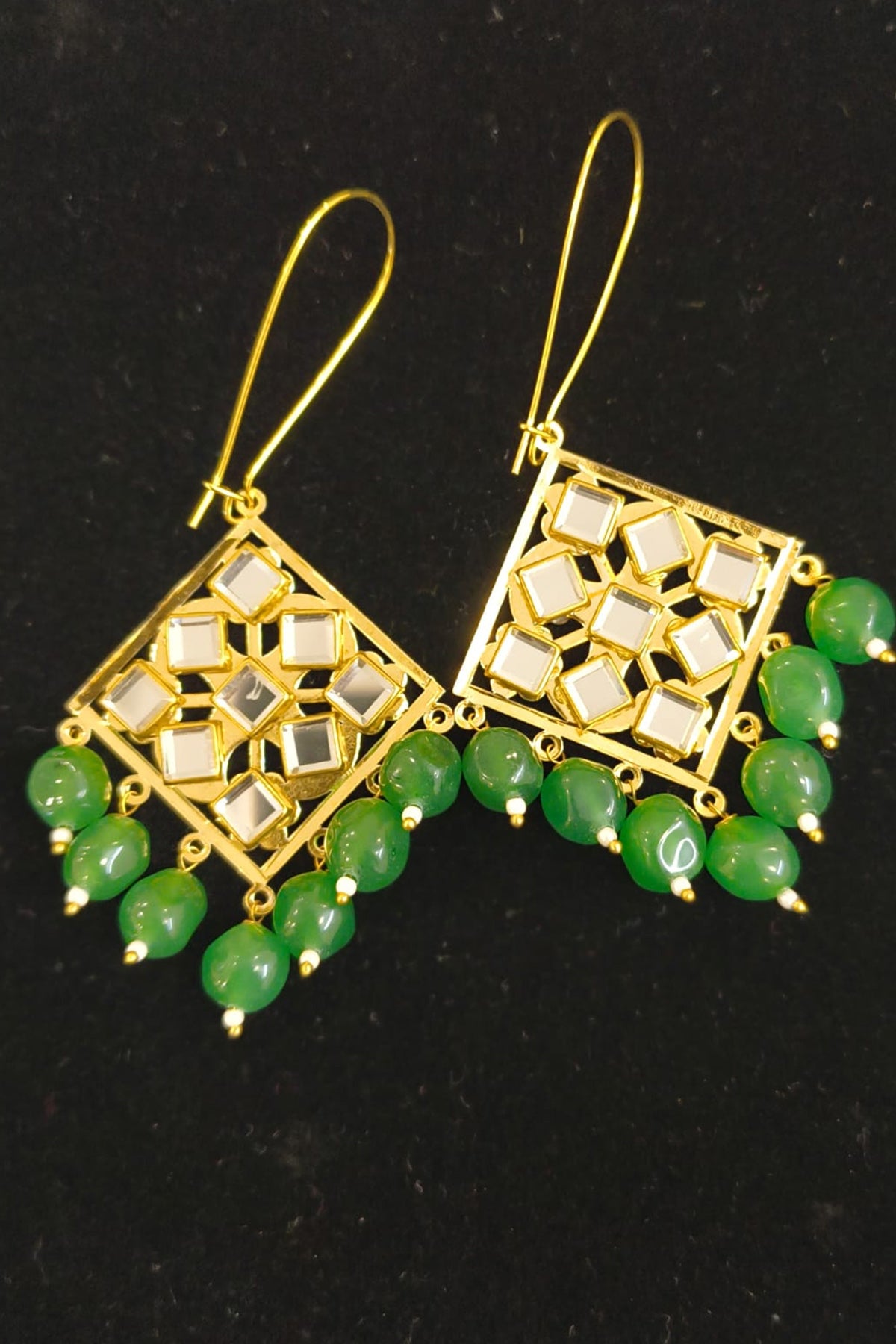 Gold plated mirror mosaic earrings with lustrous green bead drops, square shaped design, embedded with reflective mirror and pearl work