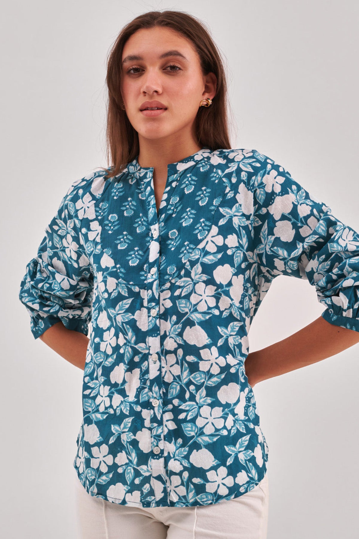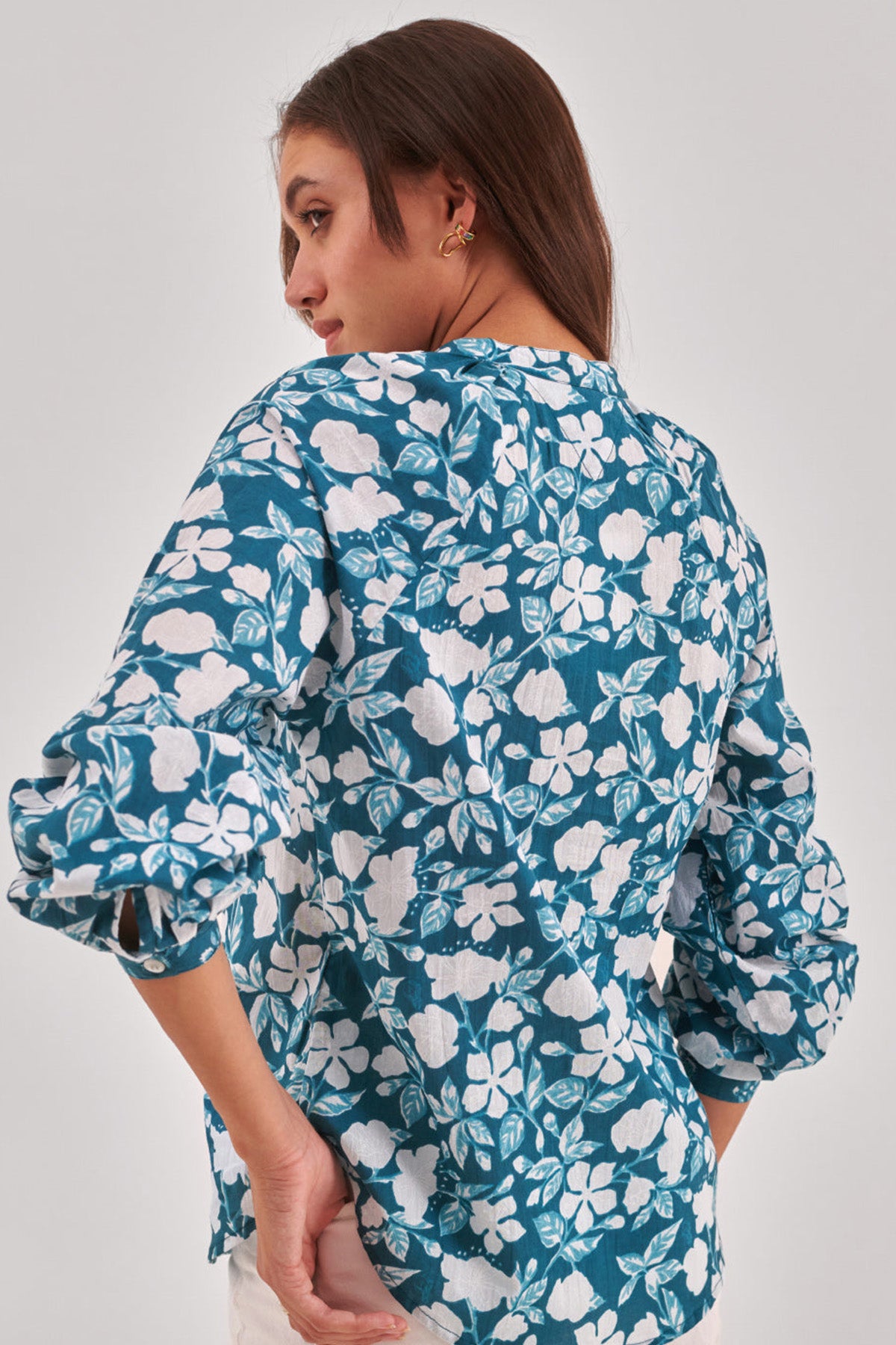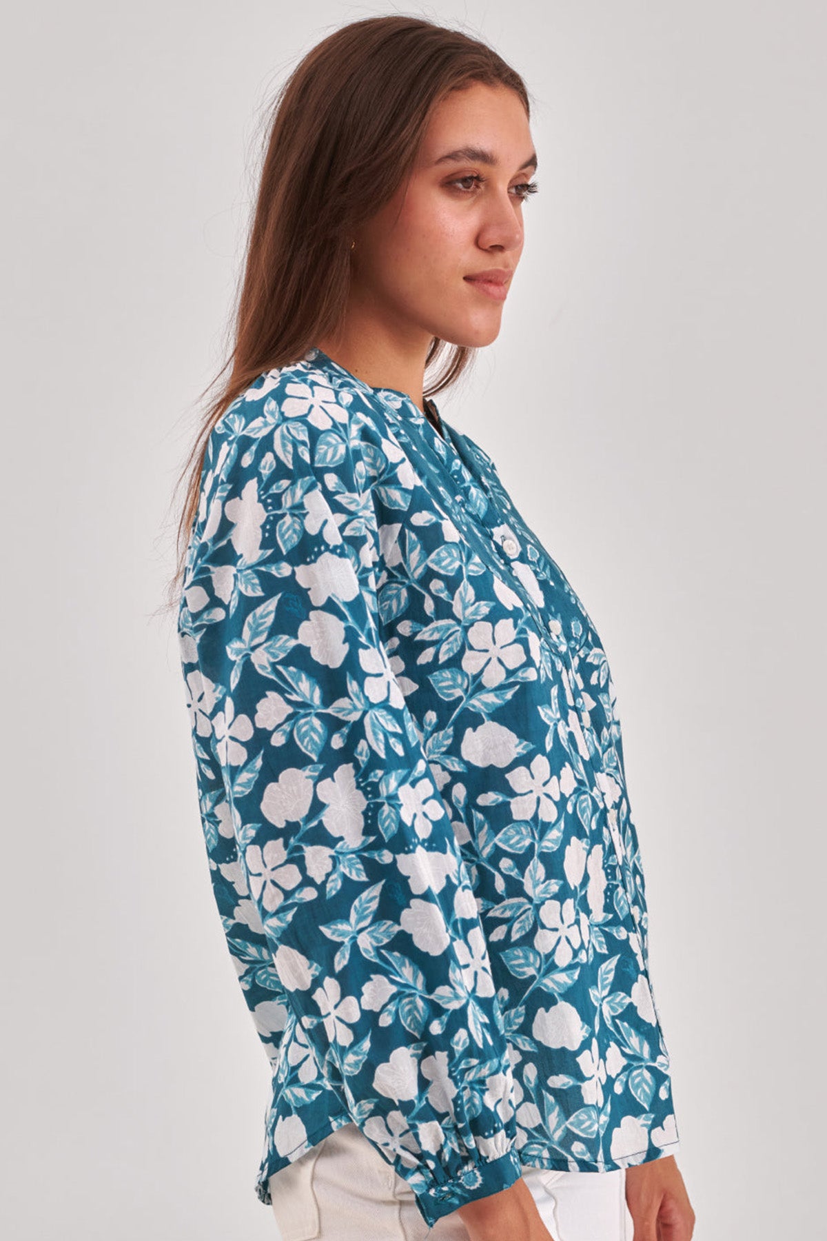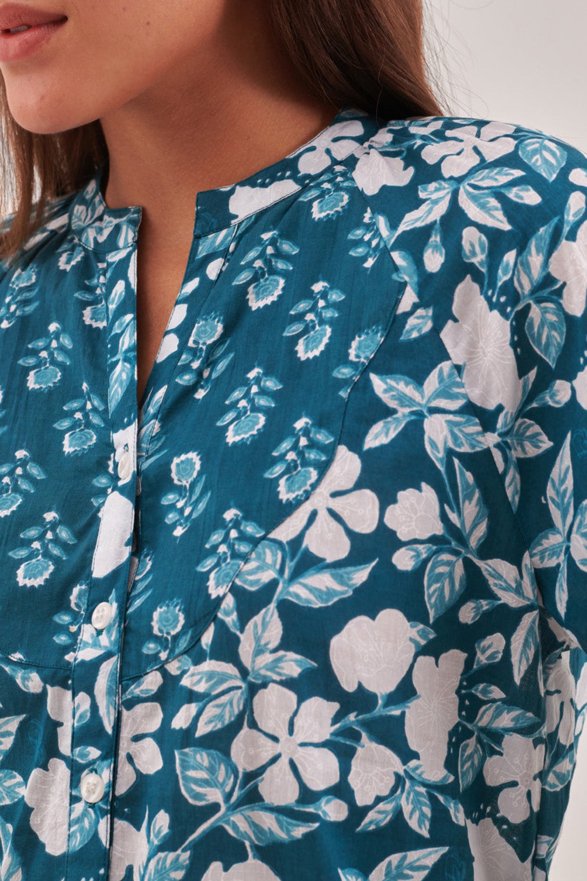 Midnight green floral printed shirt style top with long sleeves and button closure