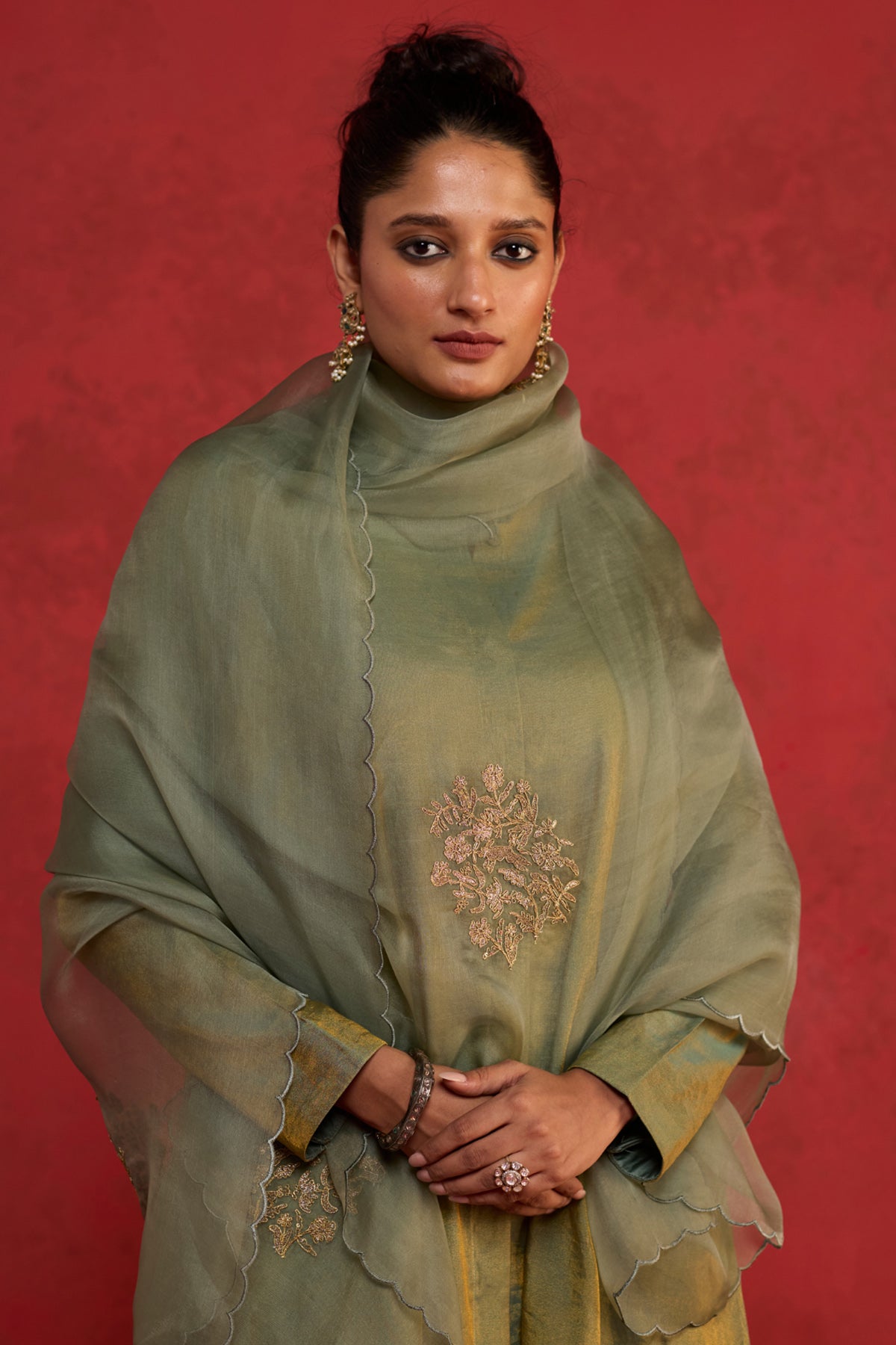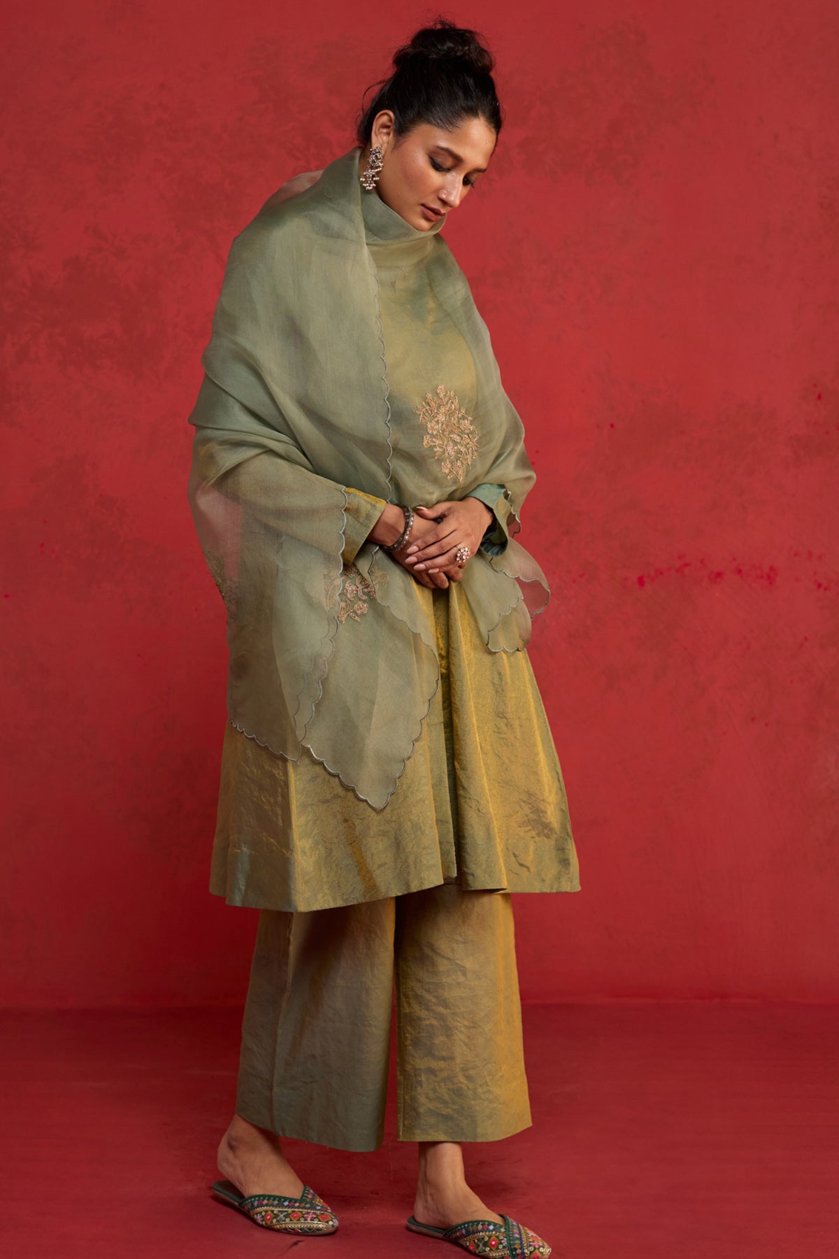 Sage silk kurta set featuring hadwoven kurta with full sleeves and button up placket paired with straight pants and organza hand embroidery dupatta