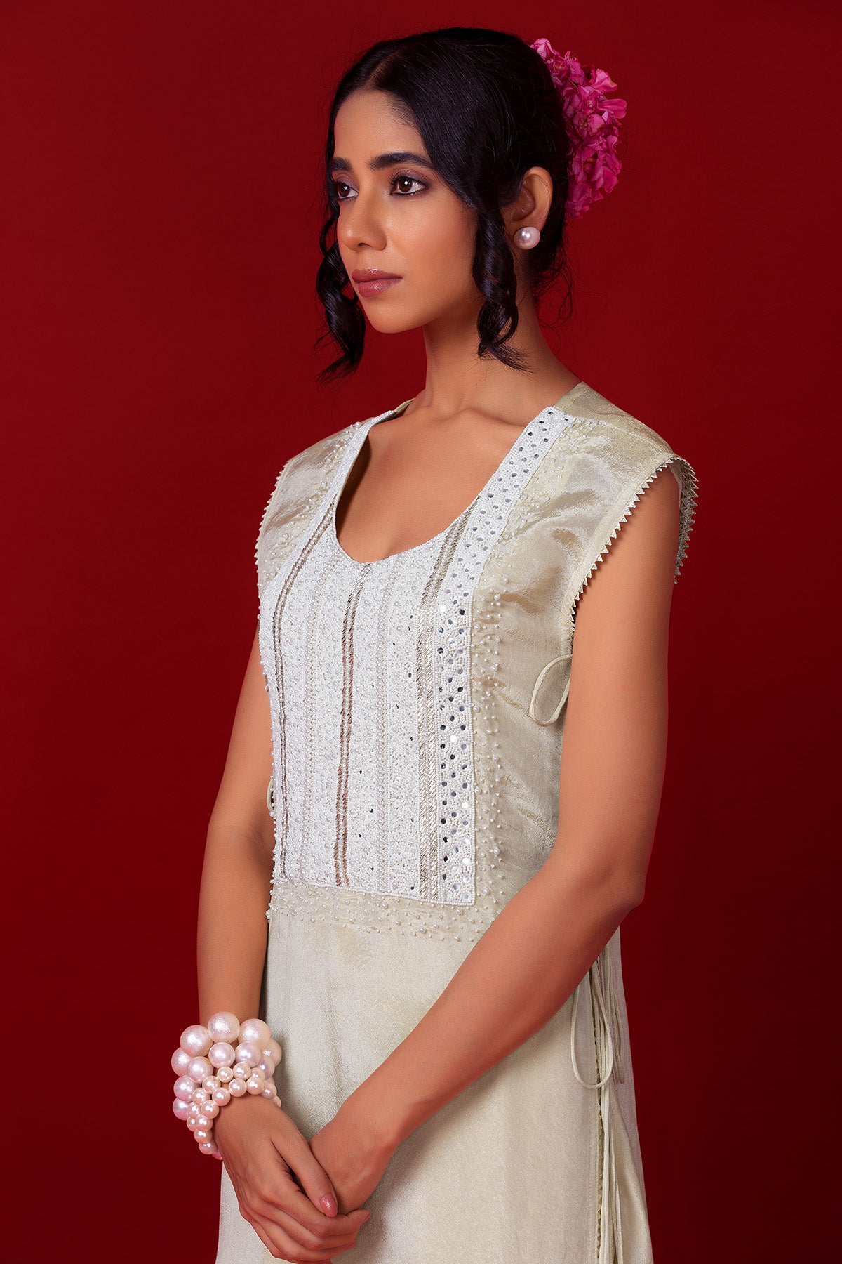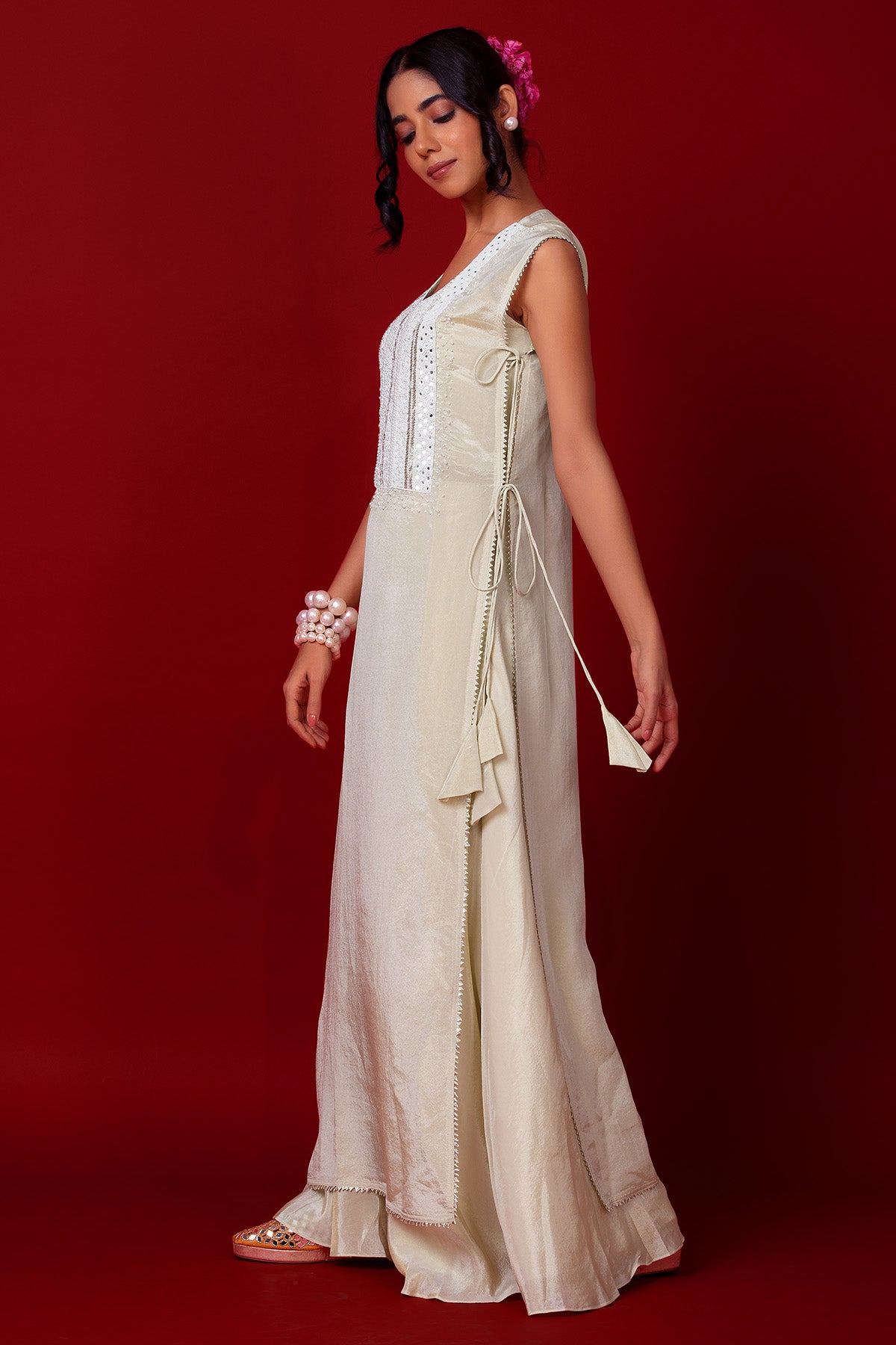 Ivory golden pure shimmer tissue kurta set featuring round neck sleeveless kurta with bustier inner, long tie up jacket, pearl work paired with sharara pants