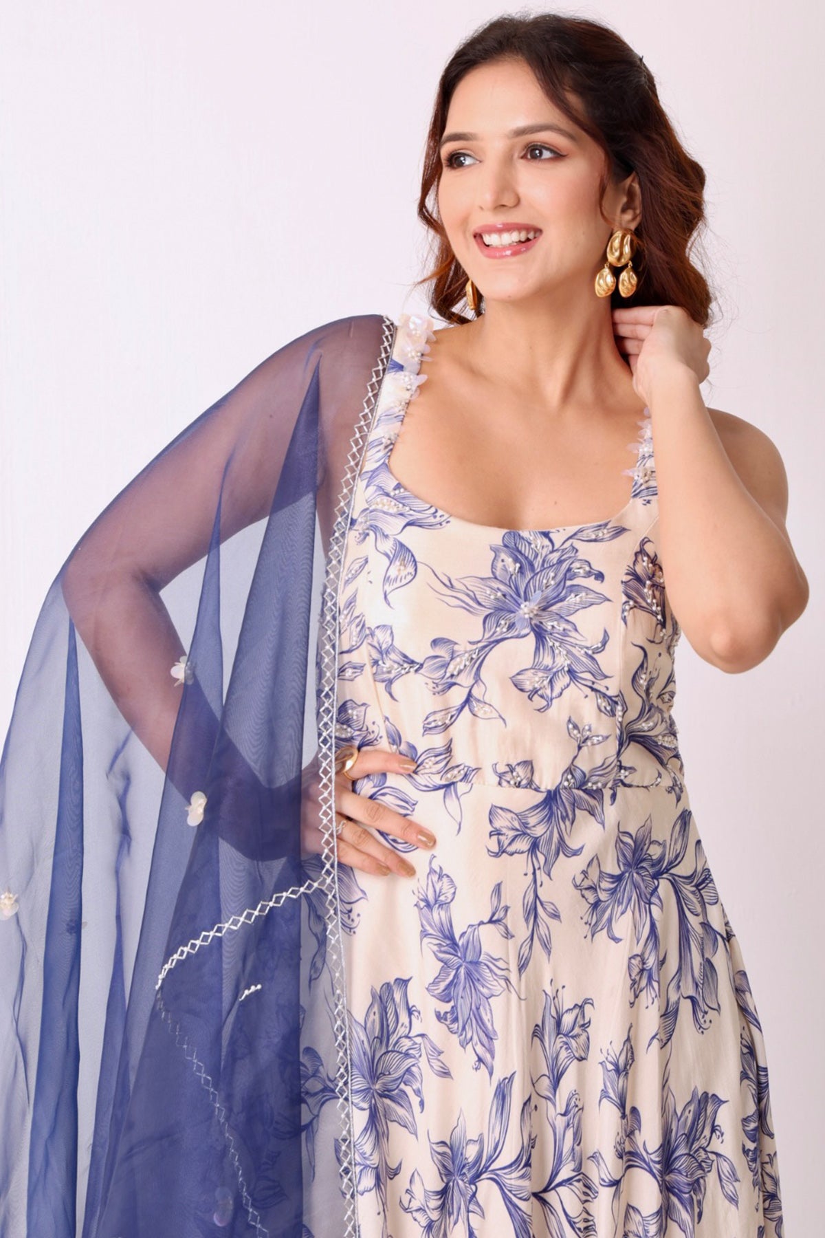 Ivory navy blue silk and organza anarkali set featuring hand embroidery floral anarkali with sleeveless and pearl work paired with matching dupatta