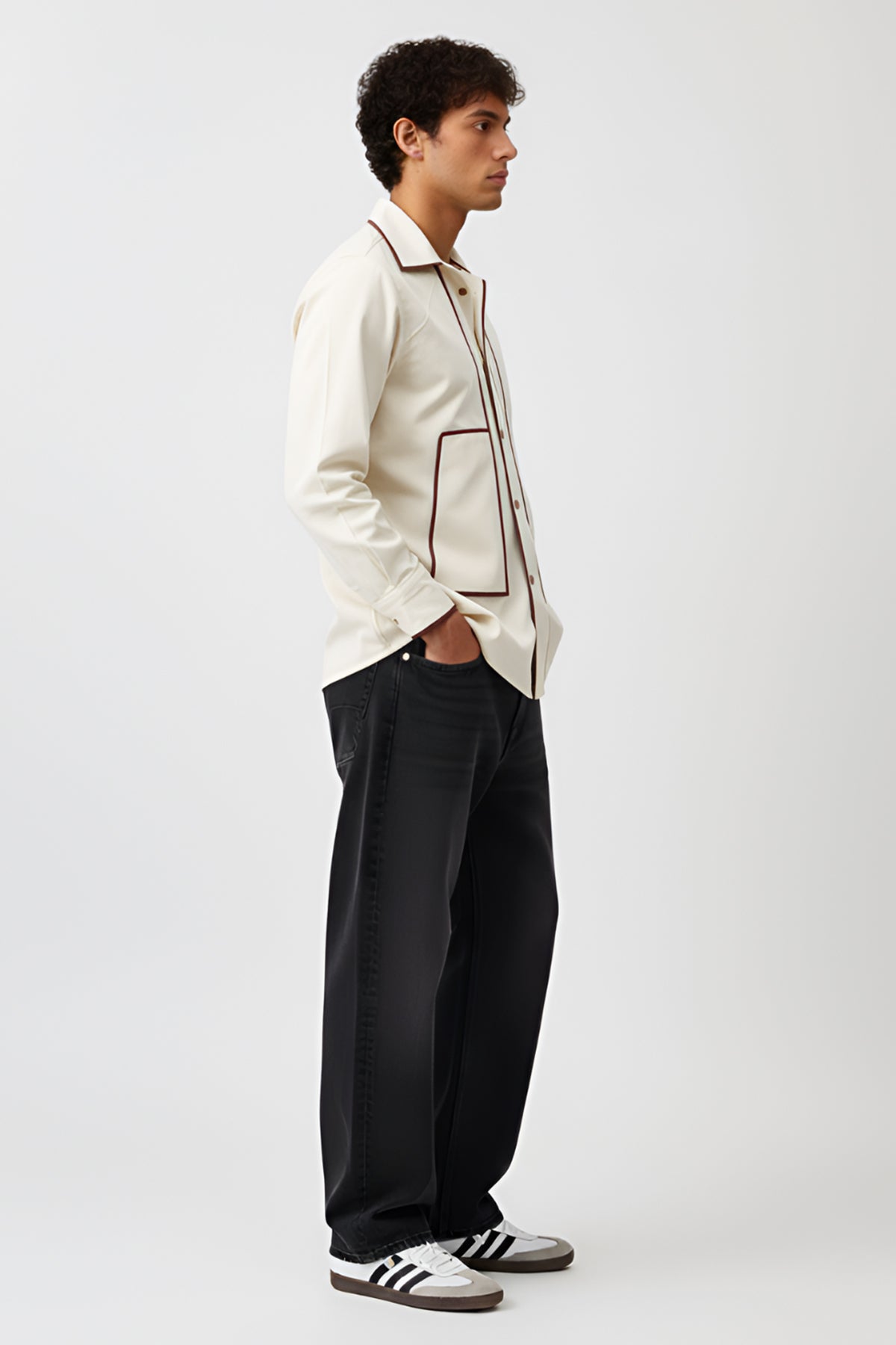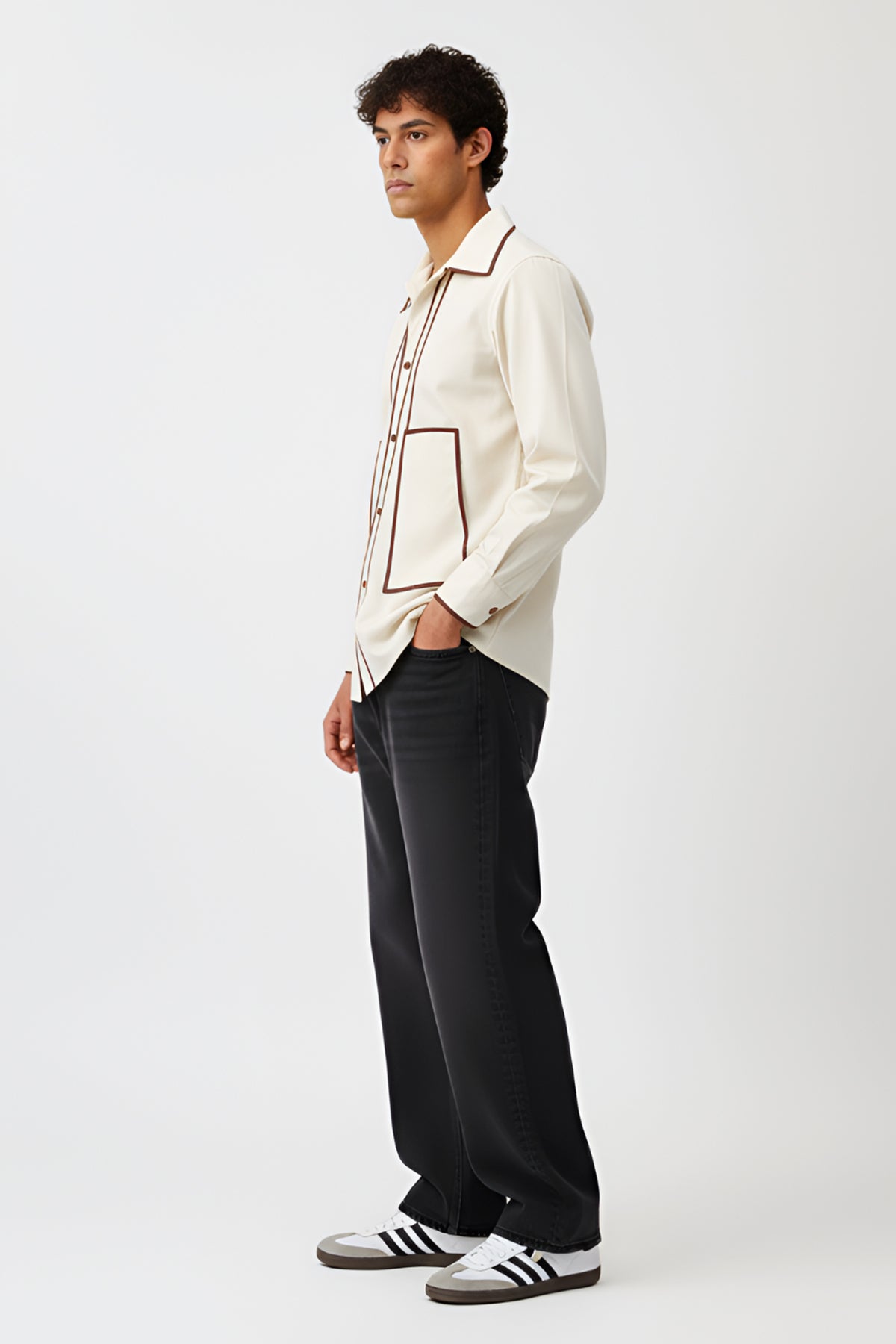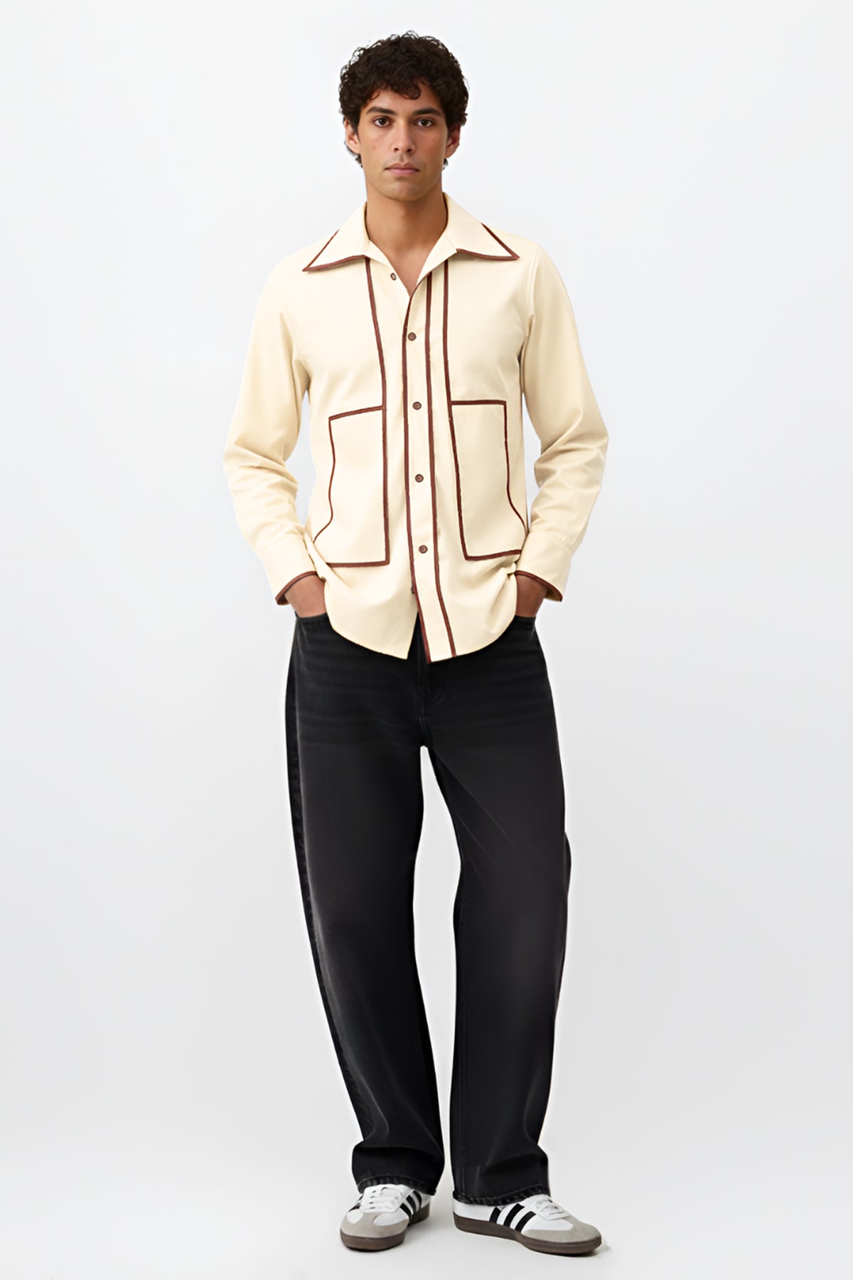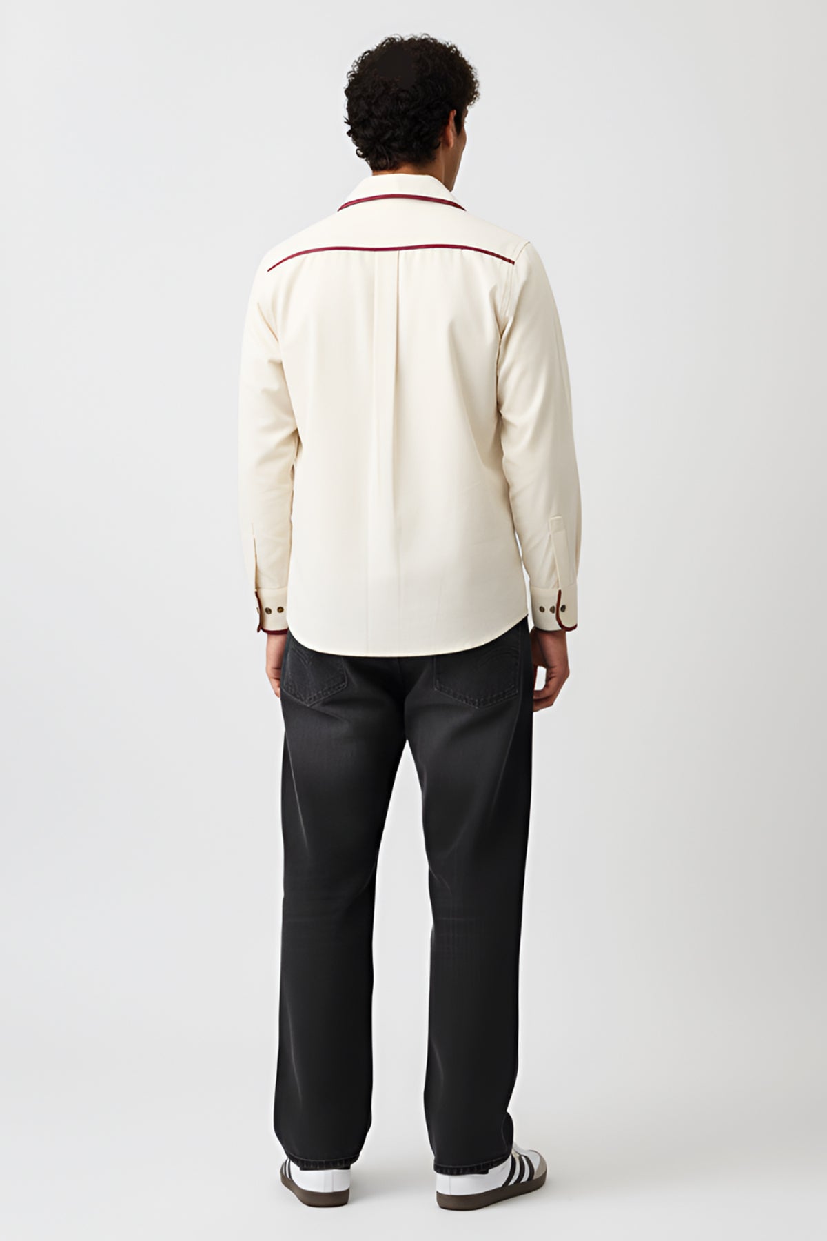 Ivory and tuscan red twill shirt featuring classic collar, button, full sleeves, two shoulder flaps with pockets and stripe details on the front