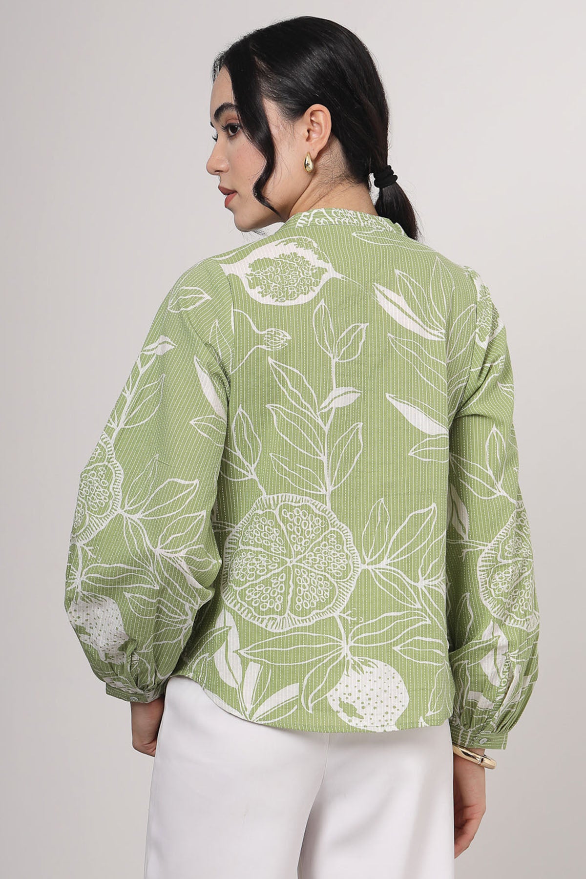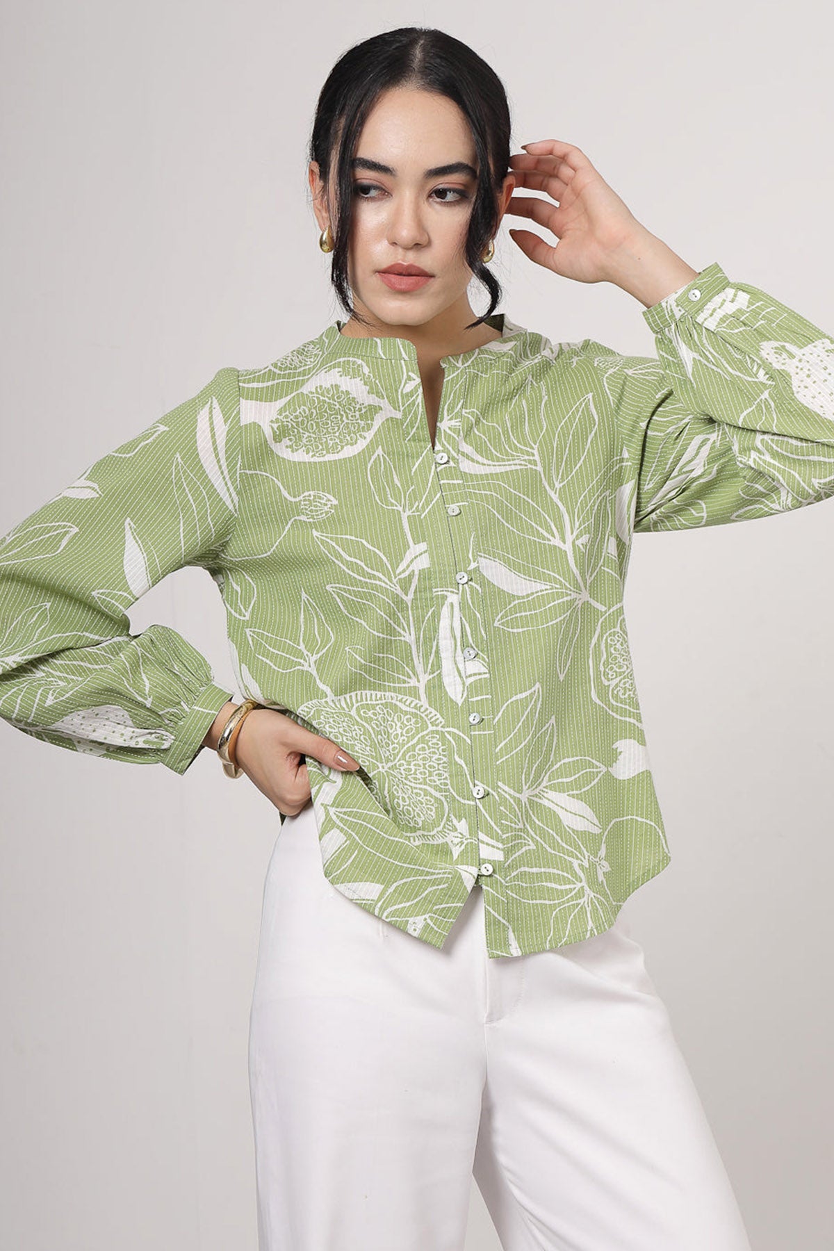 Light green 100% pure cotton floral printed top with full sleeves, mandarin collar and button closure for relaxed fit