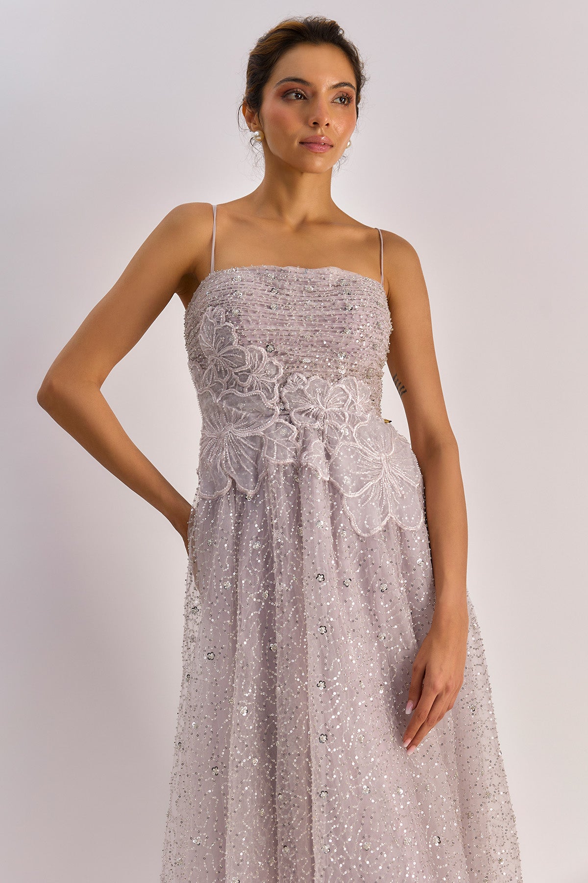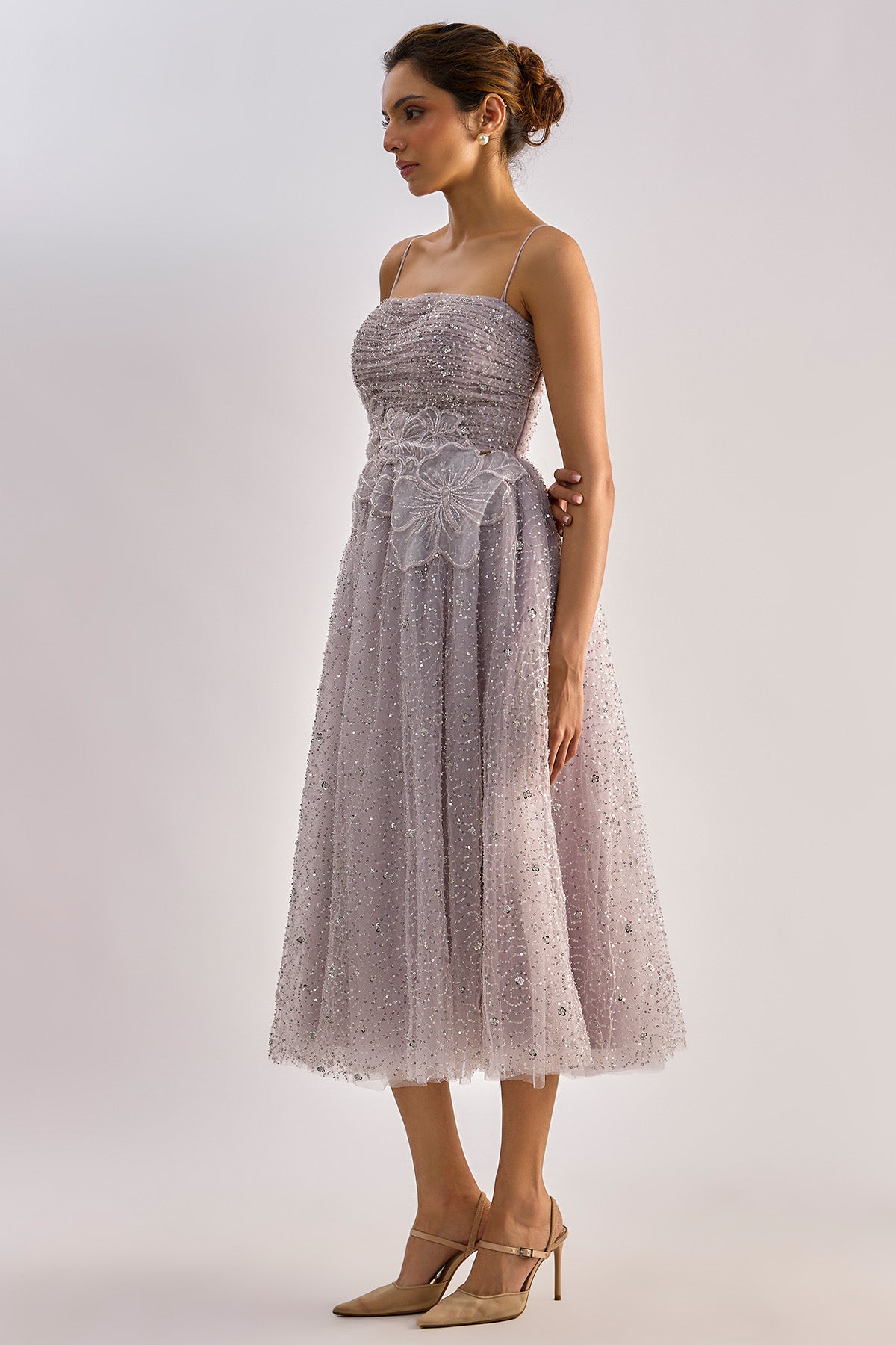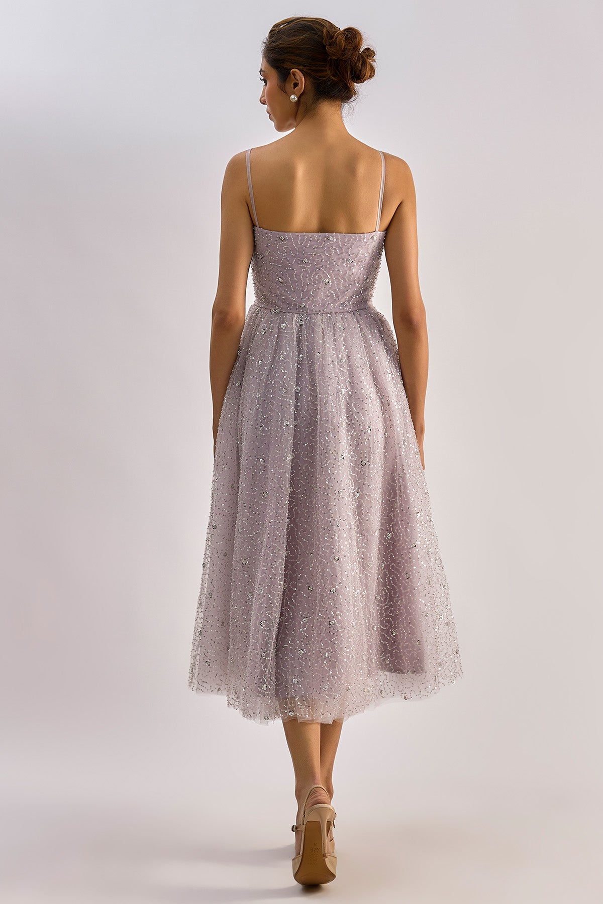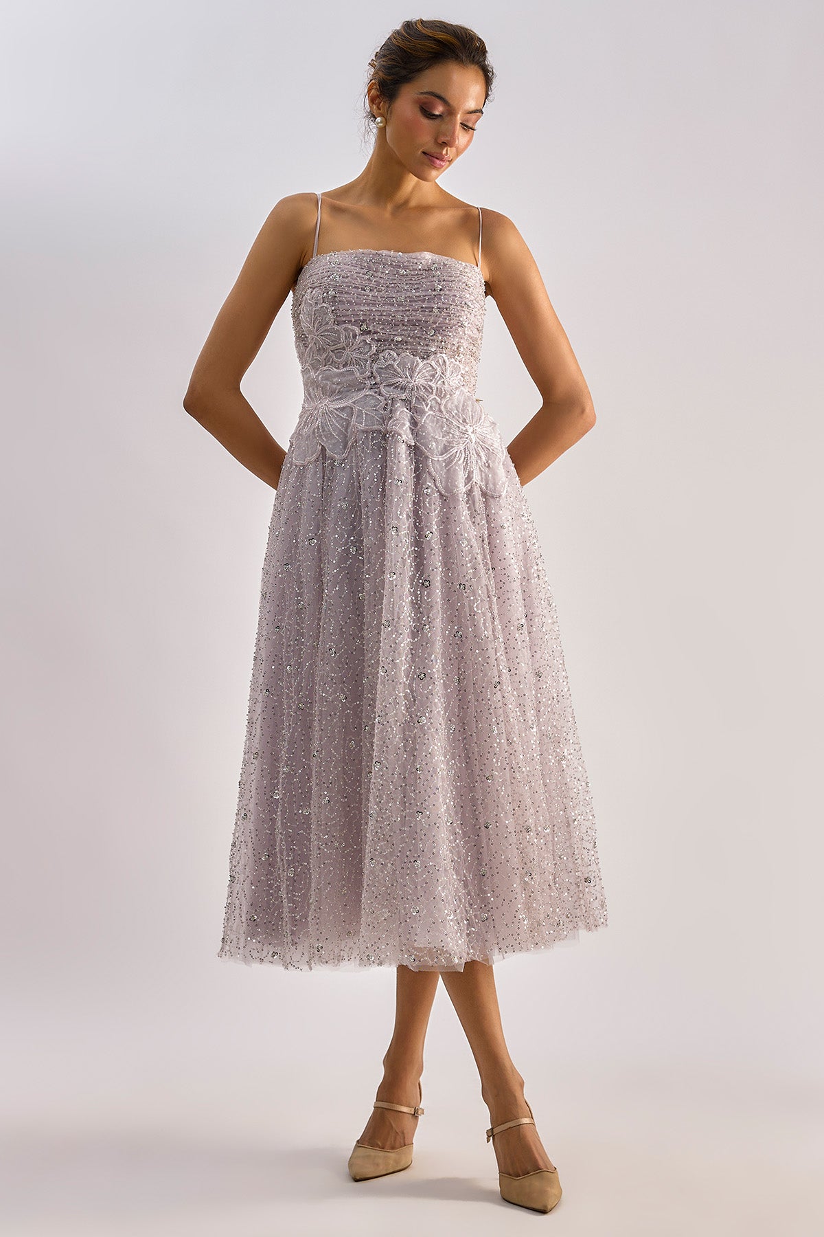 Lilac tulle flared midi dress with embellished floral detailing and beads work. This dress has shantoon lining