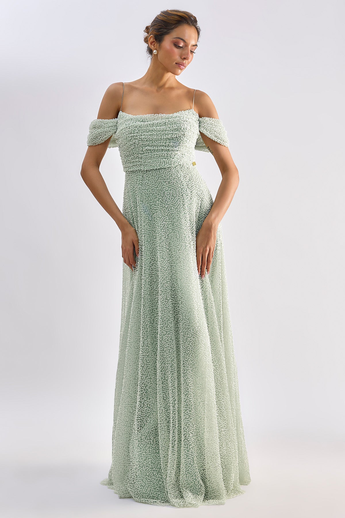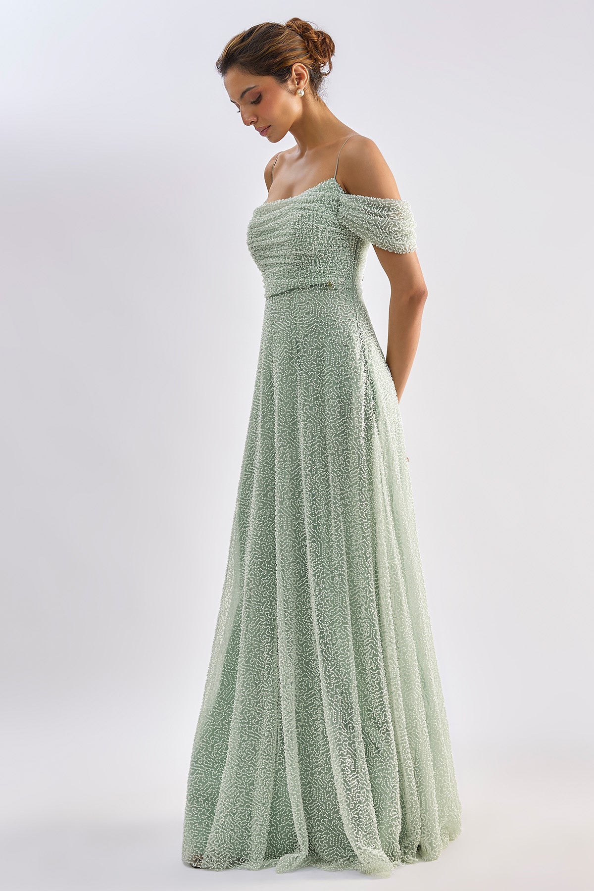 Mint tulle embellished gown with elegant ruching and beads embroidery work. This gown has shantoon lining