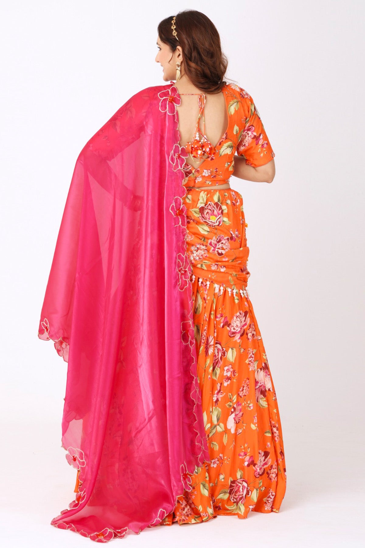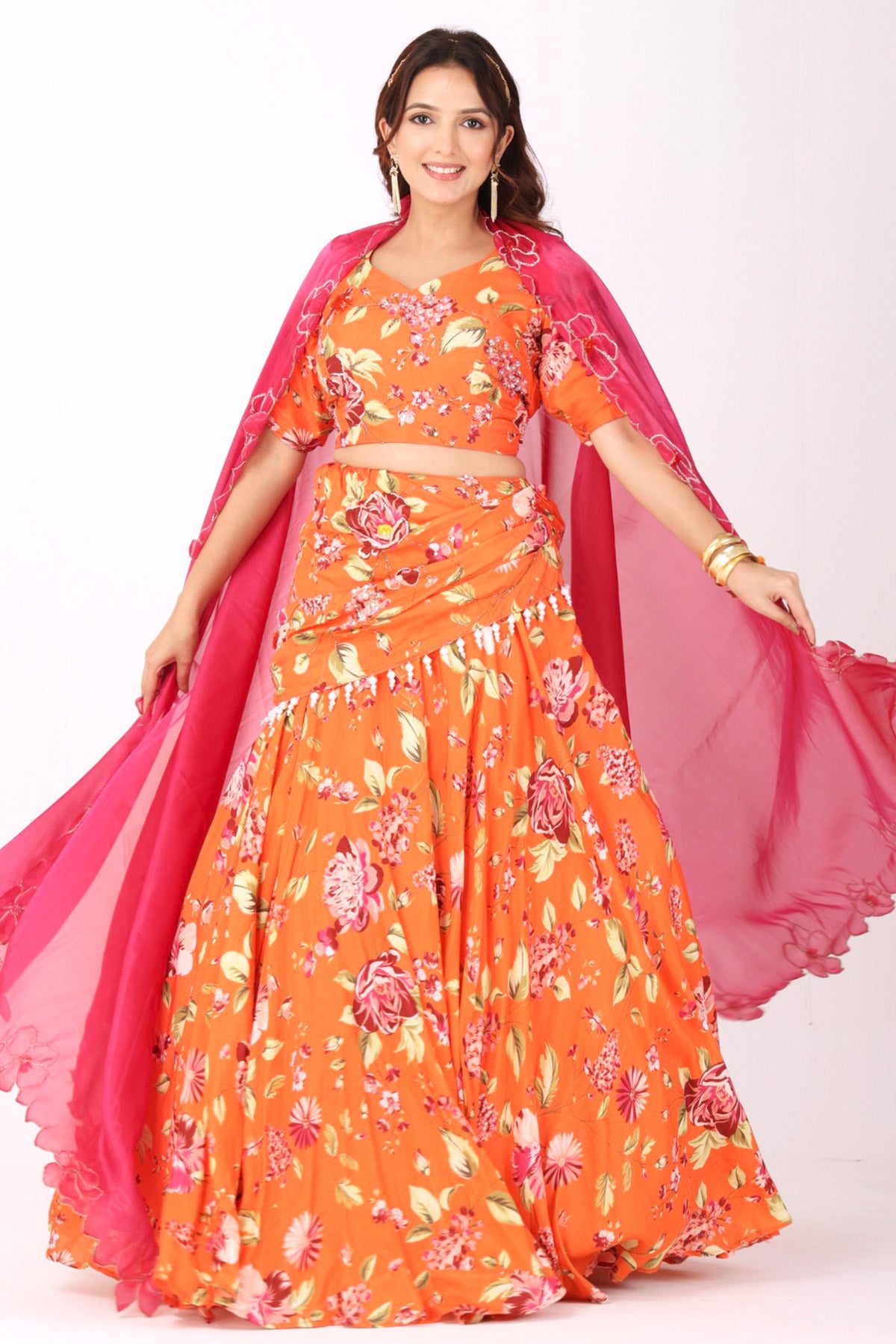 Orange fuchsia silk and organza floral printed lehenga set featuring hand embroidery lehenga with choli, cutdana, pearl, kasab and cut sequins paired with dupatta
