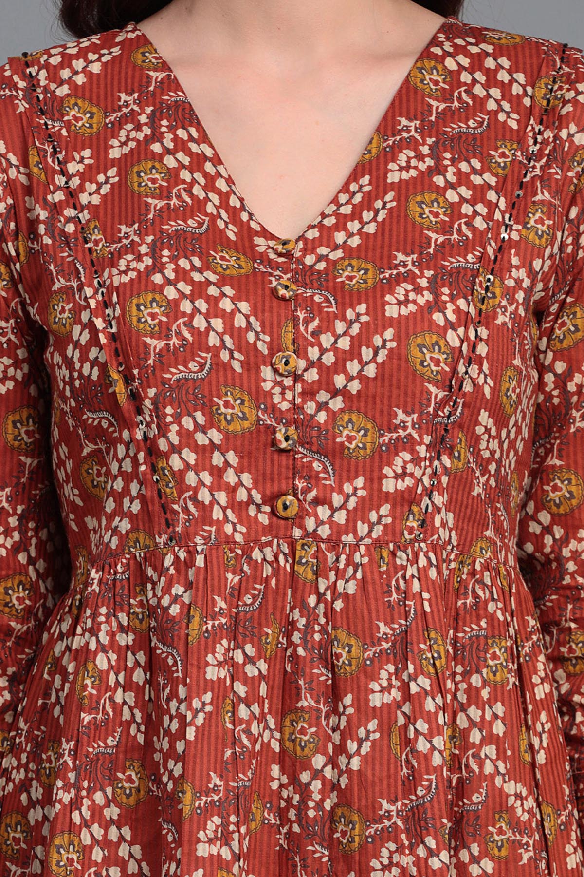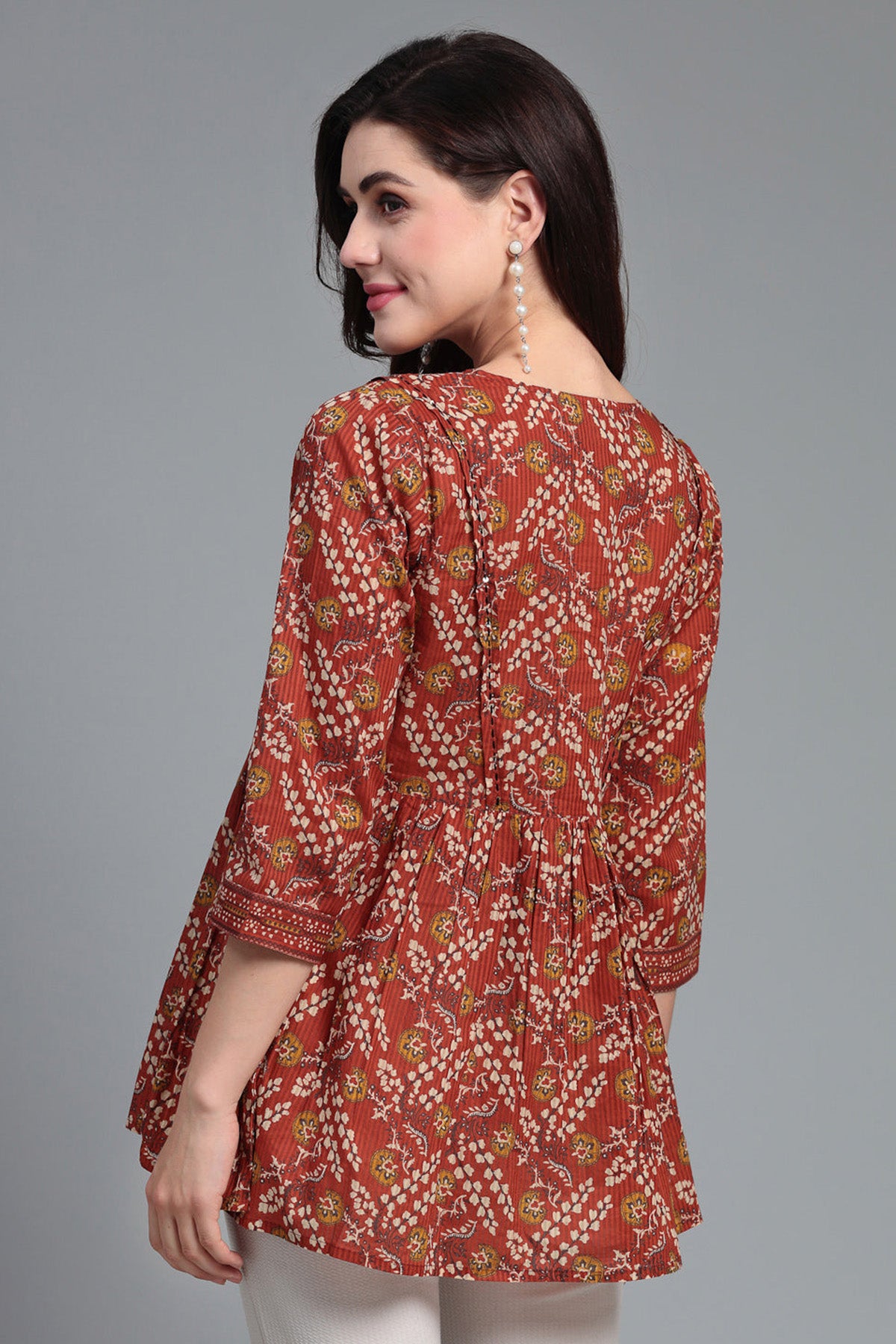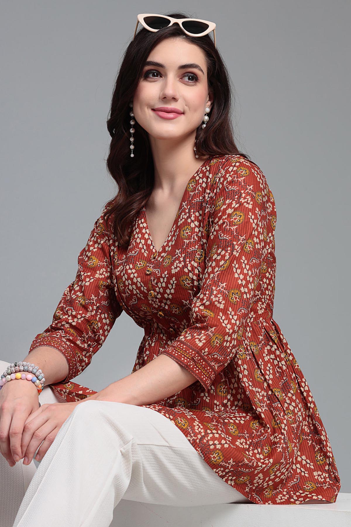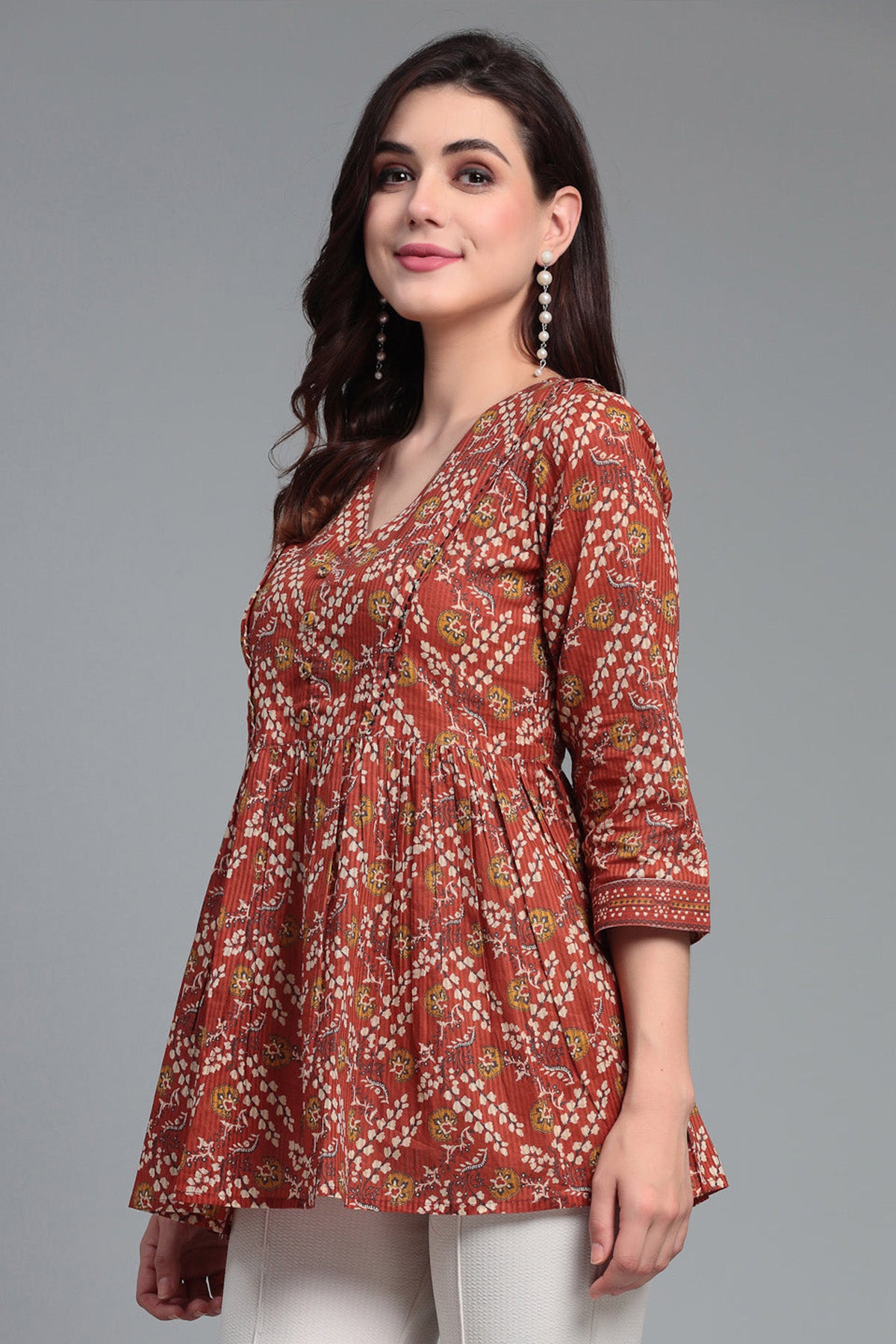 Burnt orange pure cotton floral printed top with gathered waist, V neck, 3/4th sleeves and katha detailed work