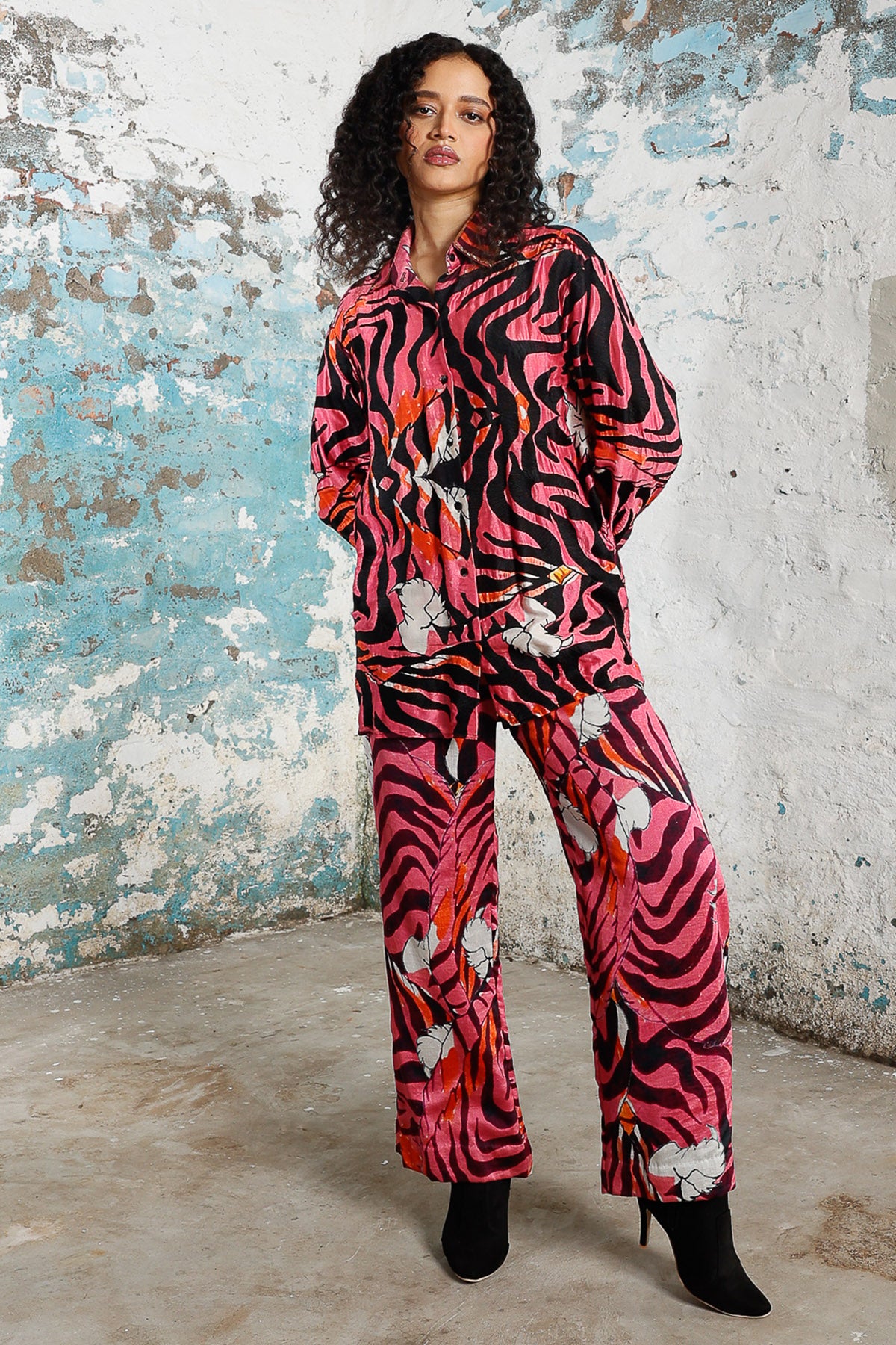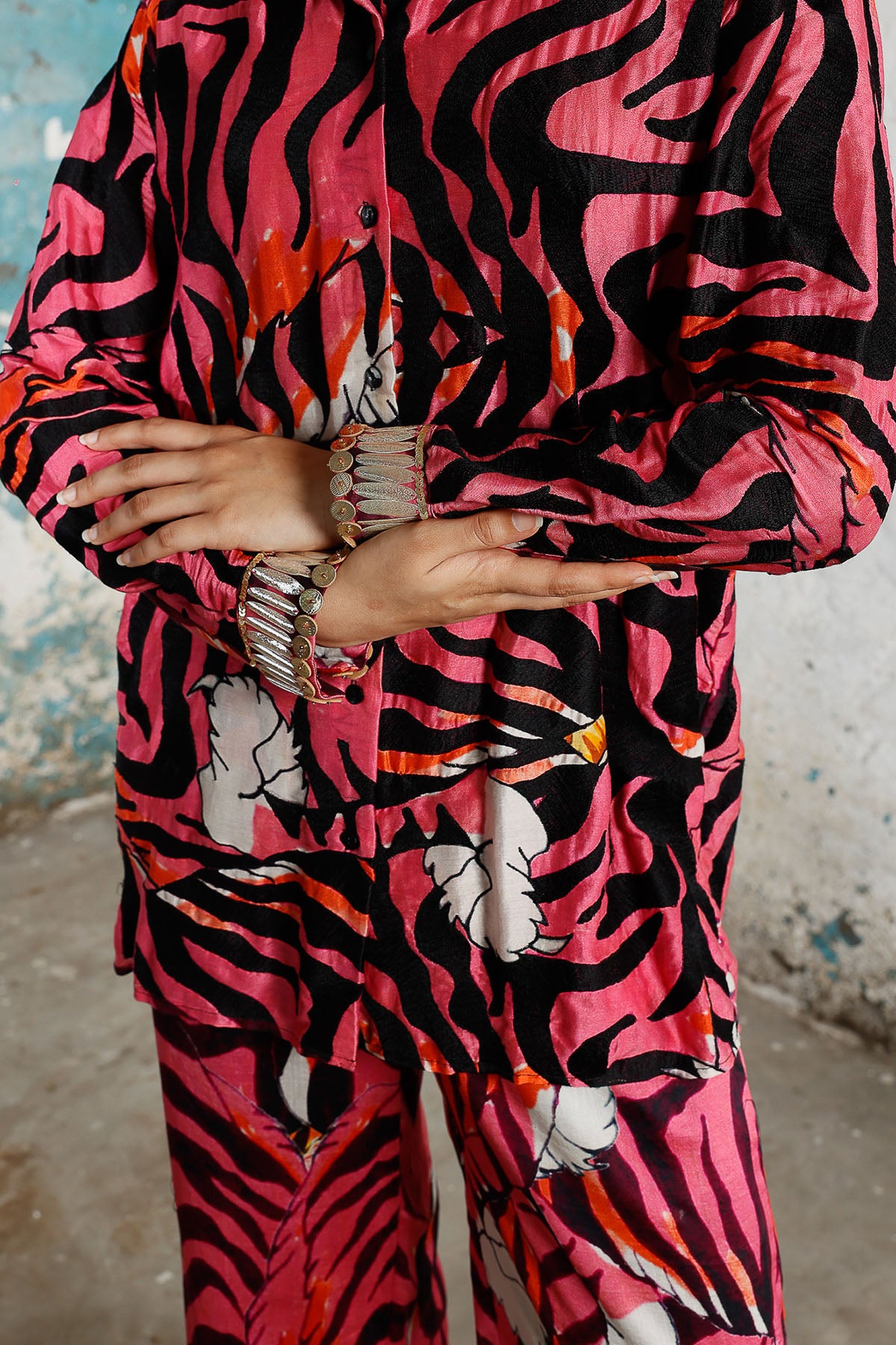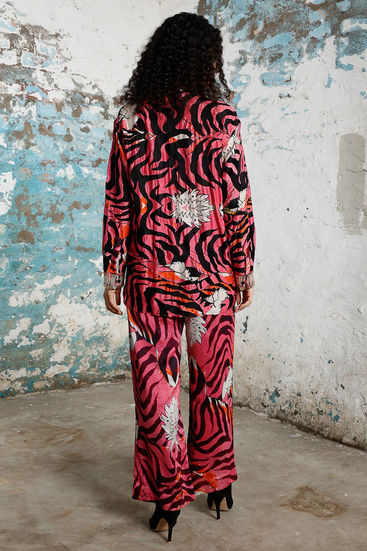 Pink and black banarasi cotton silk printed co-ord set featuring aari hand embroidery shirt with collar, buttons and full sleeves paired with straight pants